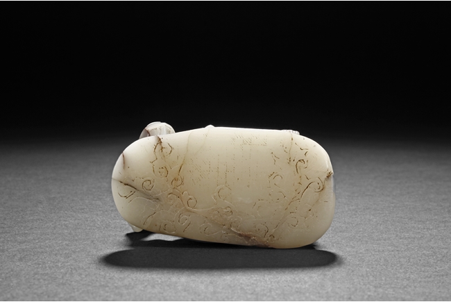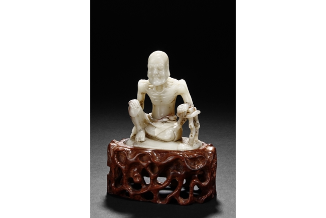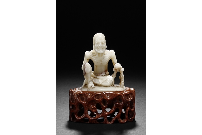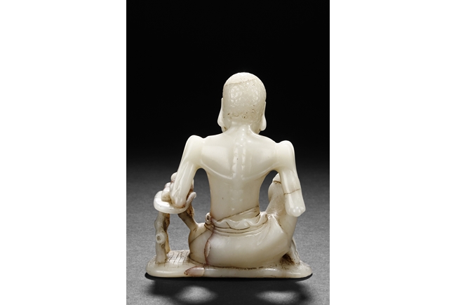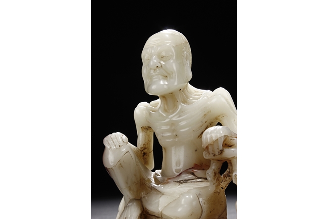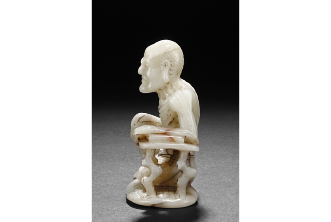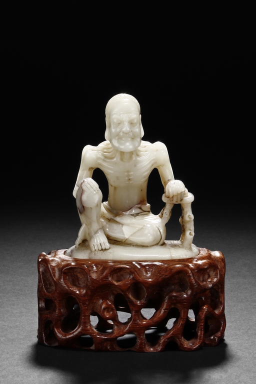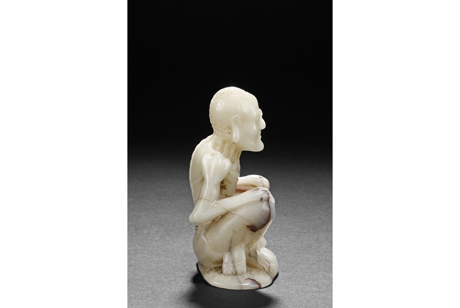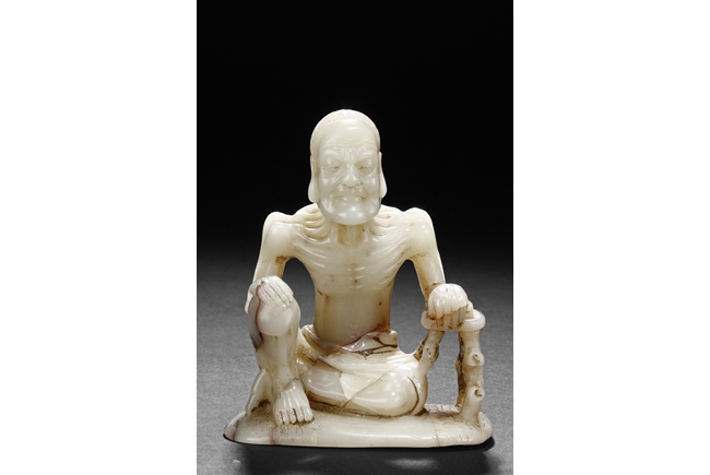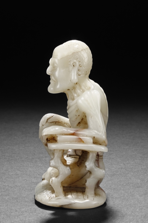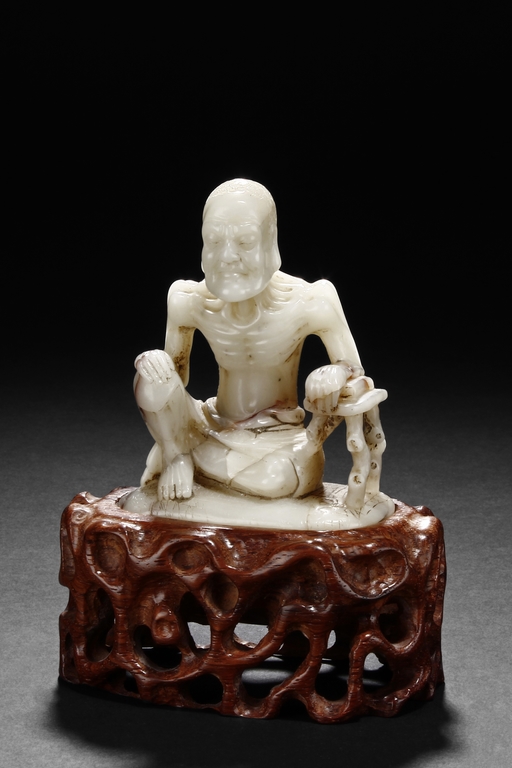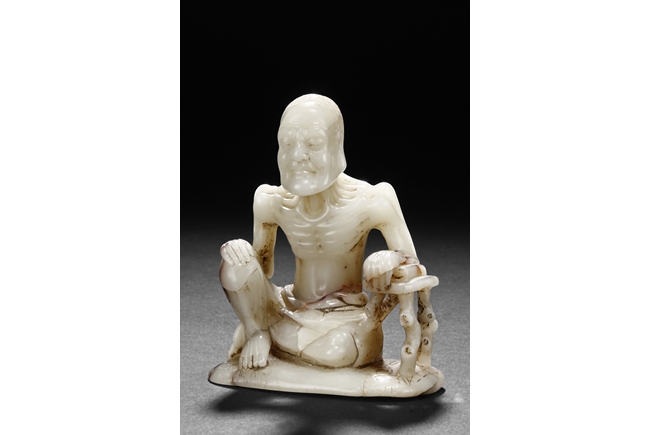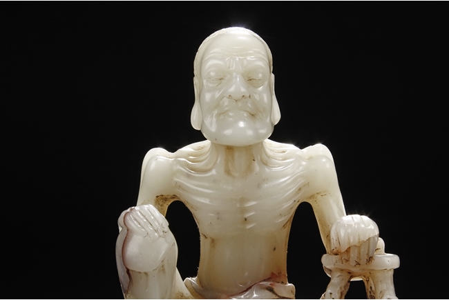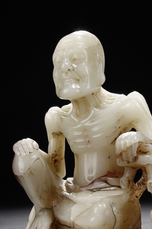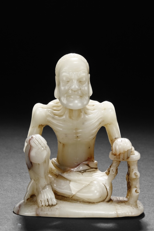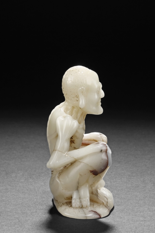 The figure is shown seated with one knee raised with right hand rested on the knee, leaning forward. The emaciated and naked body is finely detailed with skeletal ribs, shoulder blades and spine. The face is shown with calm expression suggestive of mediation, the lower body dressed in robe wrapped loosely to reveal the skeletal legs. The stone is of white tone with russet and reddish veining.