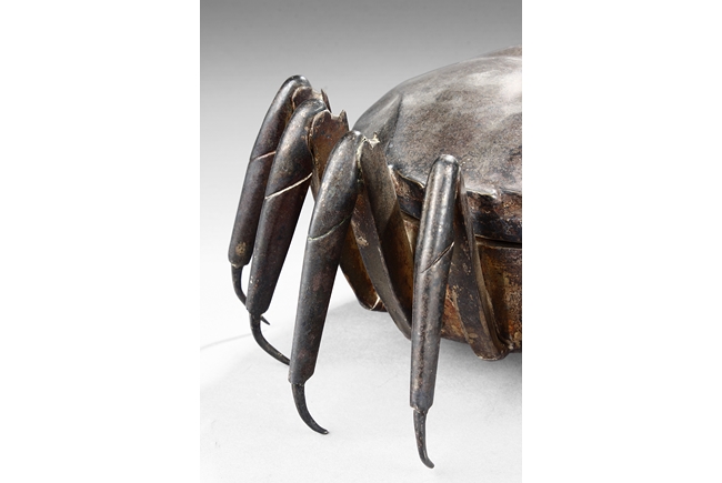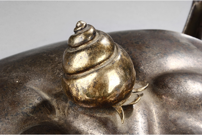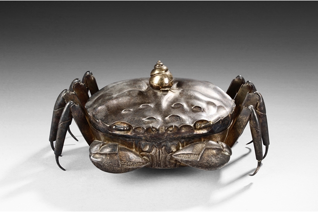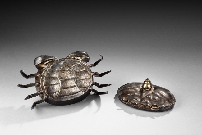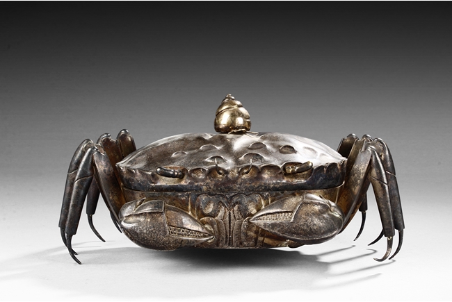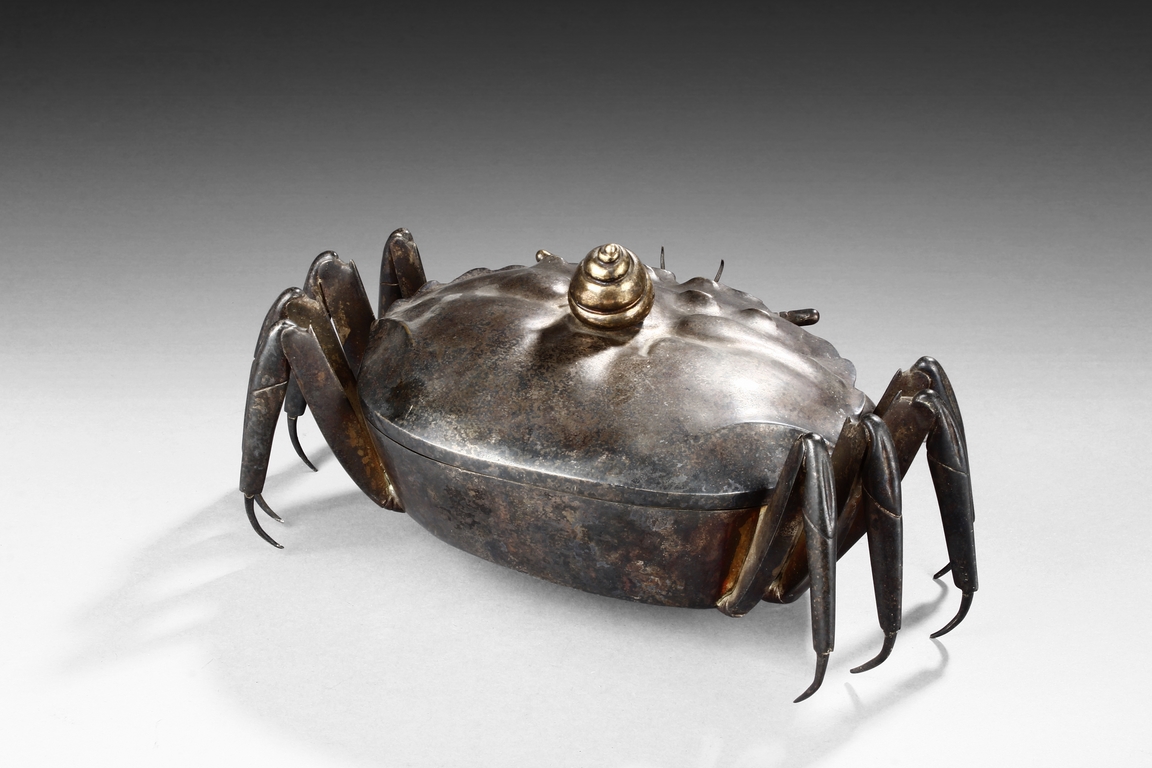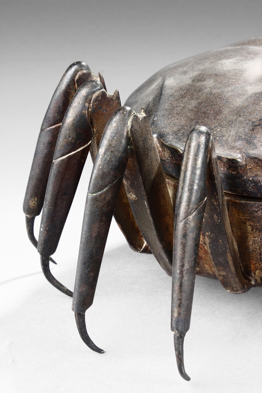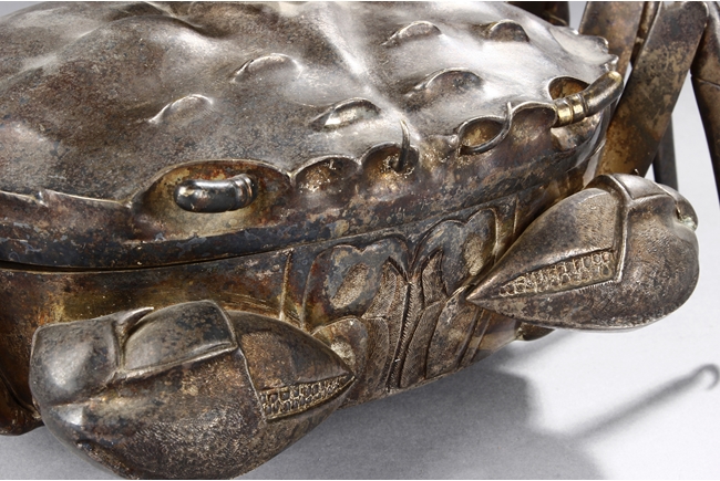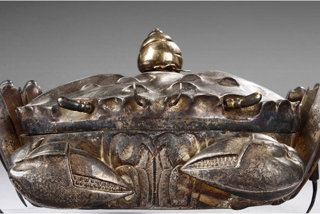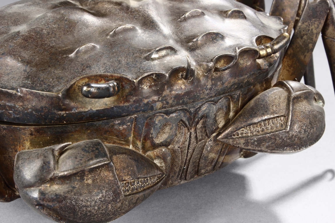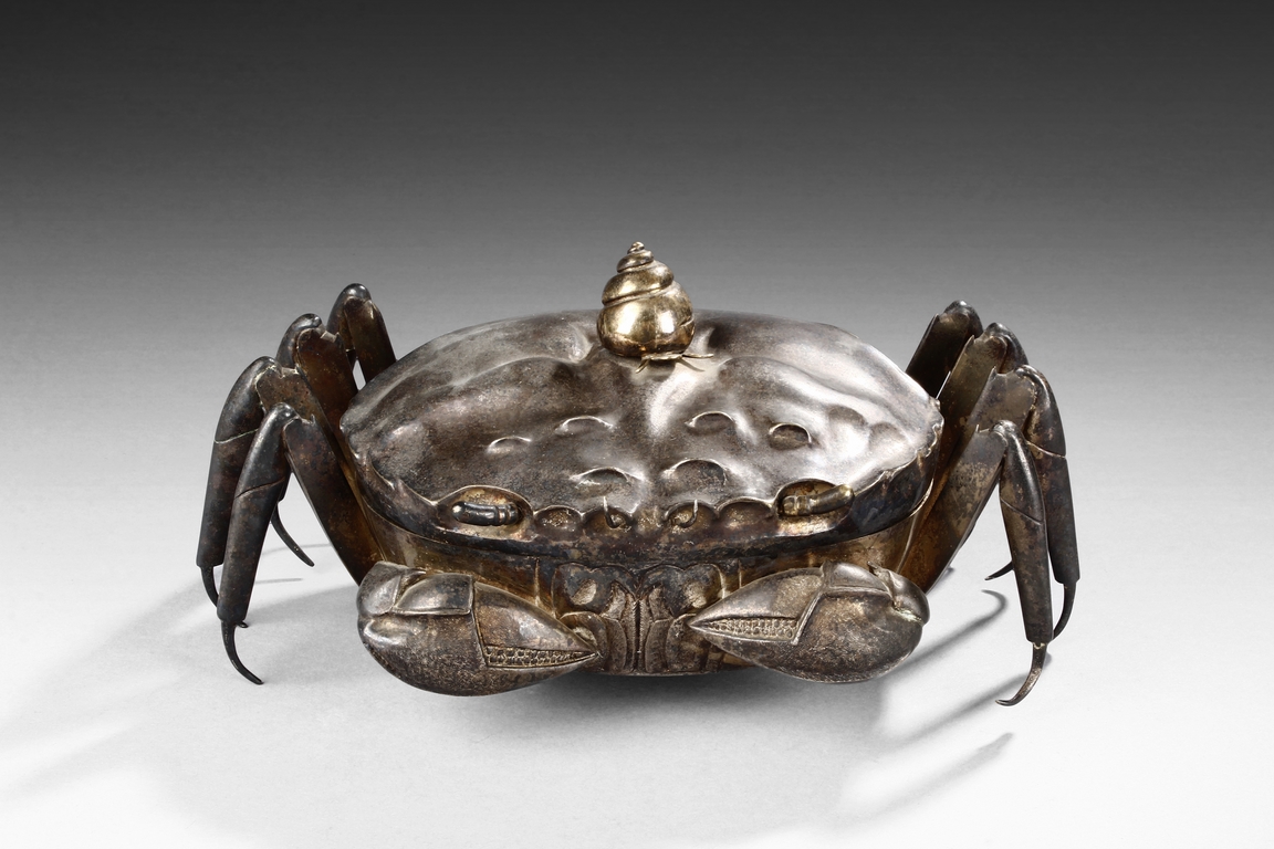 The container is realistically cast in the model of crab, with front claws and four legs on both sides, and topped with a gilt snail-like shell, the body can be detached to reveal the silver interior of the container. Republic period.
