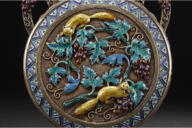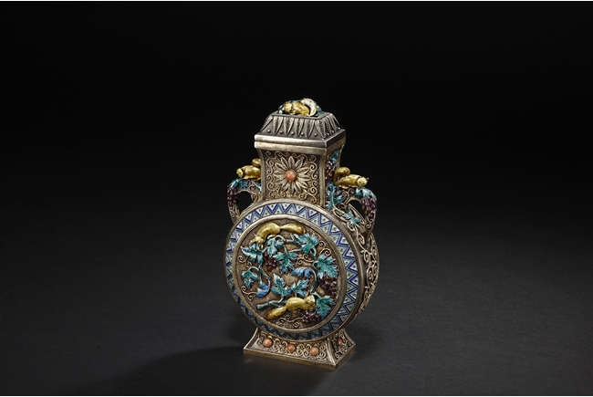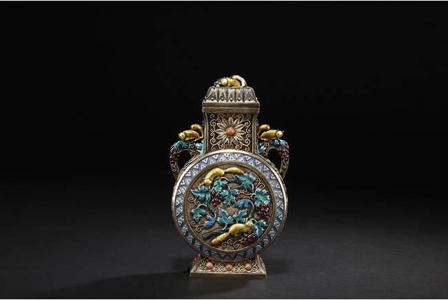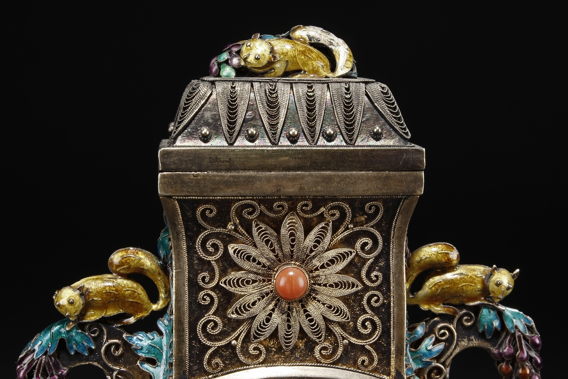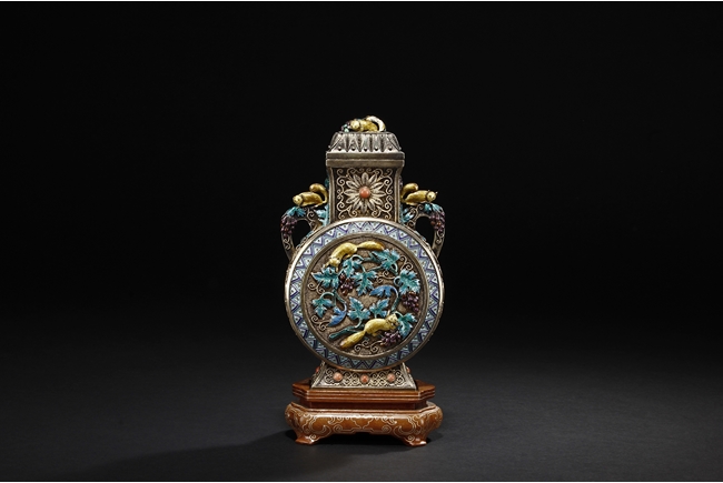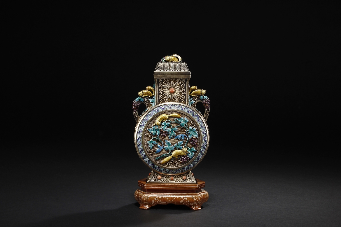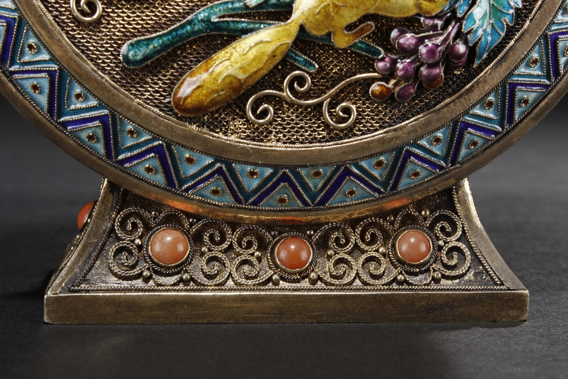 The moon flask has a flattened round body, supported by a curved trapezoid foot, a pair of ear shaped handles, straight and rectangular neck, and domed lid, decorated with coral beads on the body, with a theme of squirrels on berry trees, enameled in gold, green, blue, and dark red colors. Includes wooden stand. Republic period.