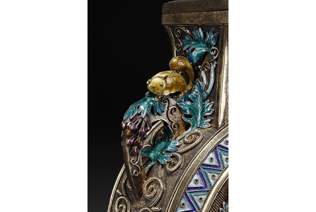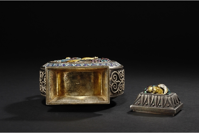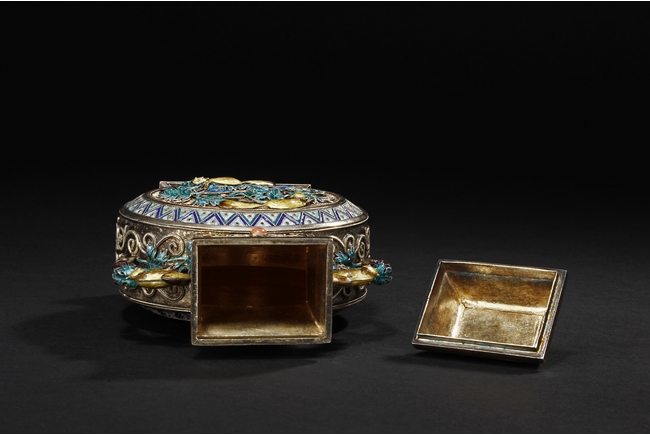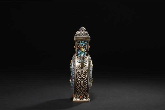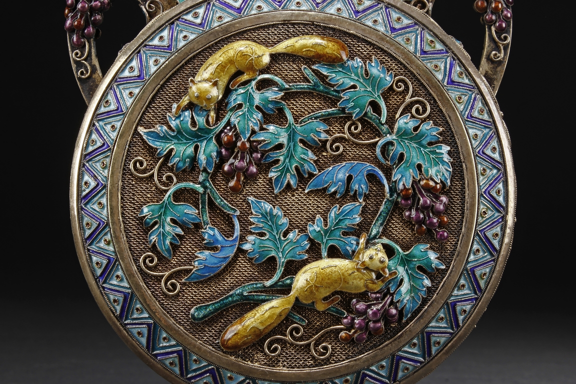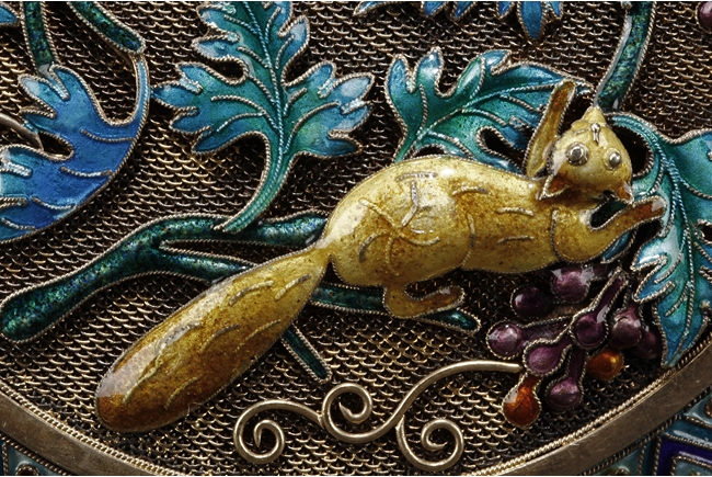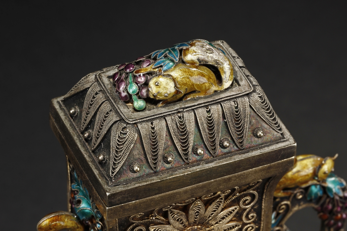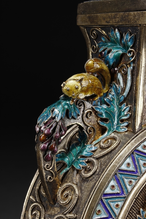 The moon flask has a flattened round body, supported by a curved trapezoid foot, a pair of ear shaped handles, straight and rectangular neck, and domed lid, decorated with coral beads on the body, with a theme of squirrels on berry trees, enameled in gold, green, blue, and dark red colors. Includes wooden stand. Republic period.
