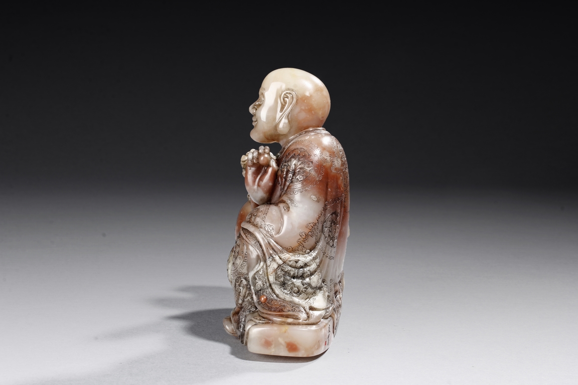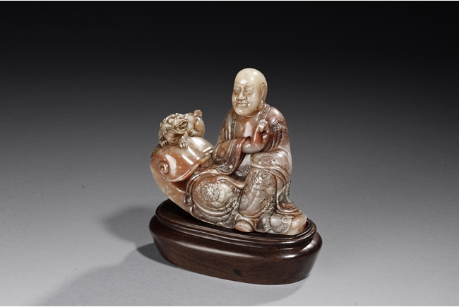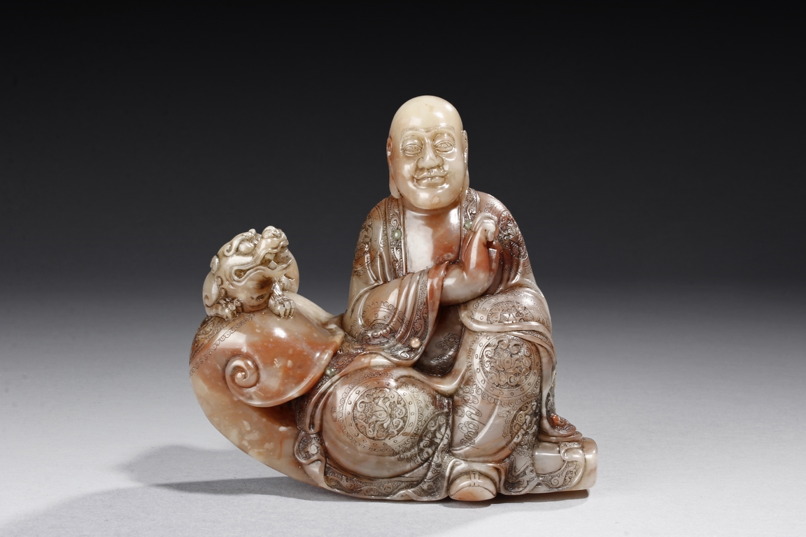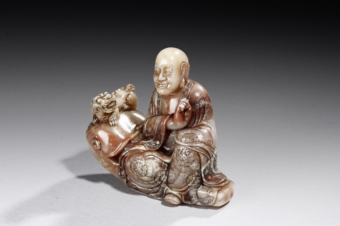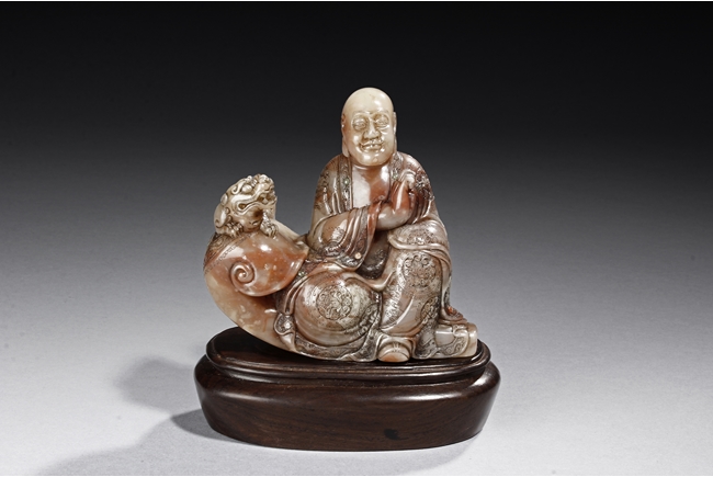 The arhat Vajraputra is seated on the ground, with a small lion cub on besides him, with serene expression and dressed in decorative robes, the stone is of light red and white color. Republic period.