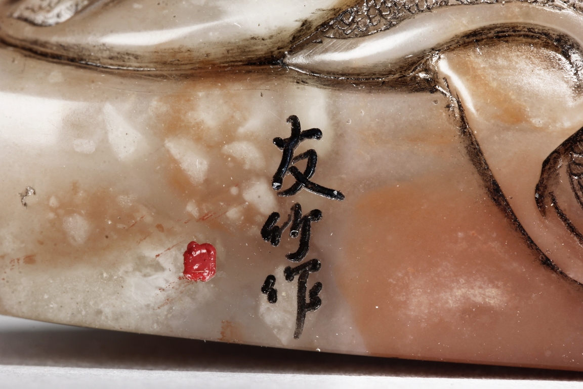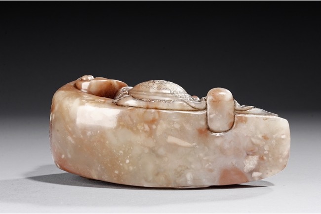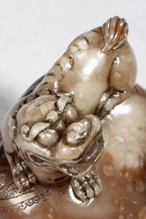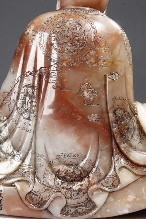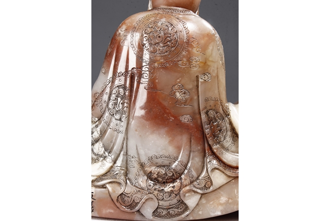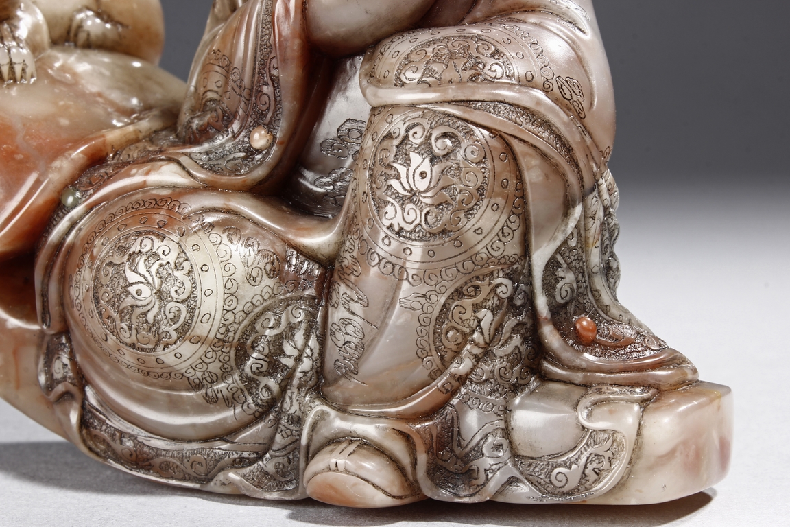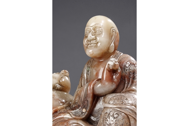 The arhat Vajraputra is seated on the ground, with a small lion cub on besides him, with serene expression and dressed in decorative robes, the stone is of light red and white color. Republic period.