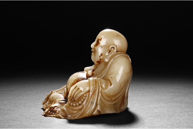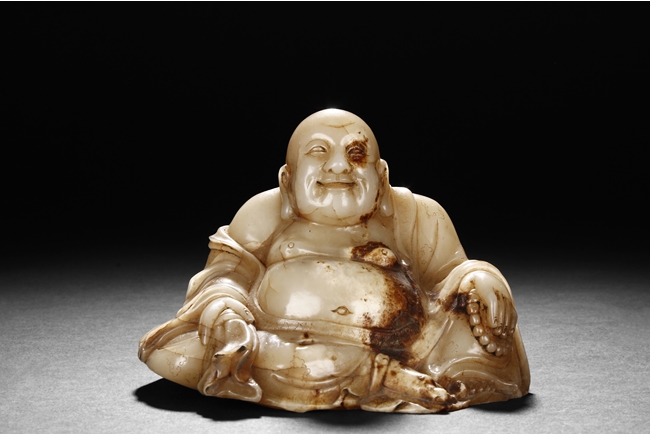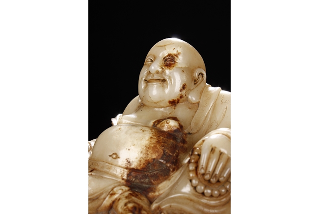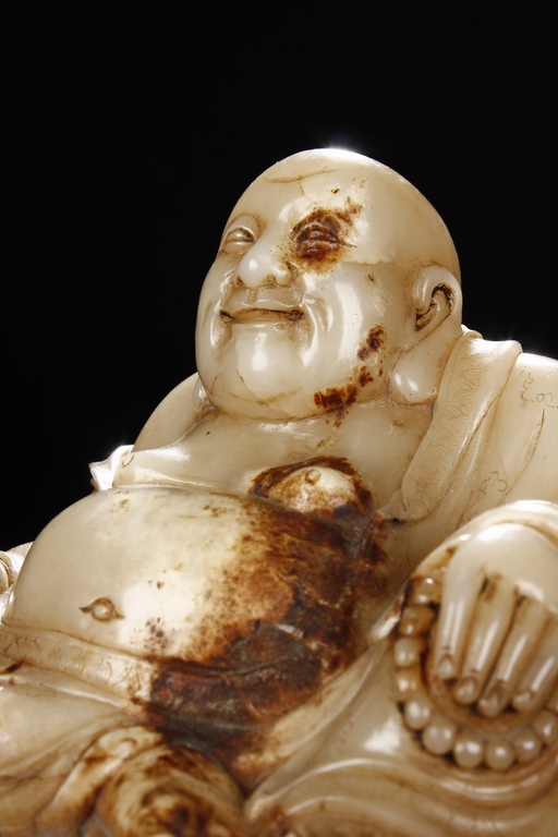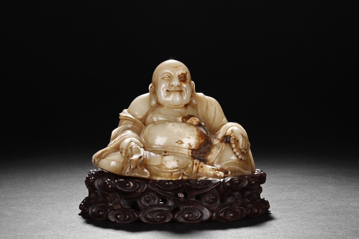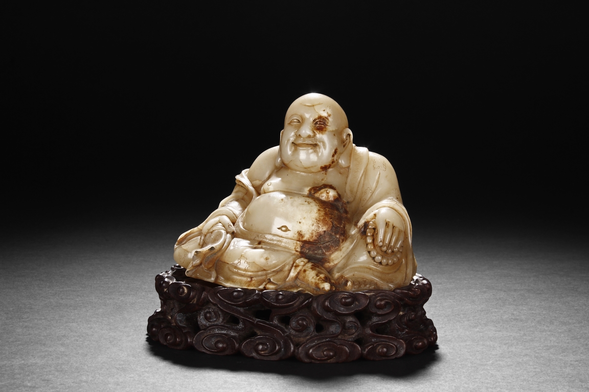 The Maitreya Buddha seated with one foot slightly raised and the other tucked inwards, the right hand holding his signature sack, and left hand holding prayer beads, dressed in open robes, with hearty smile and serene expression, all on top of a carved wooden stand. The stone is of white and russet color. Republic period.