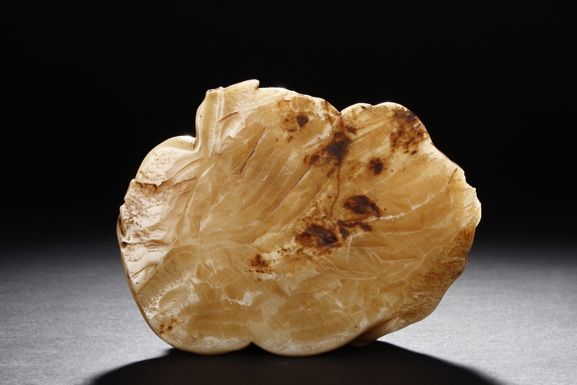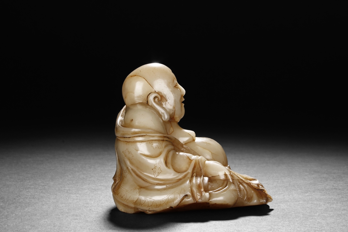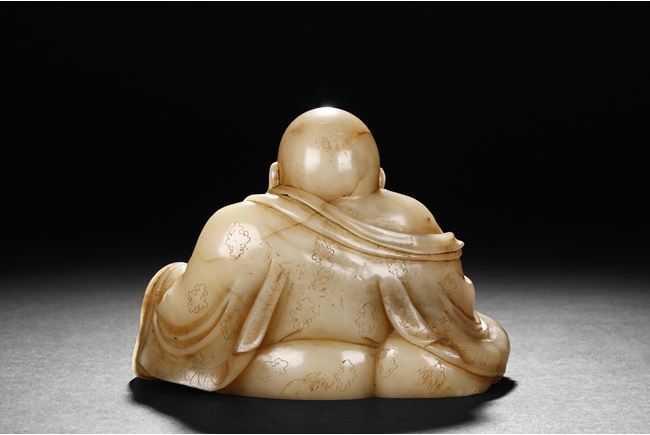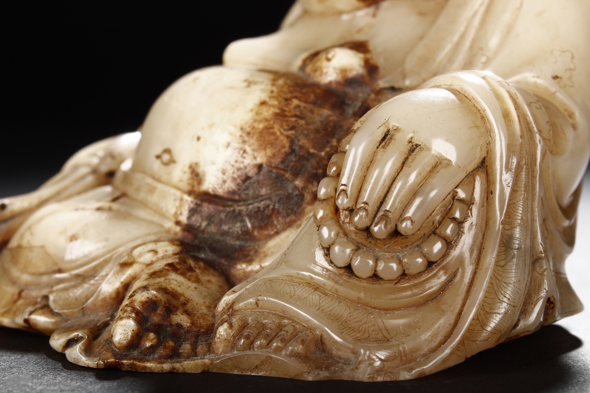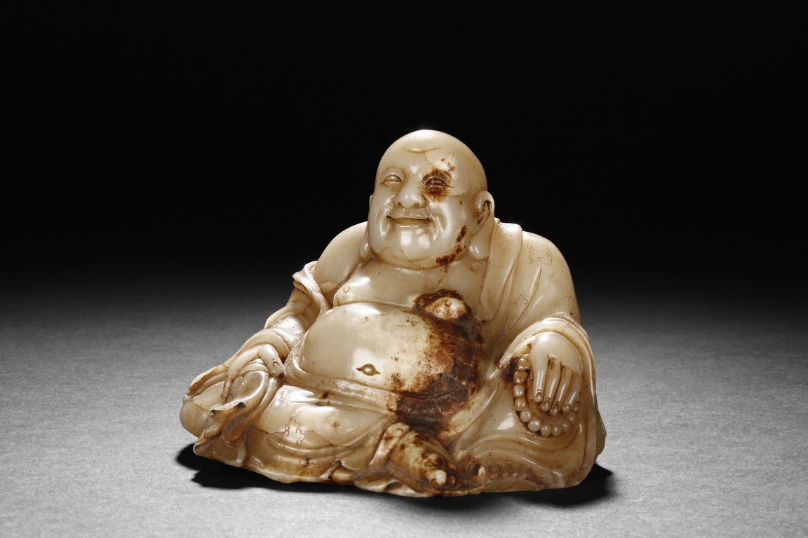 The Maitreya Buddha seated with one foot slightly raised and the other tucked inwards, the right hand holding his signature sack, and left hand holding prayer beads, dressed in open robes, with hearty smile and serene expression, all on top of a carved wooden stand. The stone is of white and russet color. Republic period.