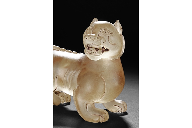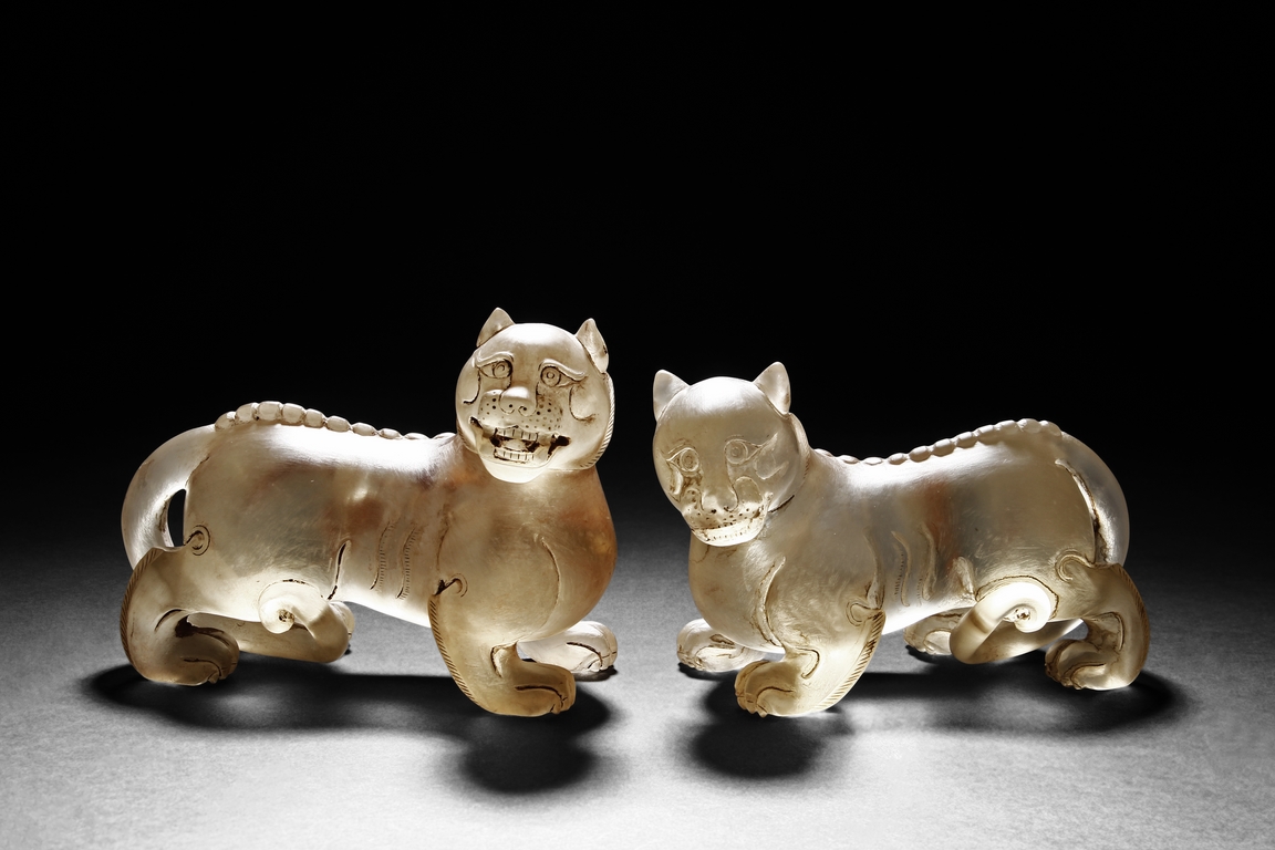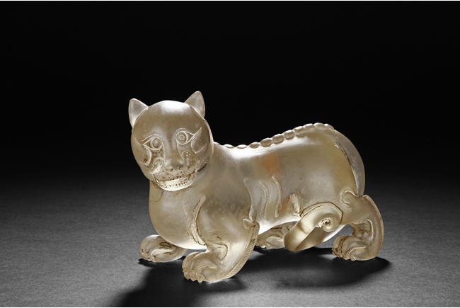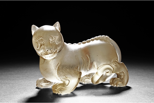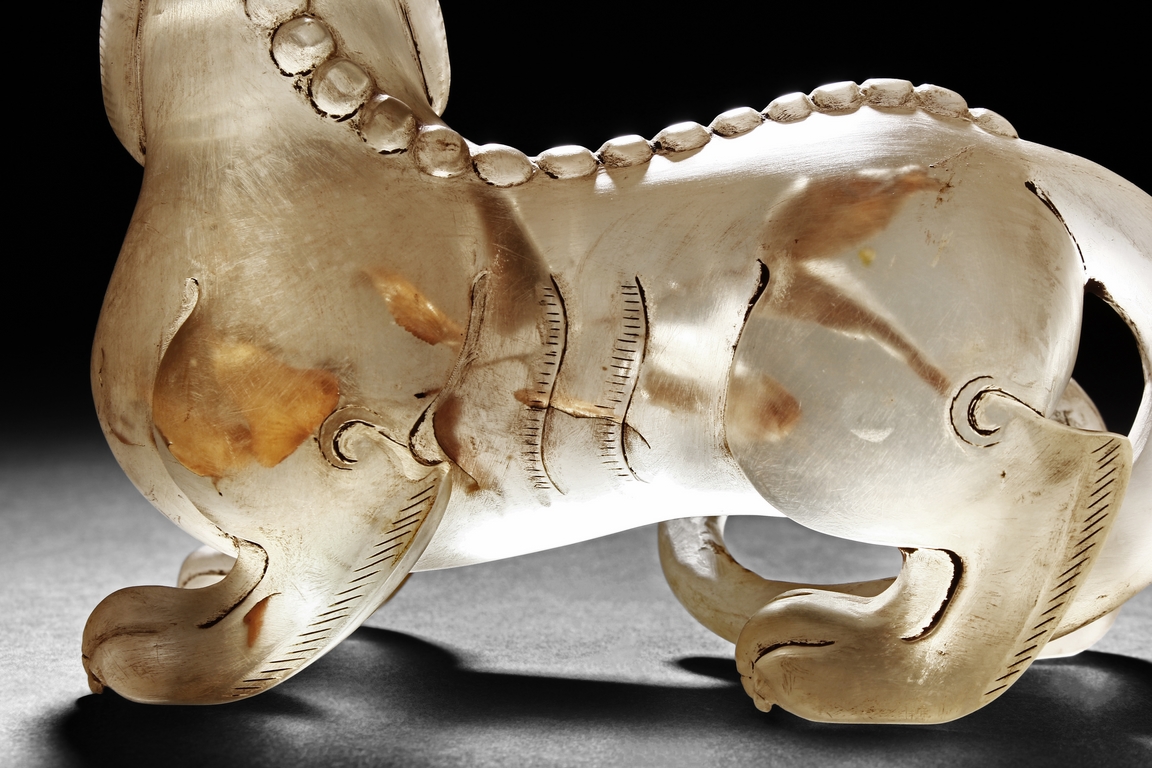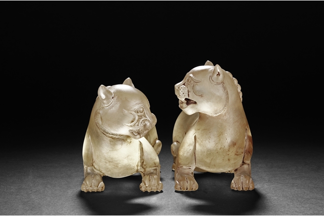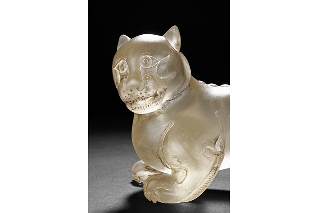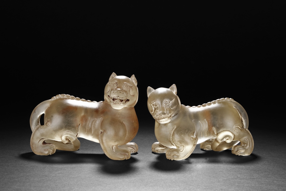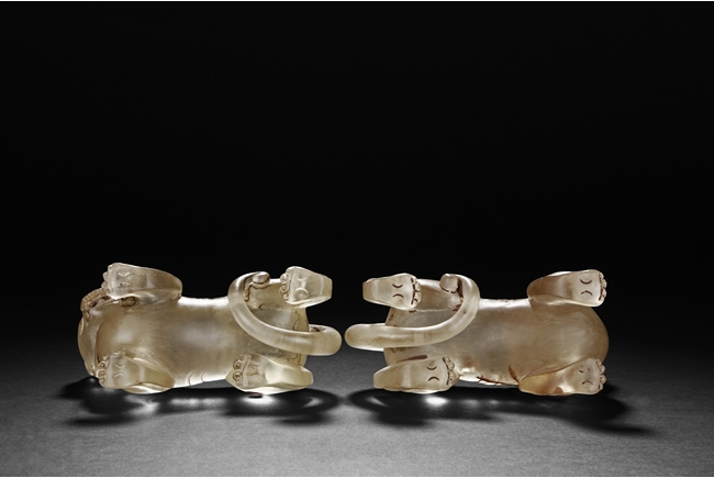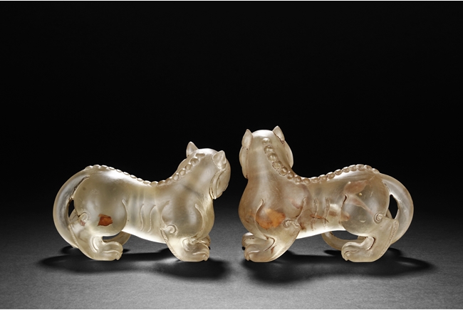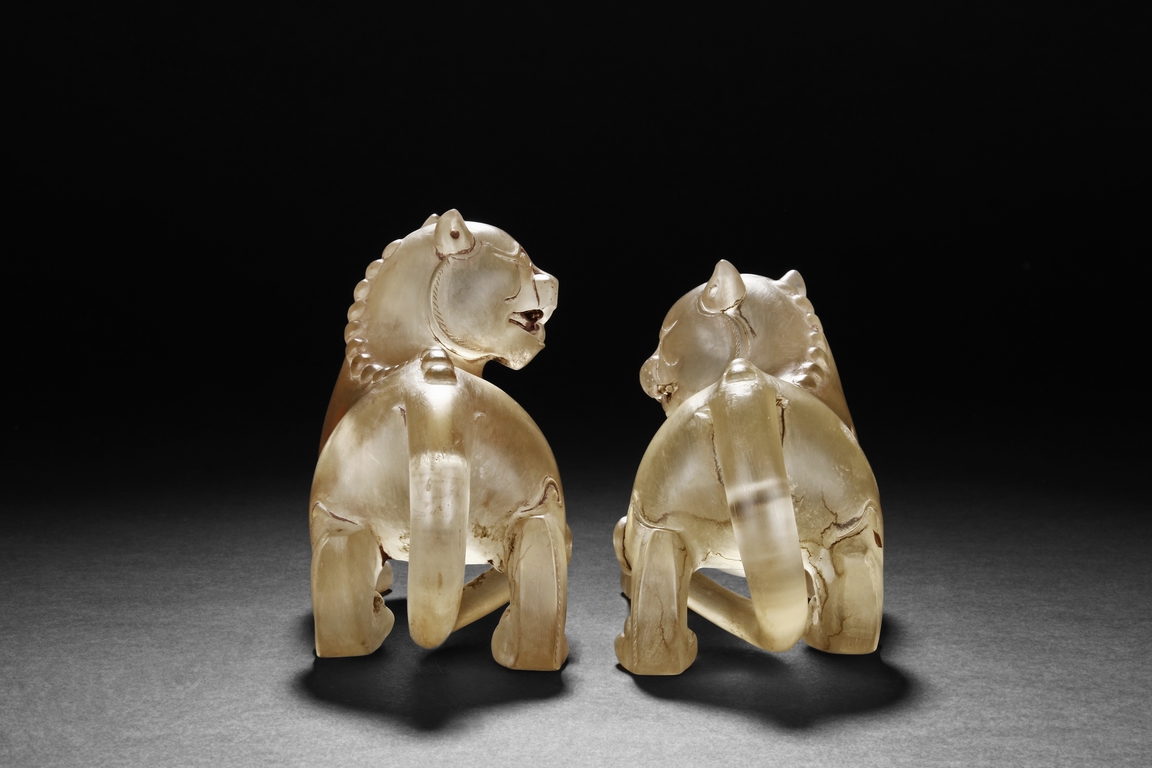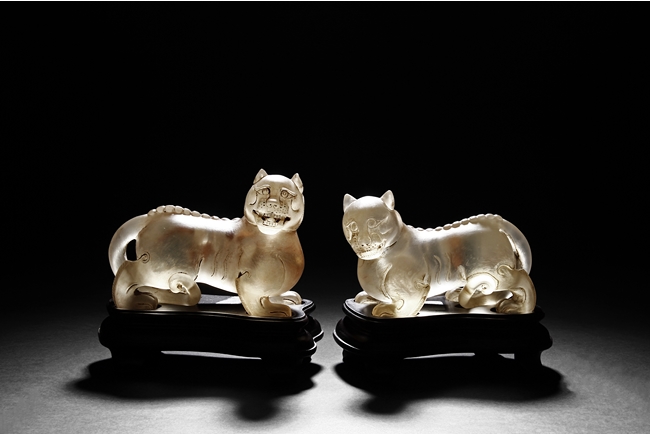 The figures depict two mythical beasts standing with tail under their body, head turned sideways, on top of wooden stand. The exterior is of smoky color, with translucency.