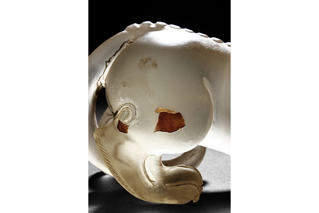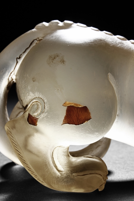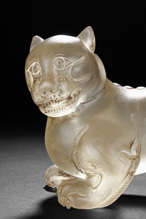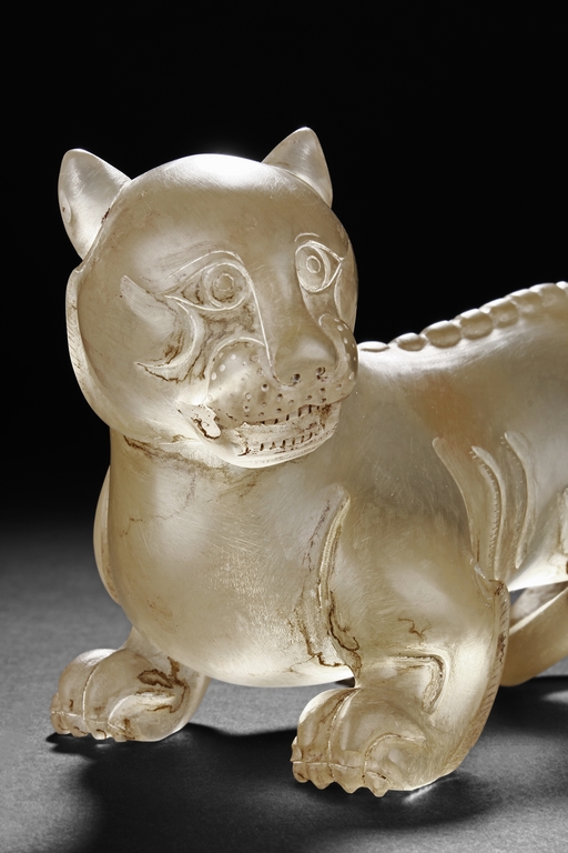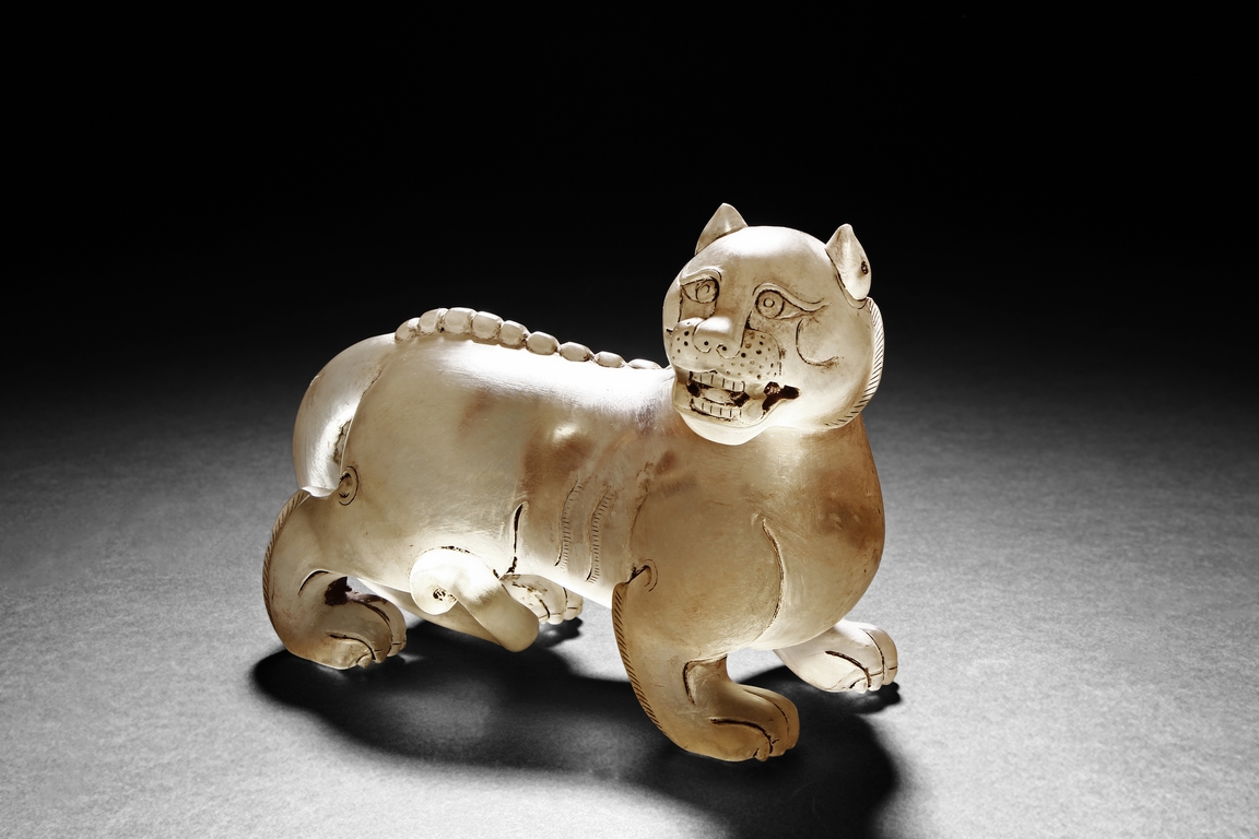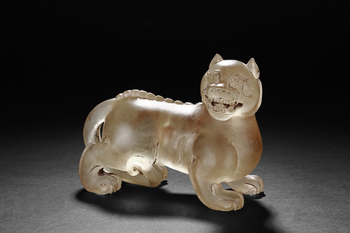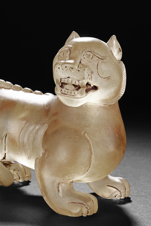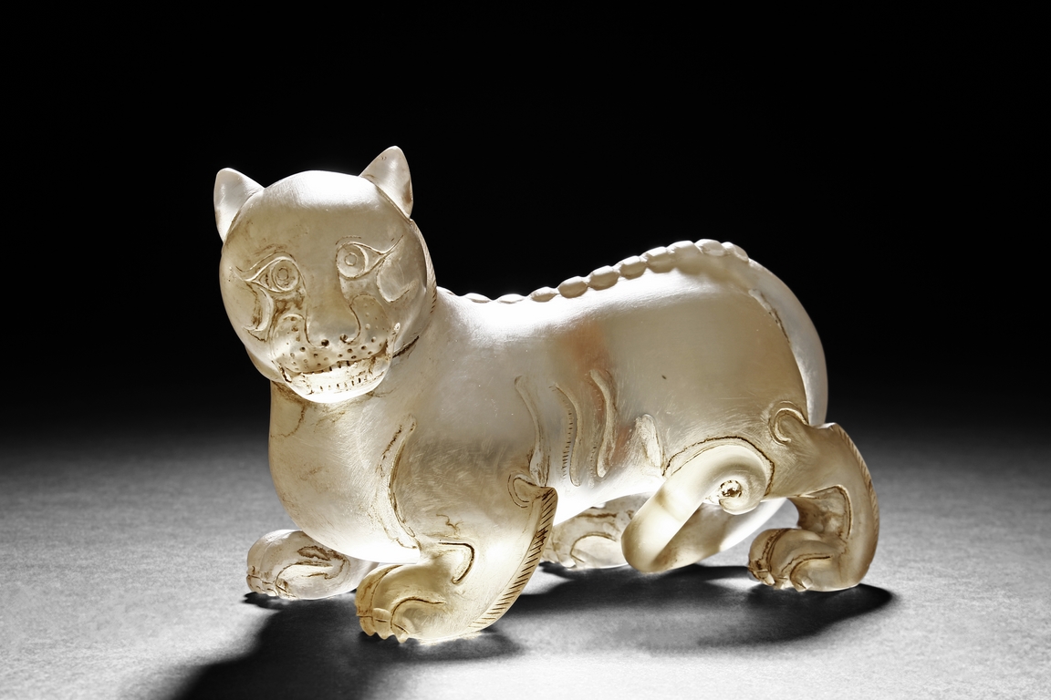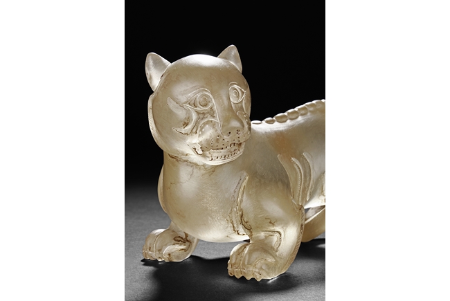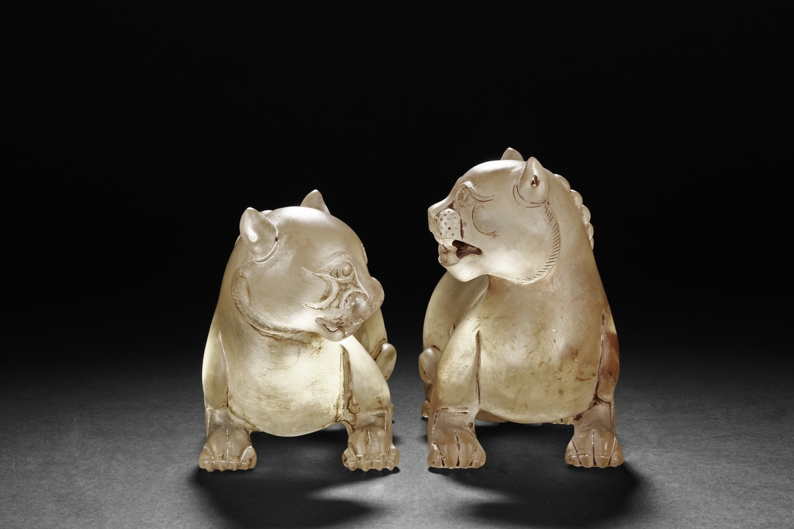 The figures depict two mythical beasts standing with tail under their body, head turned sideways, on top of wooden stand. The exterior is of smoky color, with translucency.