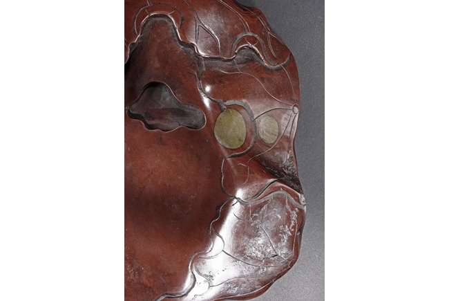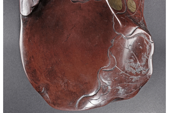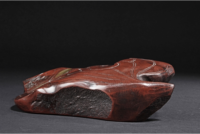 The ink stone in the form of lotus leaves with decorative fish, the center and sides reserved for ink well, the color of brownish-red, with parts of it showing natural Chengni stone grains. Qing Dynasty period.