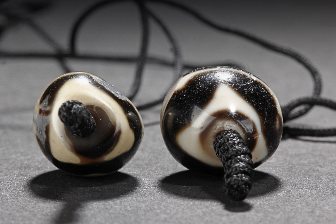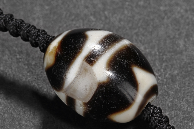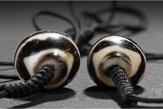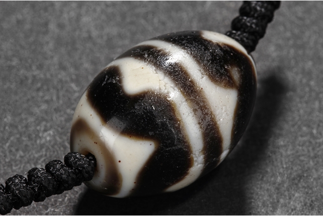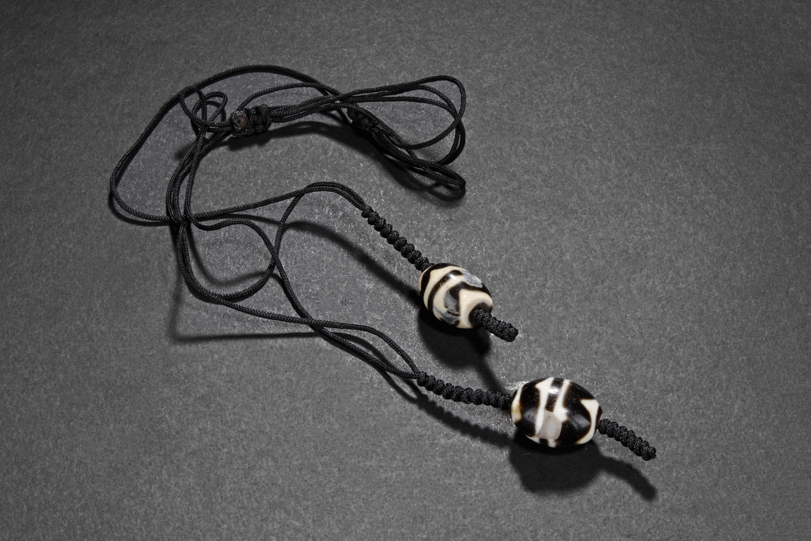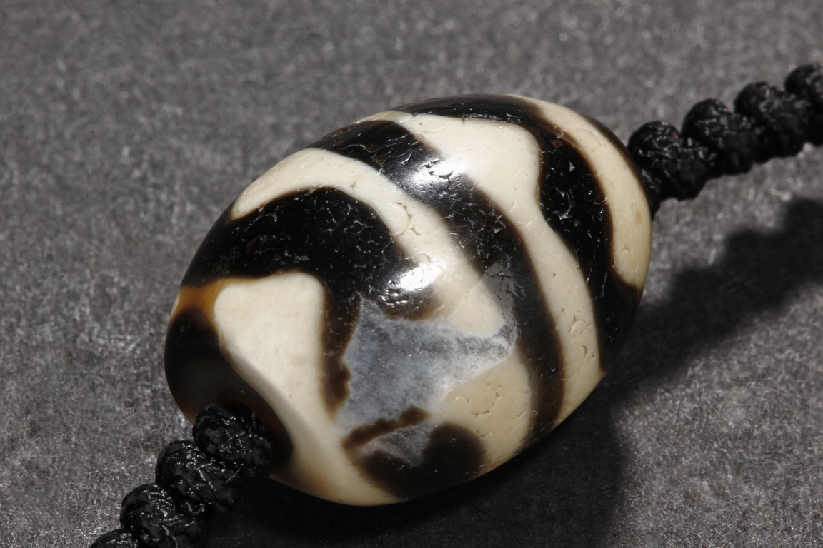 Known for its resemblance to the shape of tiger teeth, the current tiger-teeth Dzi bead exhibits fine and smooth texture, clear veins, and excellent contrast between black and white strips. Under different light sources, the surface exhibits greasy luster and weathered cracks. A closer look at the current piece also shows the various 'cinnabar spots' randomly distributed upon the surface. With the characteristics above in addition to the fact that it comes as a pair, the current piece is considered to be one of the finest and rarest Dzi beads.