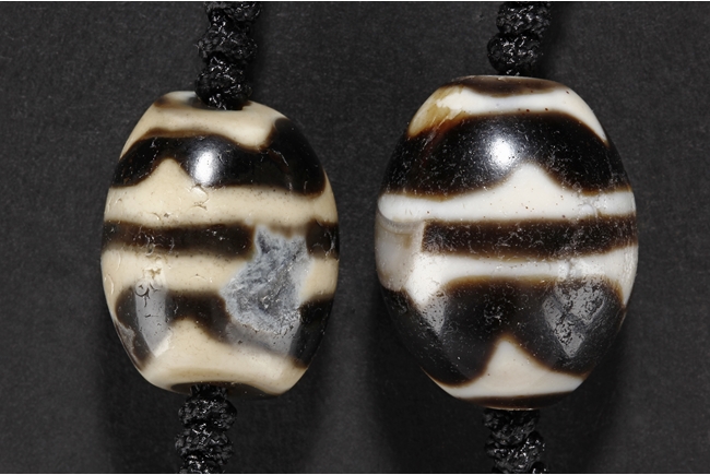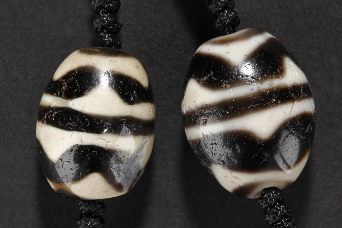 Each Dzi bead is of short cylindrical egg-like form. The exterior bears the natural 'tiger teeth' pattern of alternating white and brownish black bands, with numerous tiny red 'blood spots' distributed unevenly on the surface, and 'fish scale'-like patterns throughout. Ming Dynasty period.