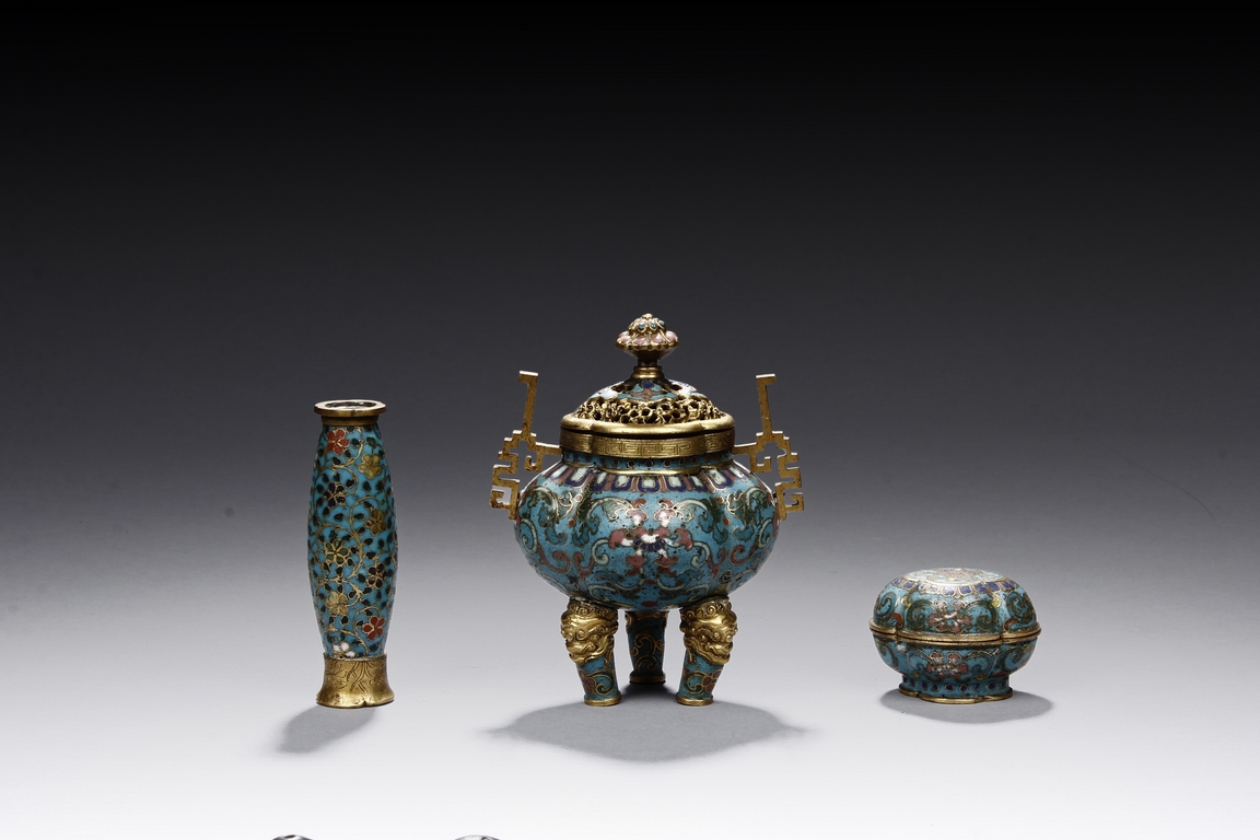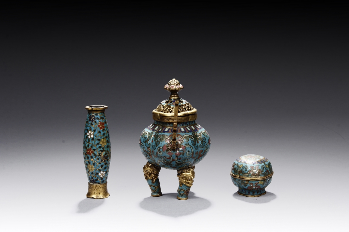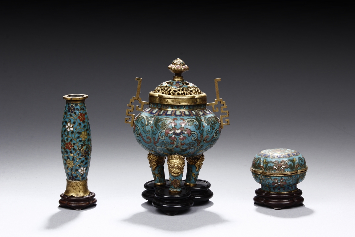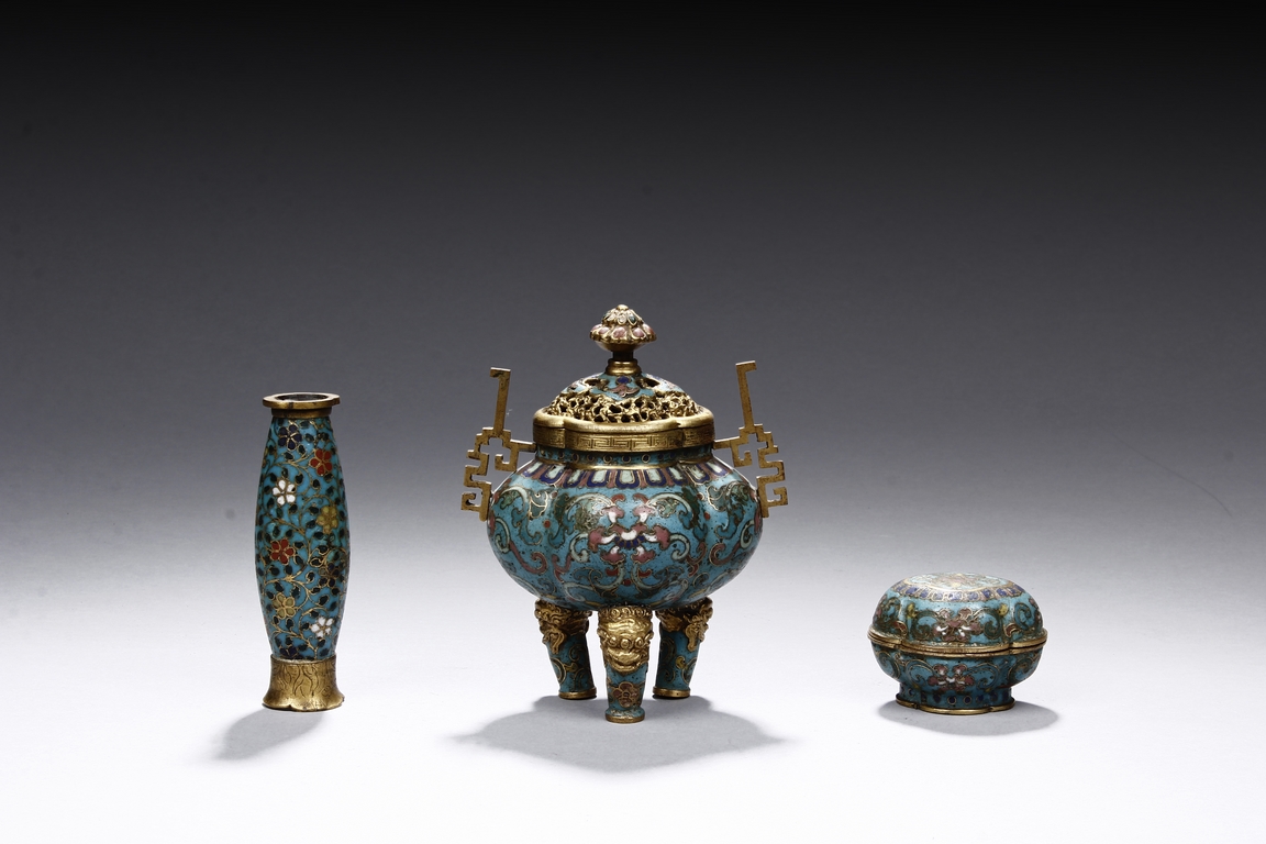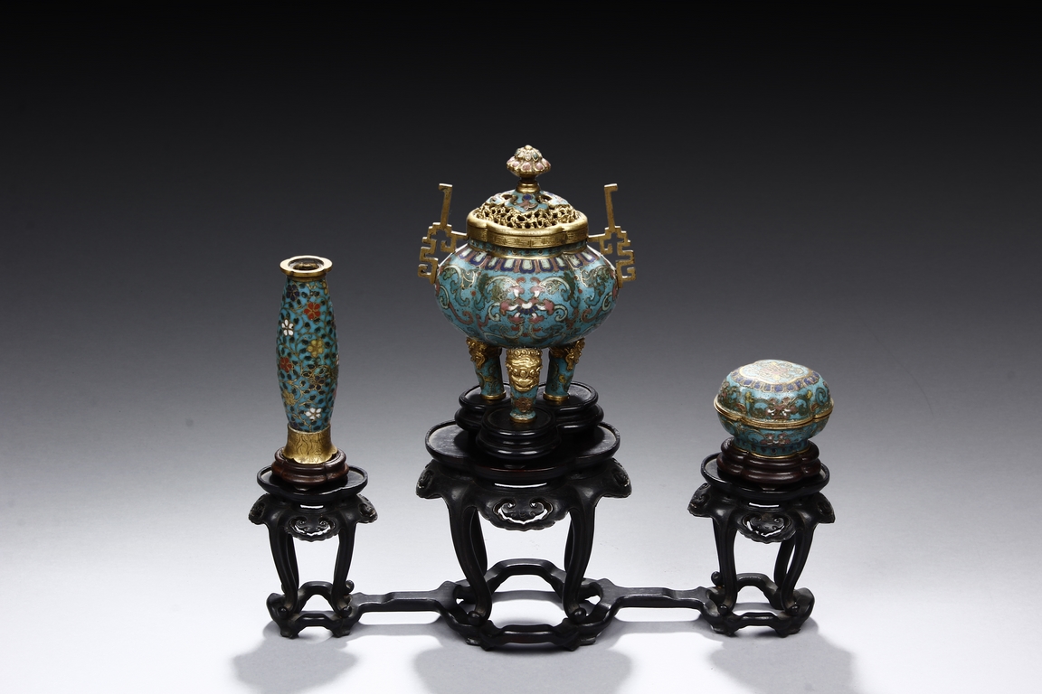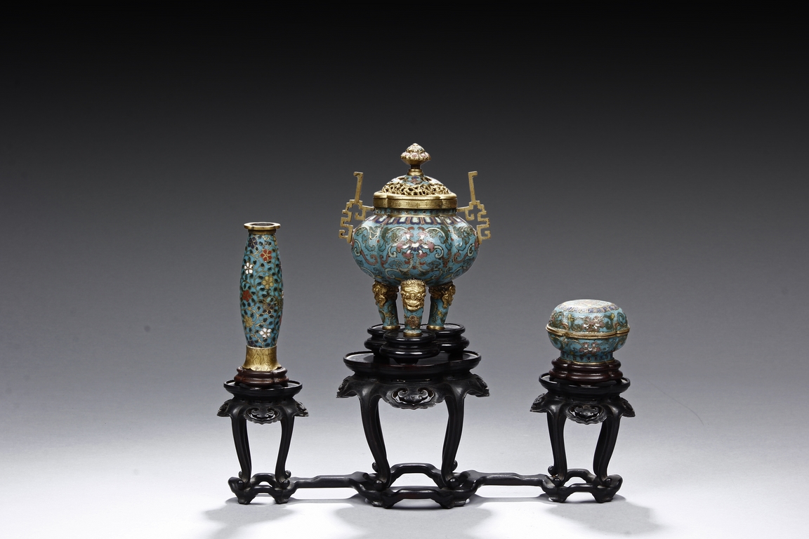 This incense garniture set comprises of three pierces, including a tripod censer of compressed and lobed body, supported on three stout feet with gilded mythical beast mask, the body enamelled all over with elaborate floral scroll on turquoise ground, the cover pierced with gilt-metal openwork and surmounted by a gilt-metal finial above key-fret rim; the second a lobed shaped box decorated all over with floral scroll, the top with similar motif enclosed within a blue enamelled pedestal band; the third a slender and lobed shaped vase raised on a spreading gilt-metal foot ring with incised decoration, the body enamelled with elaborate floral scroll motif, the rim gilded. Including original wood stand and wood box. Qing Qianlong Dynasty period.