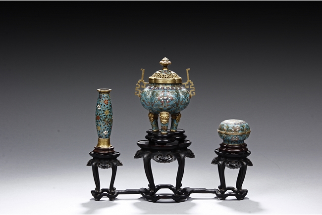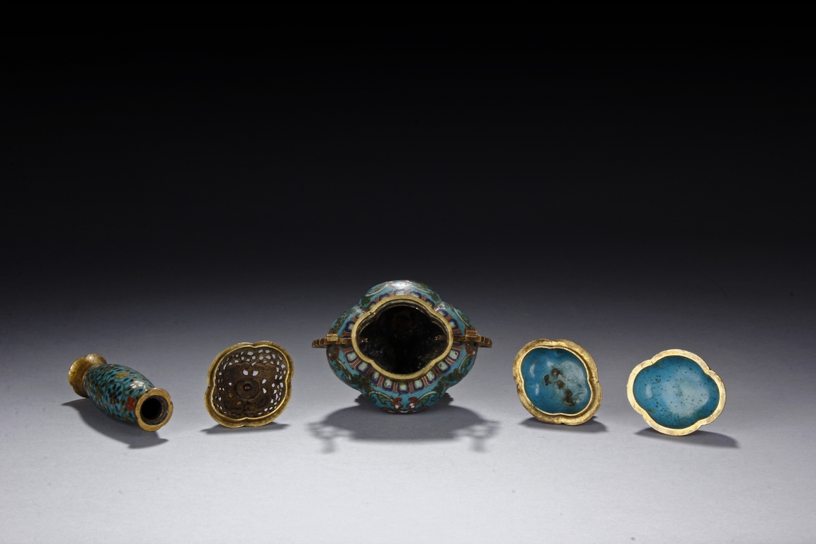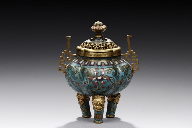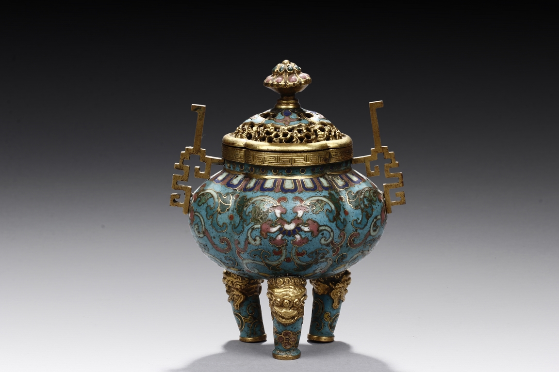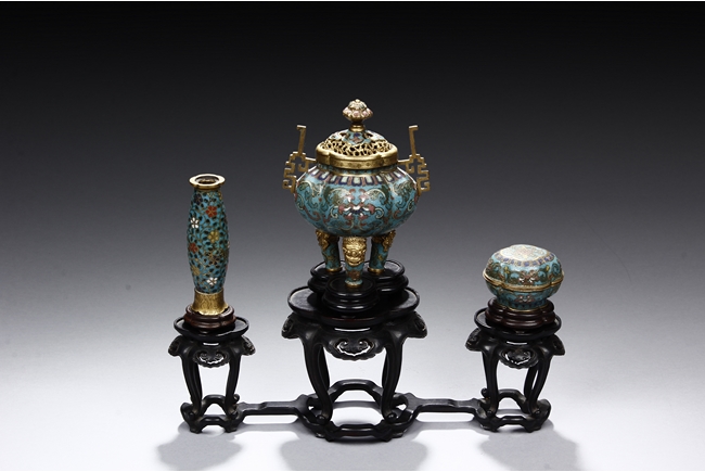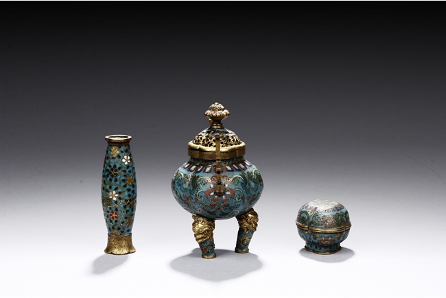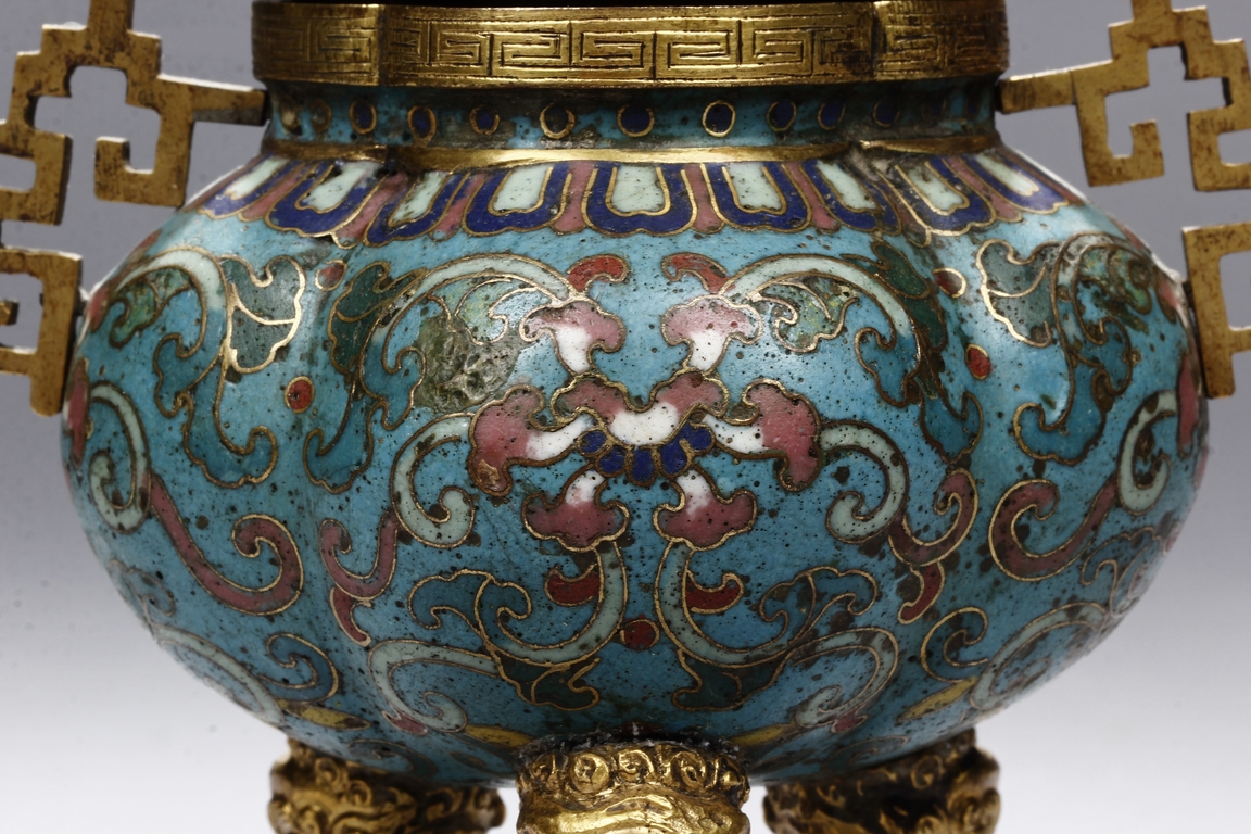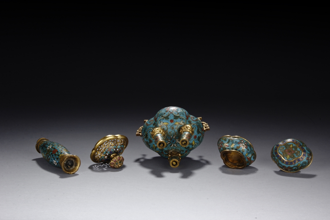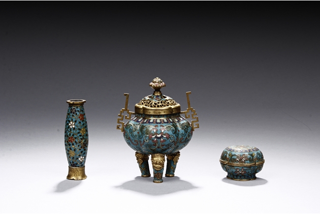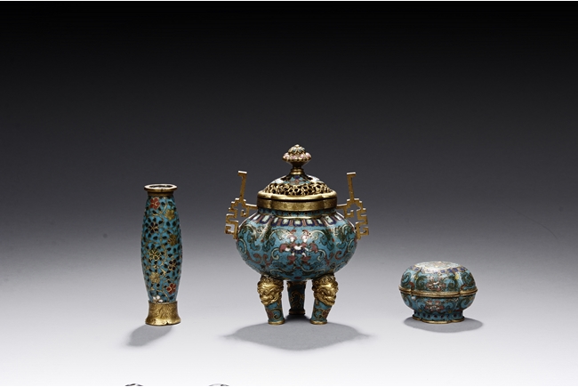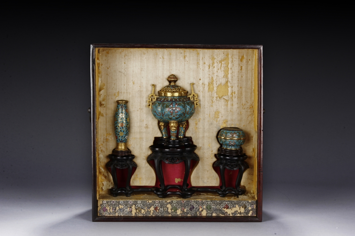This incense garniture set comprises of three pierces, including a tripod censer of compressed and lobed body, supported on three stout feet with gilded mythical beast mask, the body enamelled all over with elaborate floral scroll on turquoise ground, the cover pierced with gilt-metal openwork and surmounted by a gilt-metal finial above key-fret rim; the second a lobed shaped box decorated all over with floral scroll, the top with similar motif enclosed within a blue enamelled pedestal band; the third a slender and lobed shaped vase raised on a spreading gilt-metal foot ring with incised decoration, the body enamelled with elaborate floral scroll motif, the rim gilded. Including original wood stand and wood box. Qing Qianlong Dynasty period.