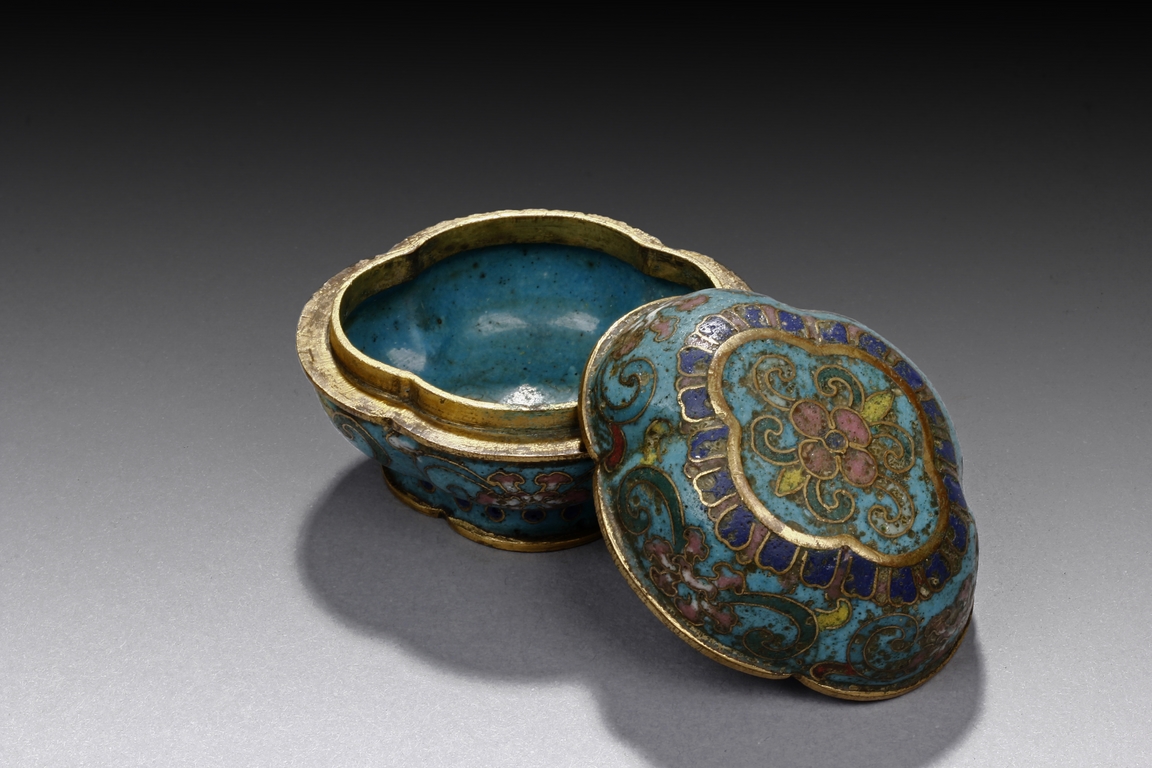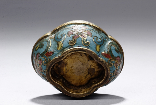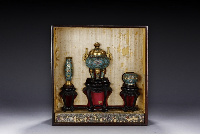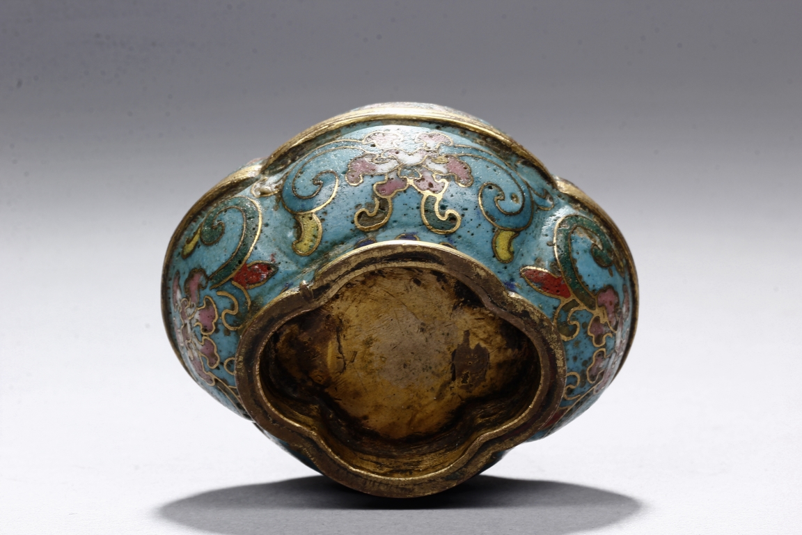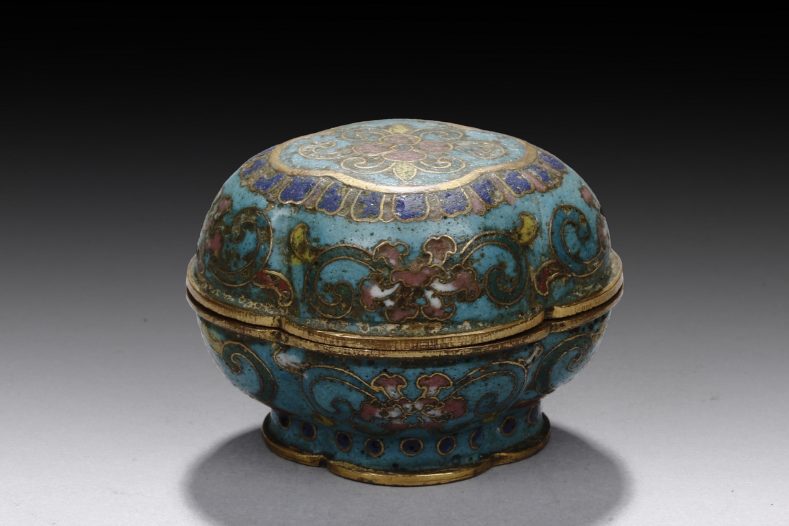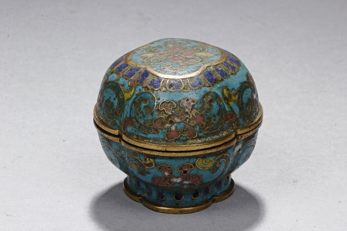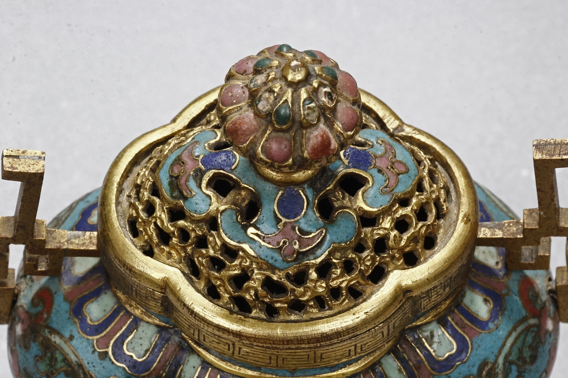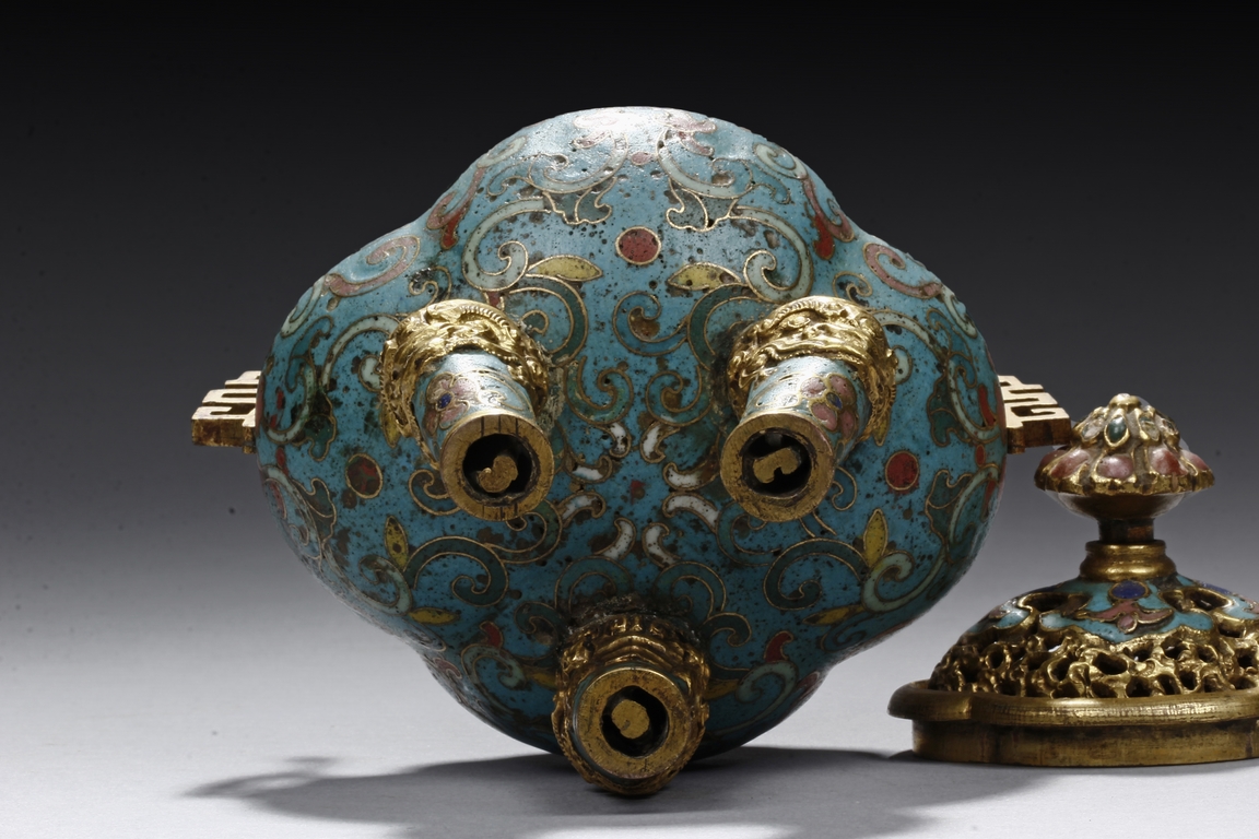 This incense garniture set comprises of three pierces, including a tripod censer of compressed and lobed body, supported on three stout feet with gilded mythical beast mask, the body enamelled all over with elaborate floral scroll on turquoise ground, the cover pierced with gilt-metal openwork and surmounted by a gilt-metal finial above key-fret rim; the second a lobed shaped box decorated all over with floral scroll, the top with similar motif enclosed within a blue enamelled pedestal band; the third a slender and lobed shaped vase raised on a spreading gilt-metal foot ring with incised decoration, the body enamelled with elaborate floral scroll motif, the rim gilded. Including original wood stand and wood box. Qing Qianlong Dynasty period.
