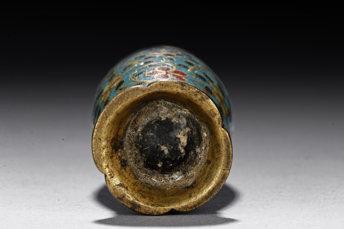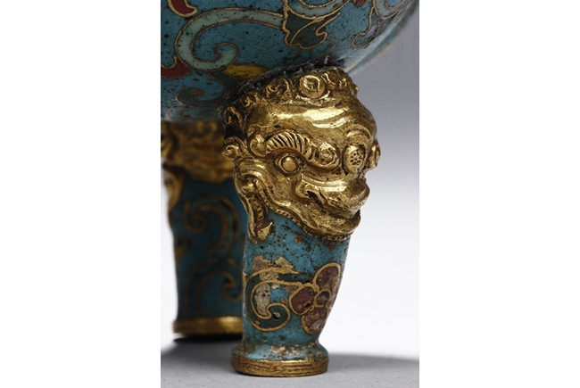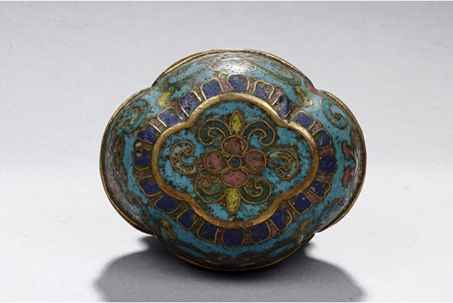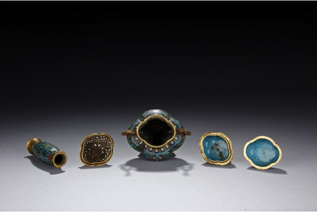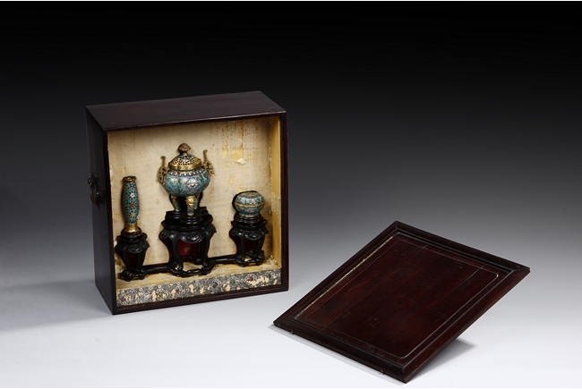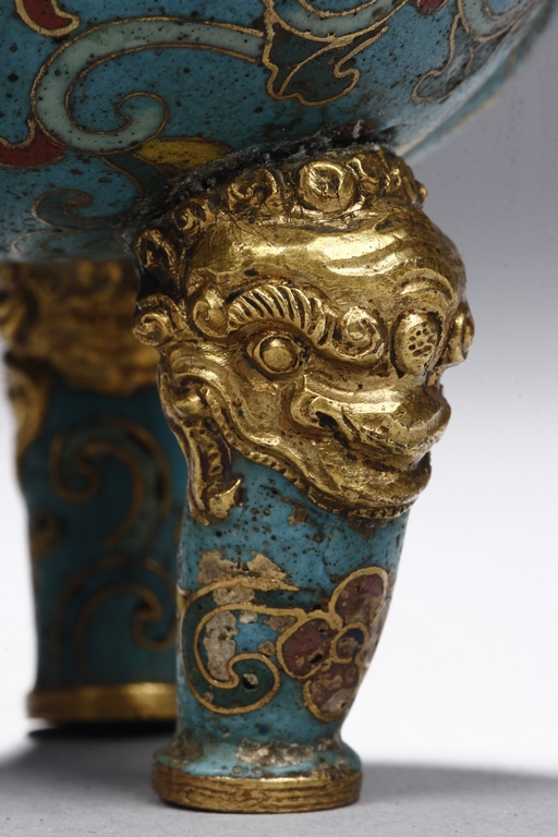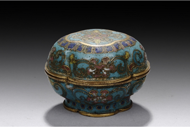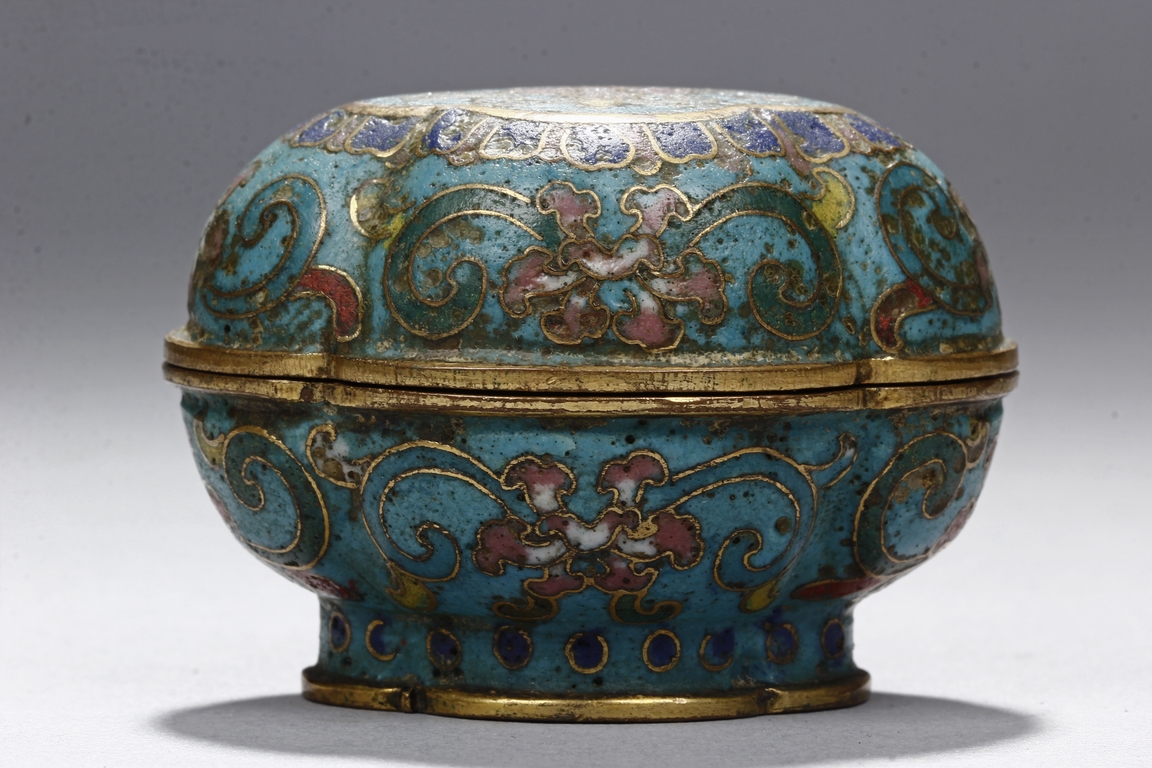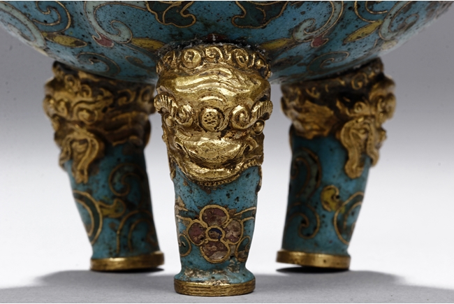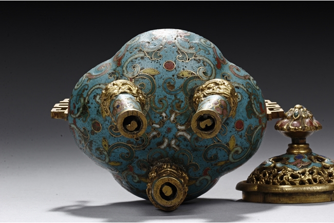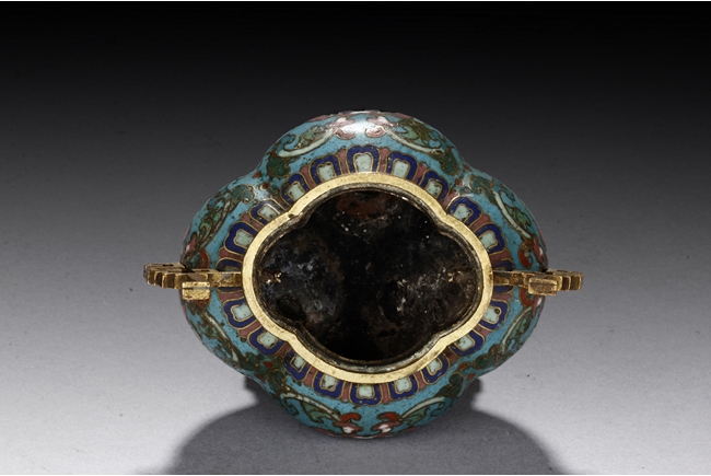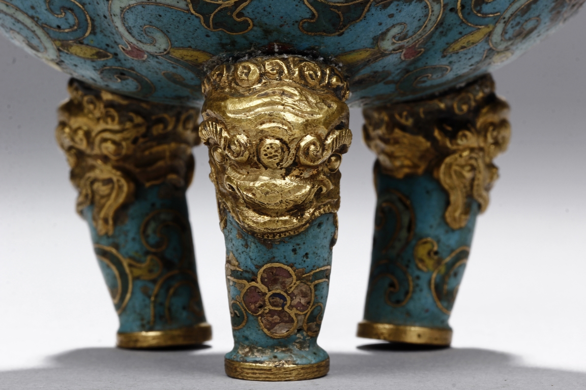 This incense garniture set comprises of three pierces, including a tripod censer of compressed and lobed body, supported on three stout feet with gilded mythical beast mask, the body enamelled all over with elaborate floral scroll on turquoise ground, the cover pierced with gilt-metal openwork and surmounted by a gilt-metal finial above key-fret rim; the second a lobed shaped box decorated all over with floral scroll, the top with similar motif enclosed within a blue enamelled pedestal band; the third a slender and lobed shaped vase raised on a spreading gilt-metal foot ring with incised decoration, the body enamelled with elaborate floral scroll motif, the rim gilded. Including original wood stand and wood box. Qing Qianlong Dynasty period.