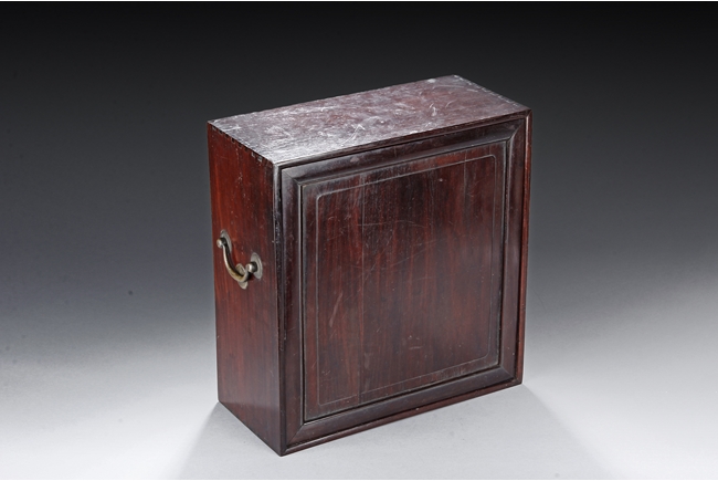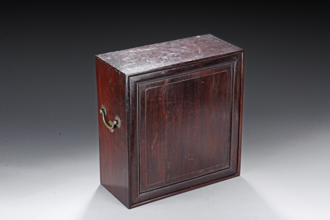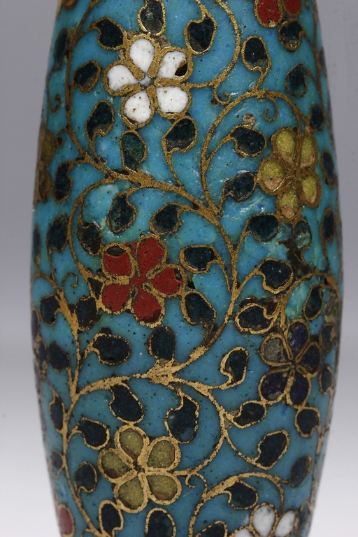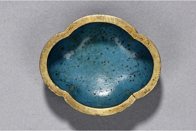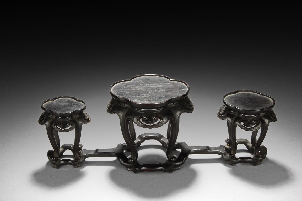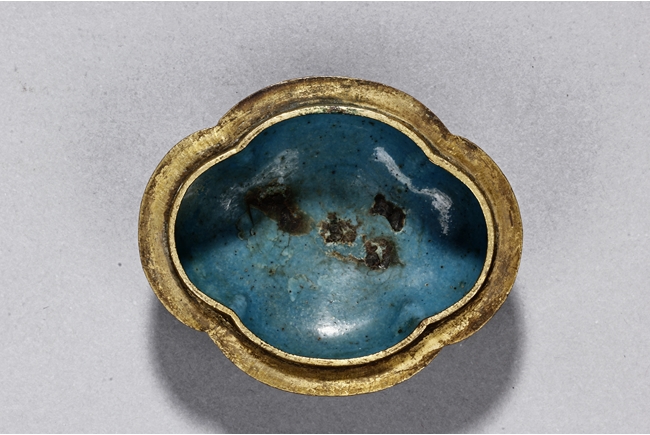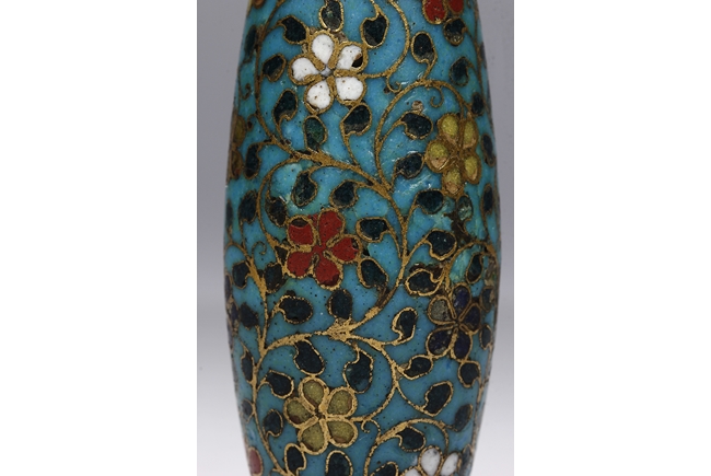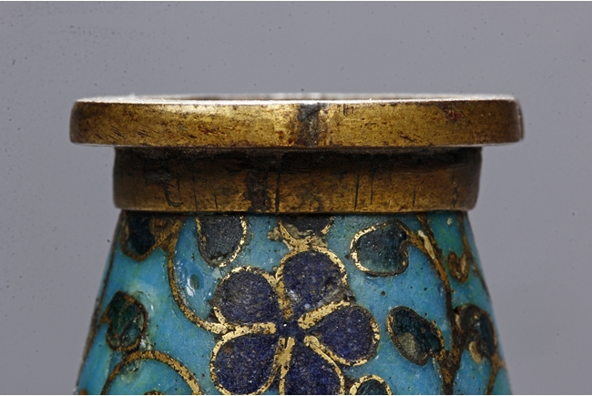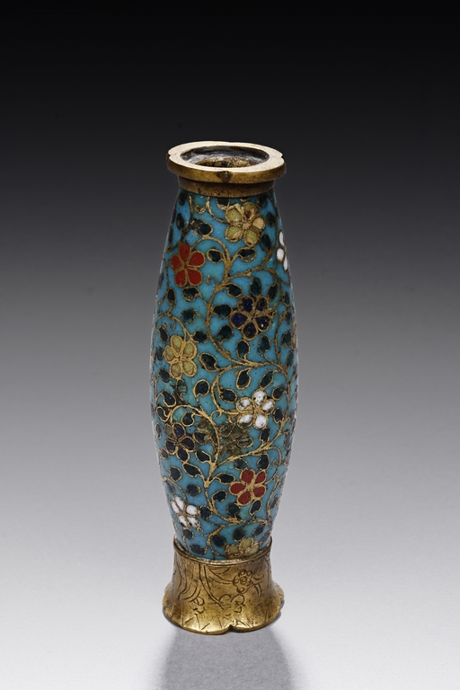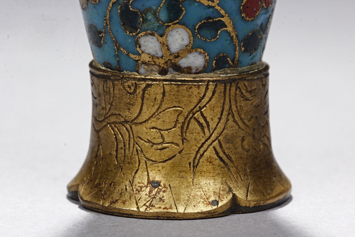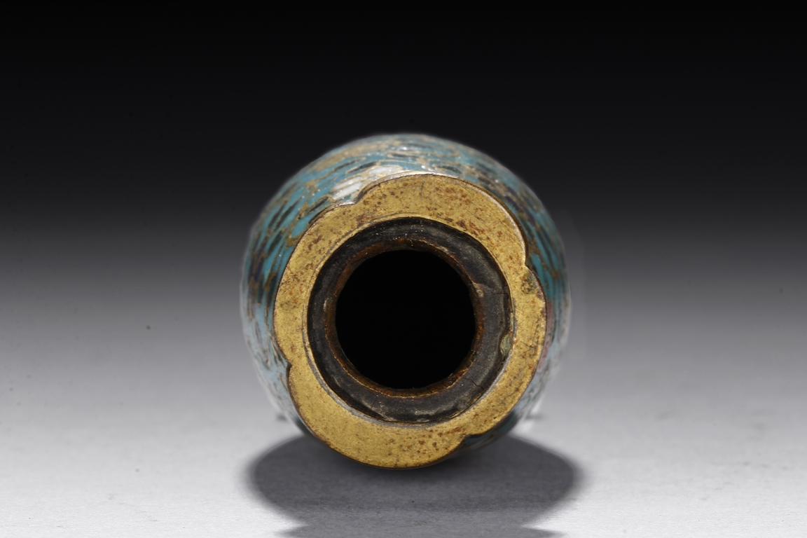 This incense garniture set comprises of three pierces, including a tripod censer of compressed and lobed body, supported on three stout feet with gilded mythical beast mask, the body enamelled all over with elaborate floral scroll on turquoise ground, the cover pierced with gilt-metal openwork and surmounted by a gilt-metal finial above key-fret rim; the second a lobed shaped box decorated all over with floral scroll, the top with similar motif enclosed within a blue enamelled pedestal band; the third a slender and lobed shaped vase raised on a spreading gilt-metal foot ring with incised decoration, the body enamelled with elaborate floral scroll motif, the rim gilded. Including original wood stand and wood box. Qing Qianlong Dynasty period.