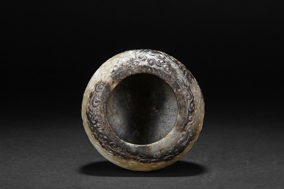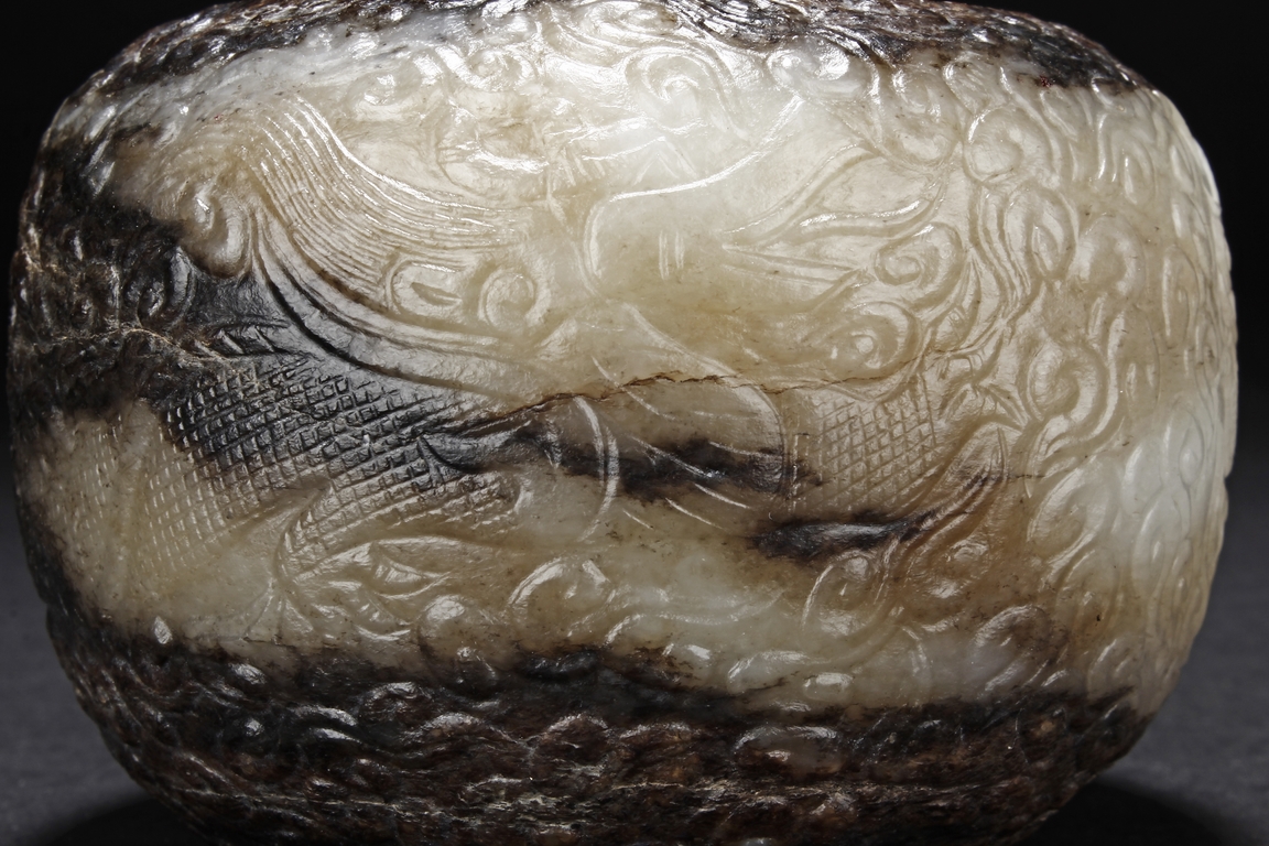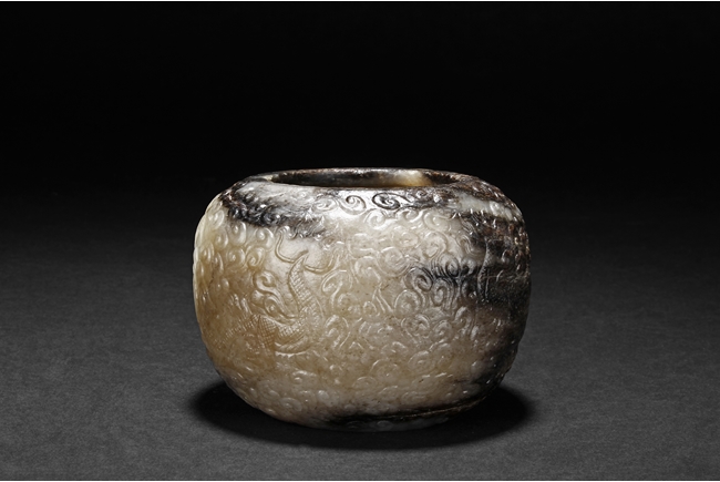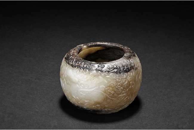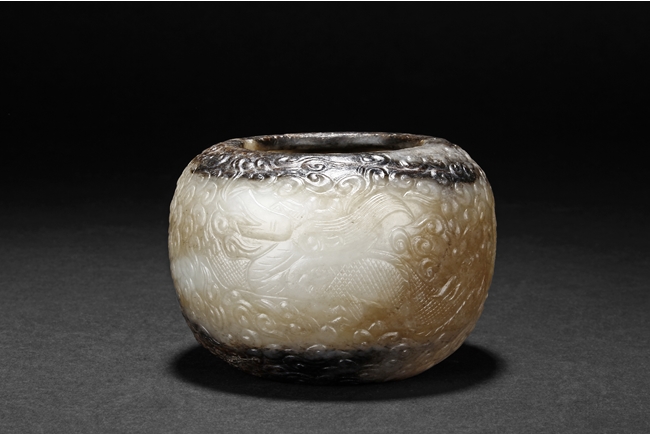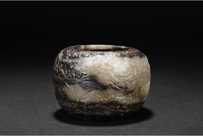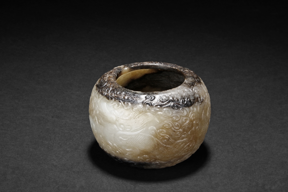The exterior of the water pot is carved in shallow relief with a mythical dragon, detailed with finely incised scales and the flame-like tail, all reserved on a delicately carved dense network of scrolling clouds. The body is of mostly white tone, with varying tone of russet and areas of darker inclusions along the rim and base. 17th Century.
