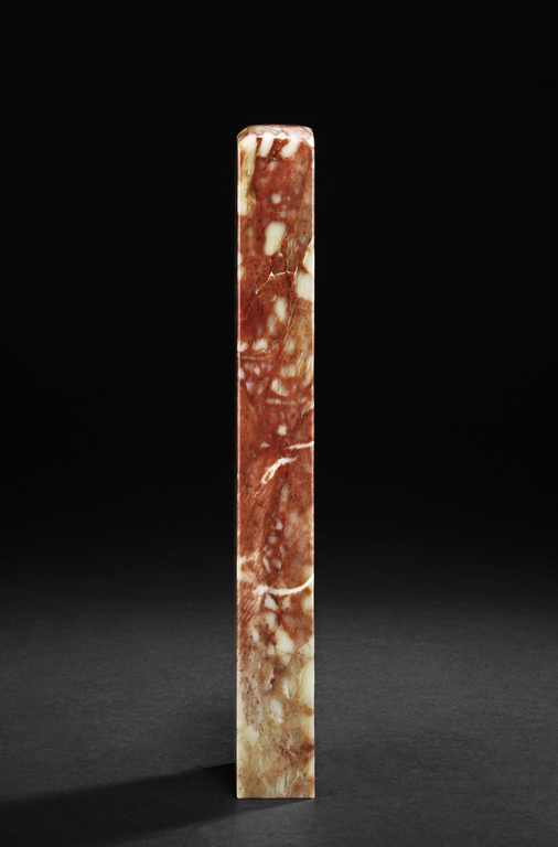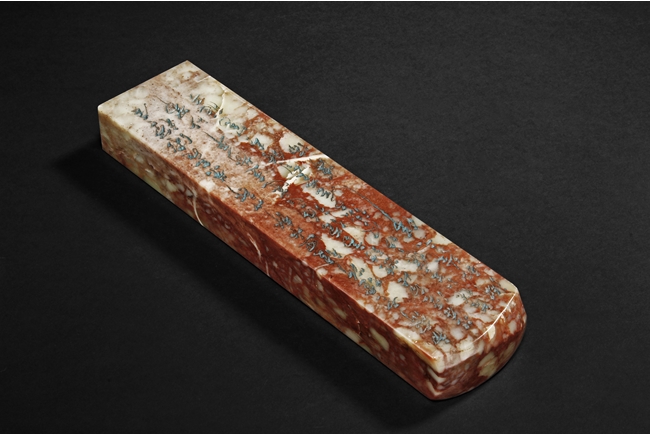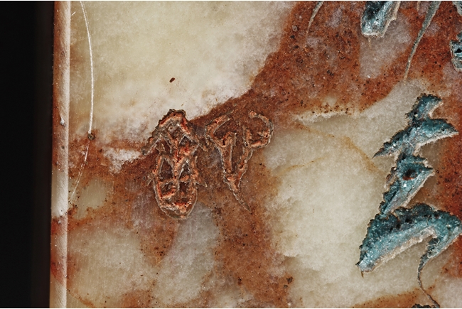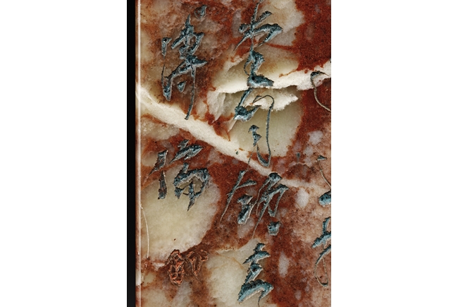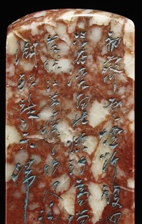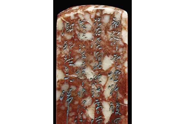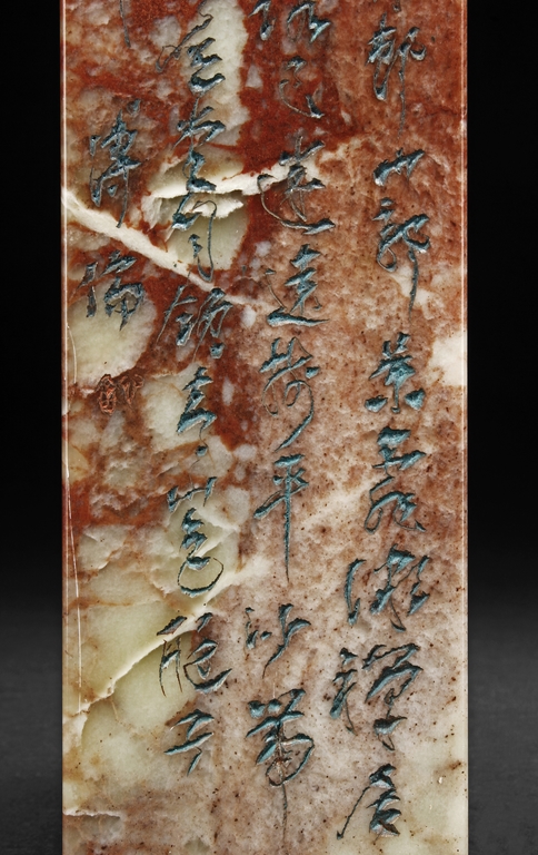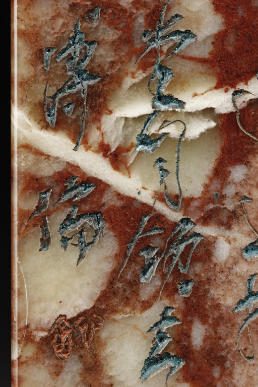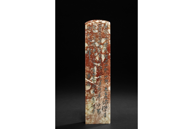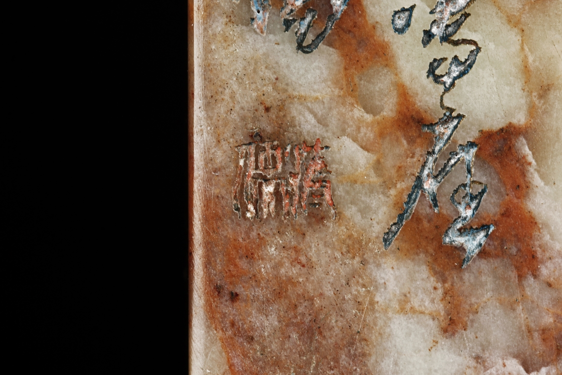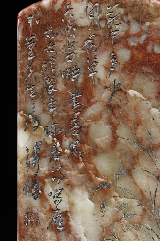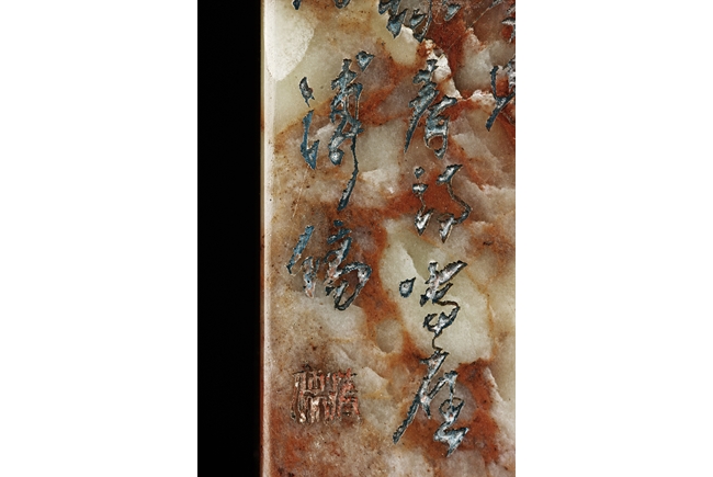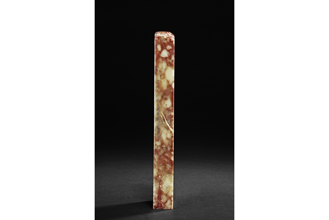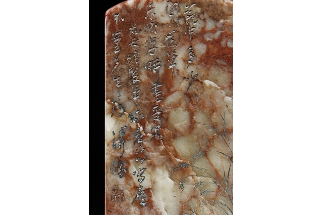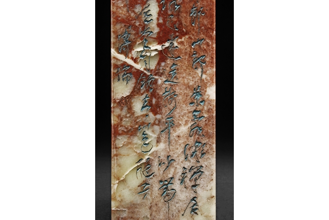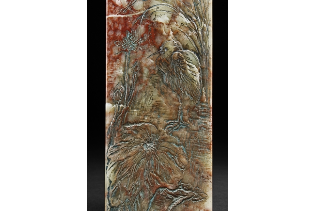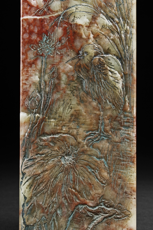 Of long rectangular shape with curved top corner, the front carved with a bird surrounded by flowers, with poetry on top, the reverse with additional poetry, both sides with multiple signature and marks.