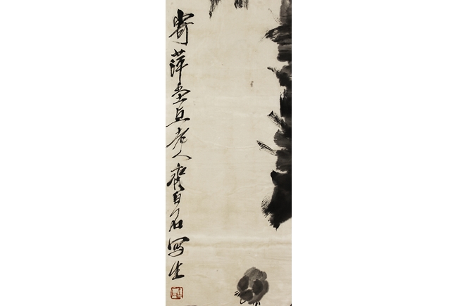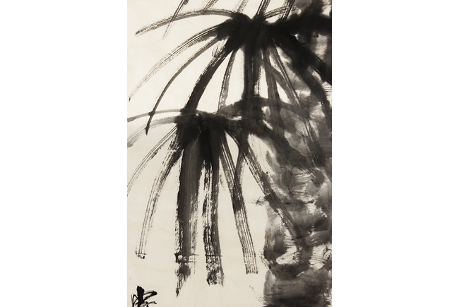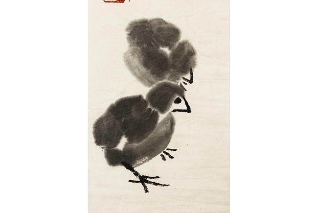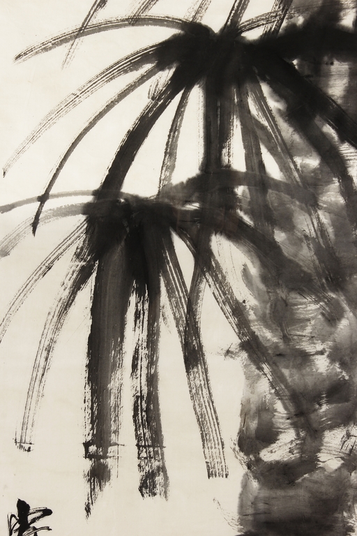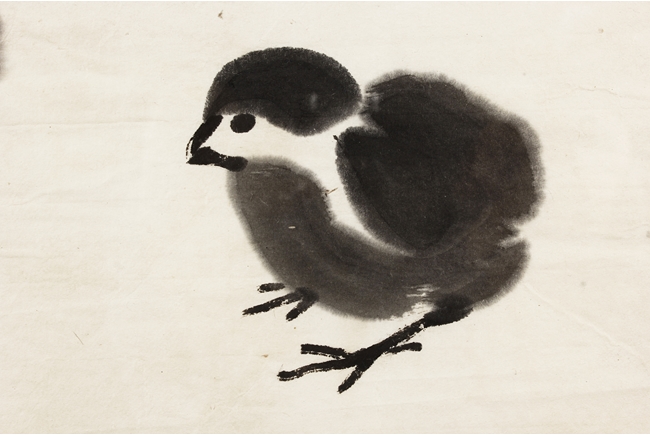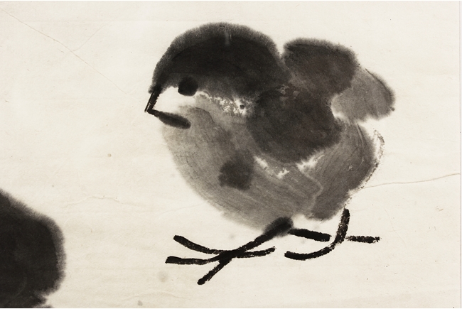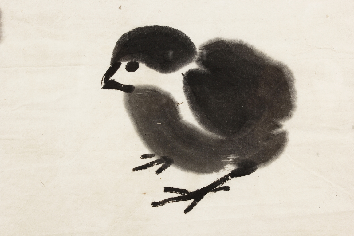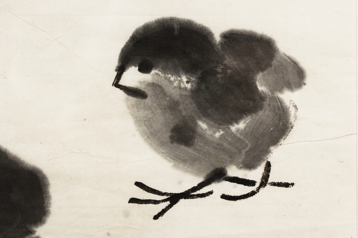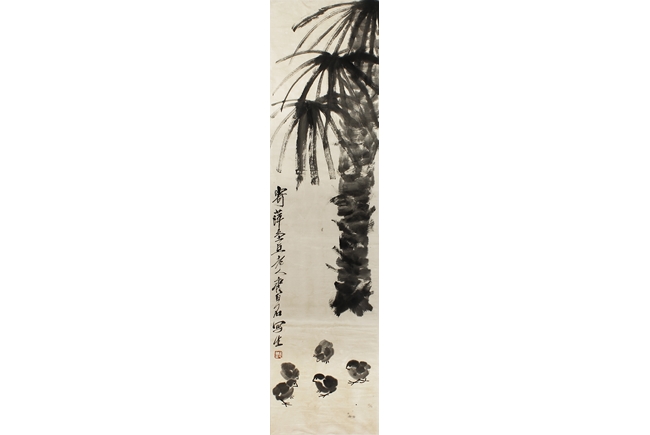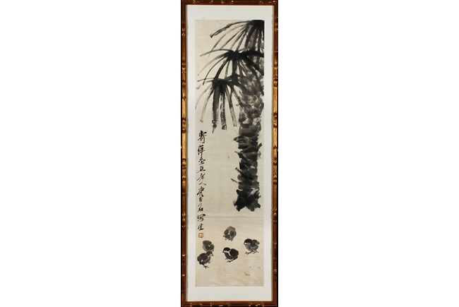 Ink on paper painting, mounted and framed. The painting depicts a group of chicks beneath a large palm tree. Inscription and seal mark on the left side.