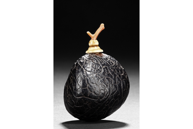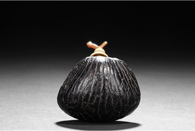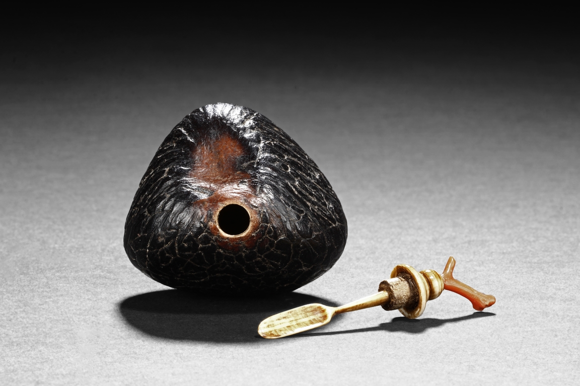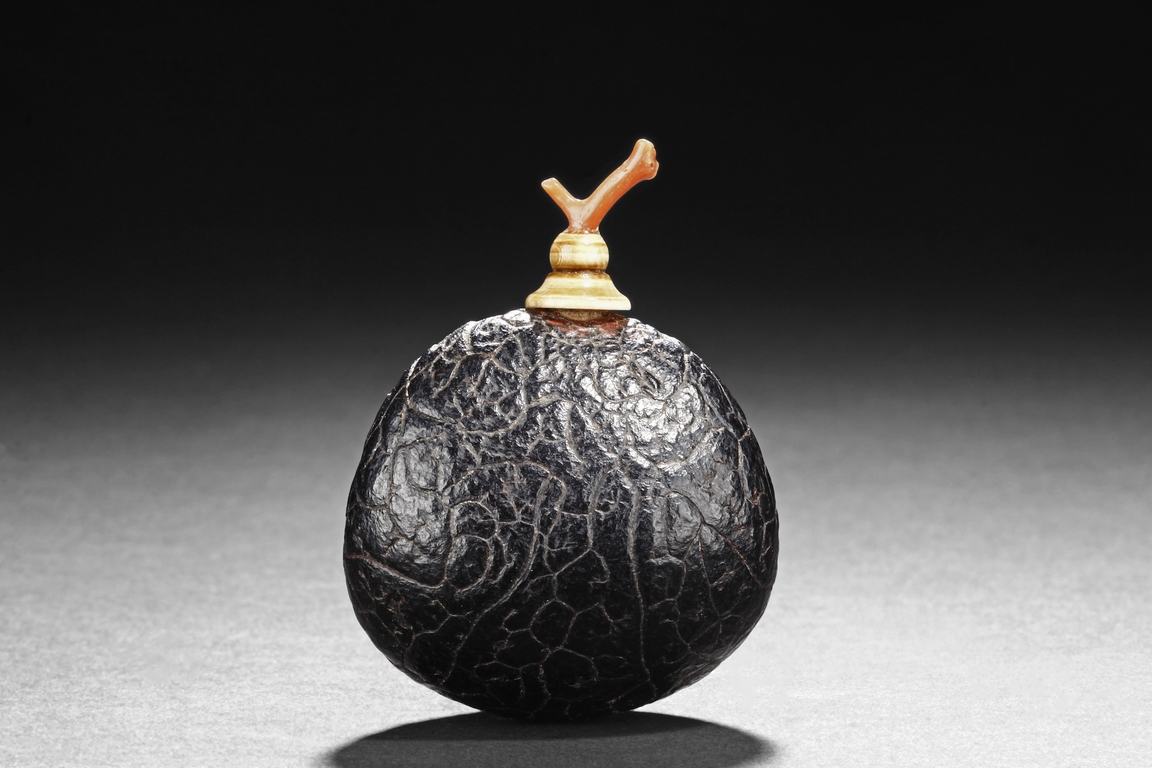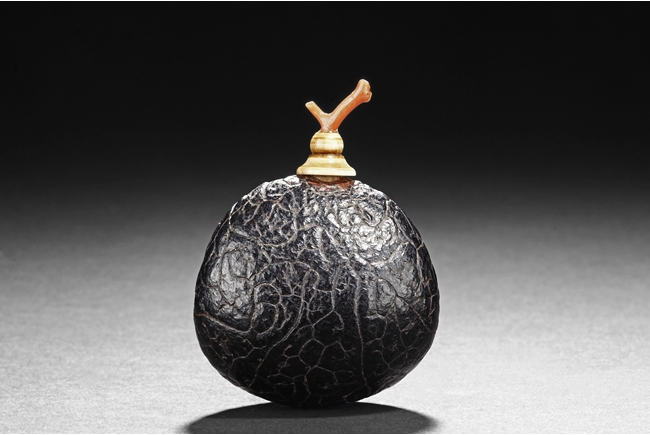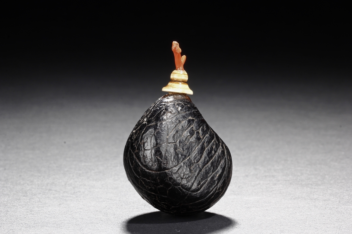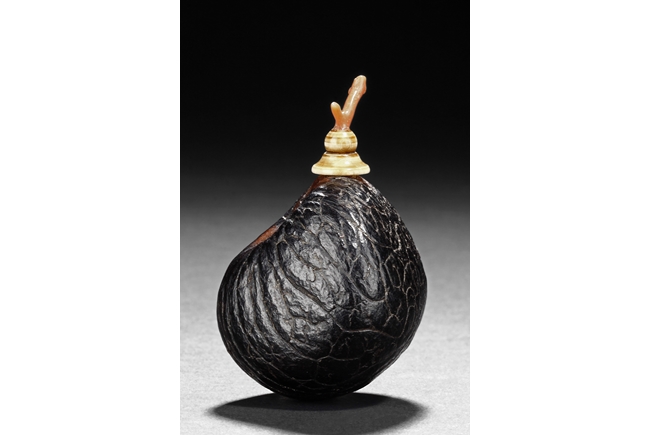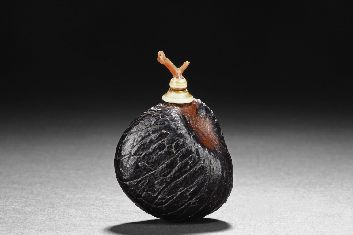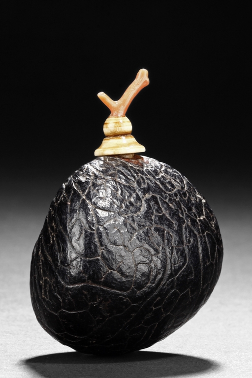 The snuff bottle is of chestnut shaped, natural zitan wood's black color and grain, with age lines. The stopper composed of ivory and coral, and it includes the ivory spoon. Ming Dynasty period.