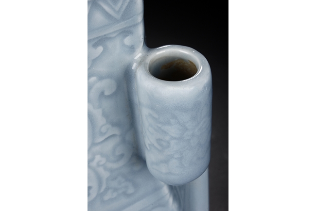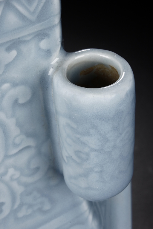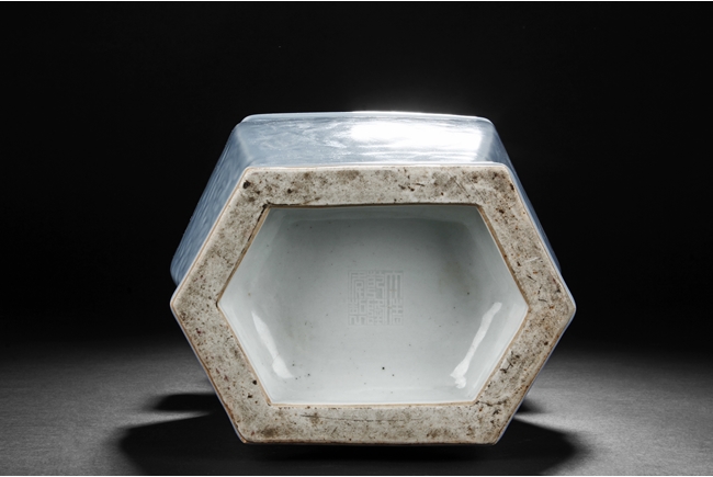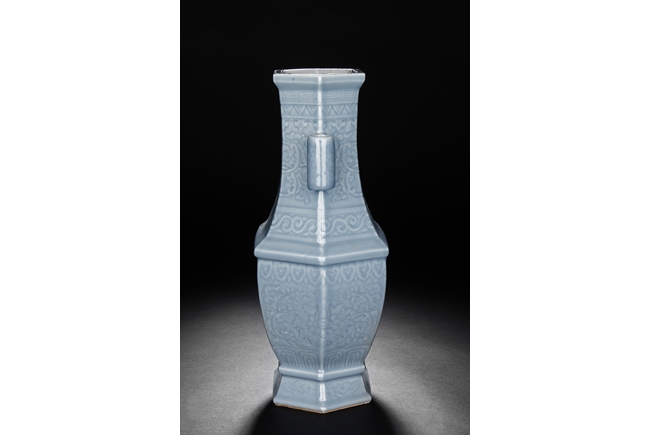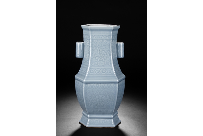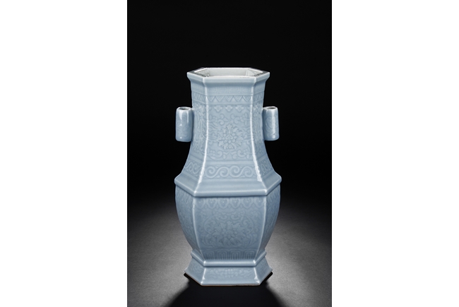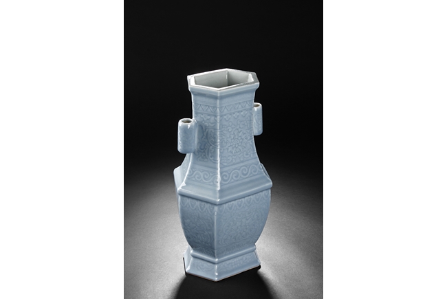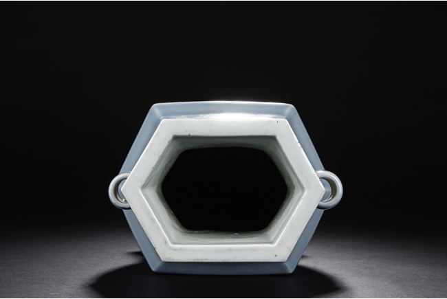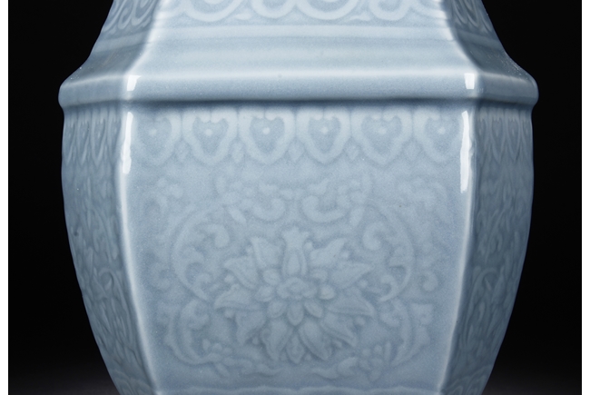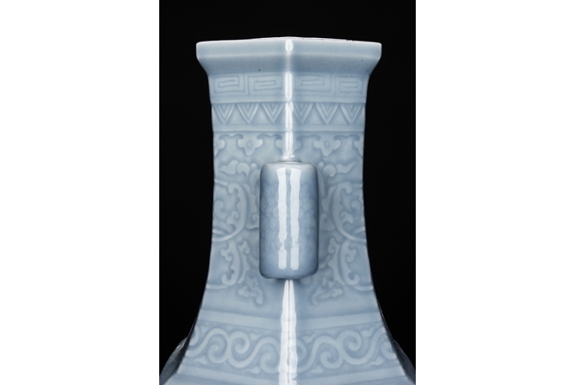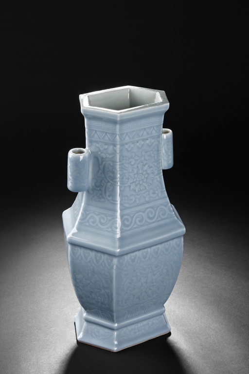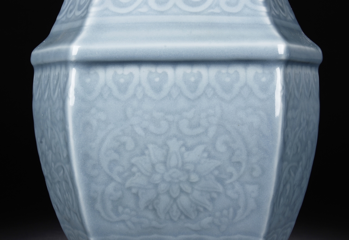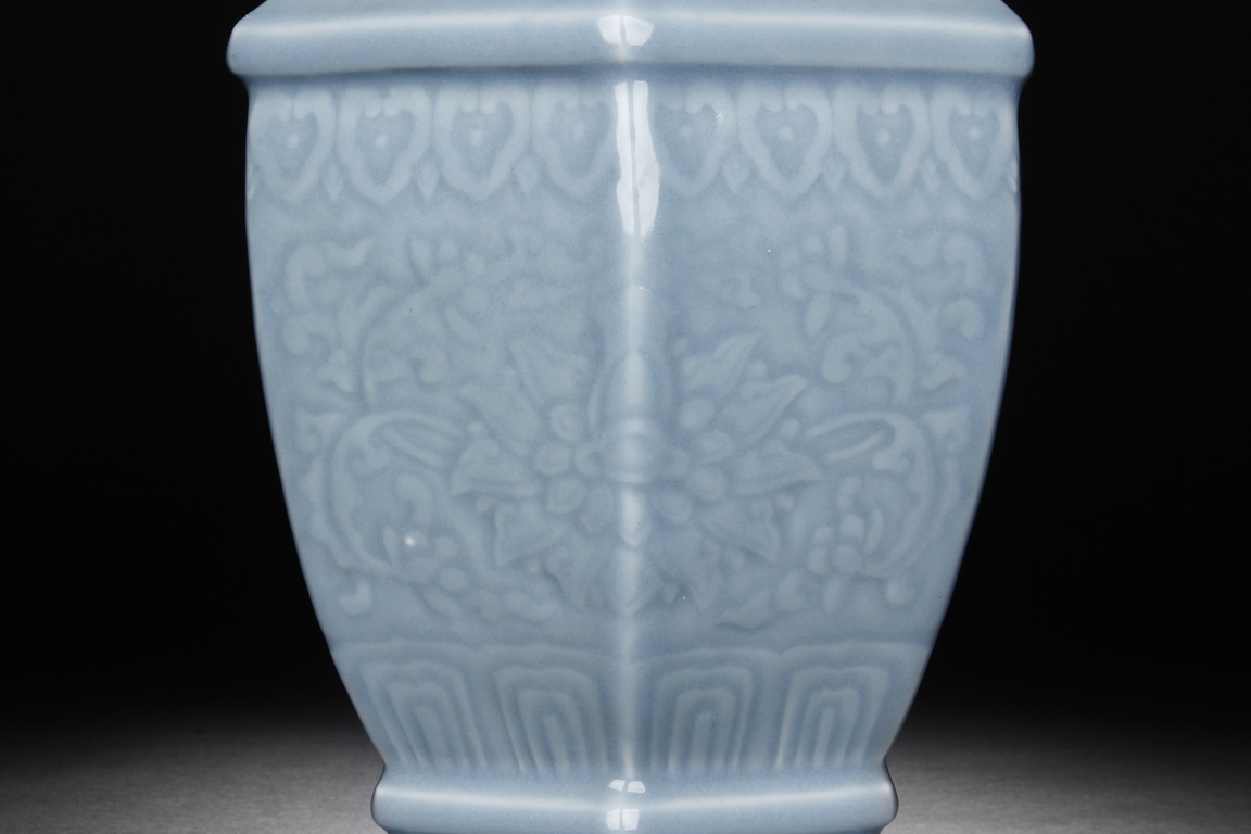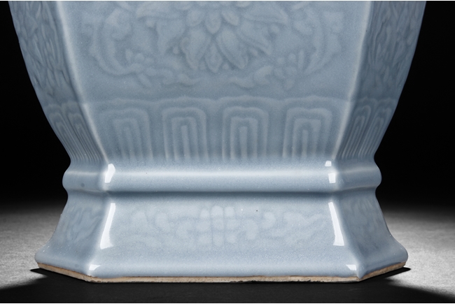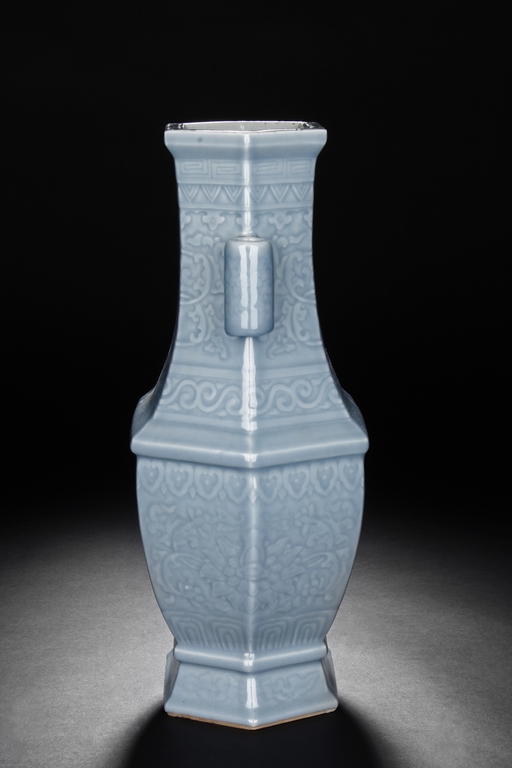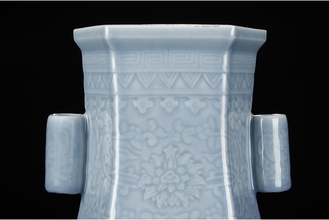 The body divides into hexagonal form, impressed with scrolling foliage patterns and key-fret borders, with two lug handles on the sides, the vase overall glazed in clare-de-lune, the bottom bears six character "DAQING QIANLONG NIANZHI" mark.