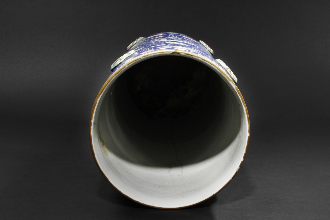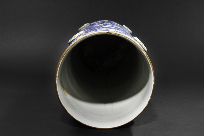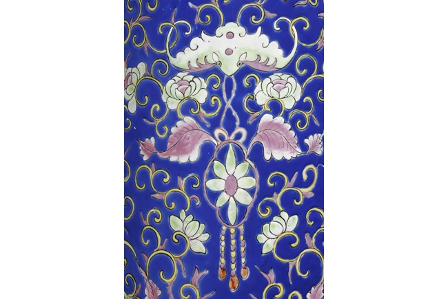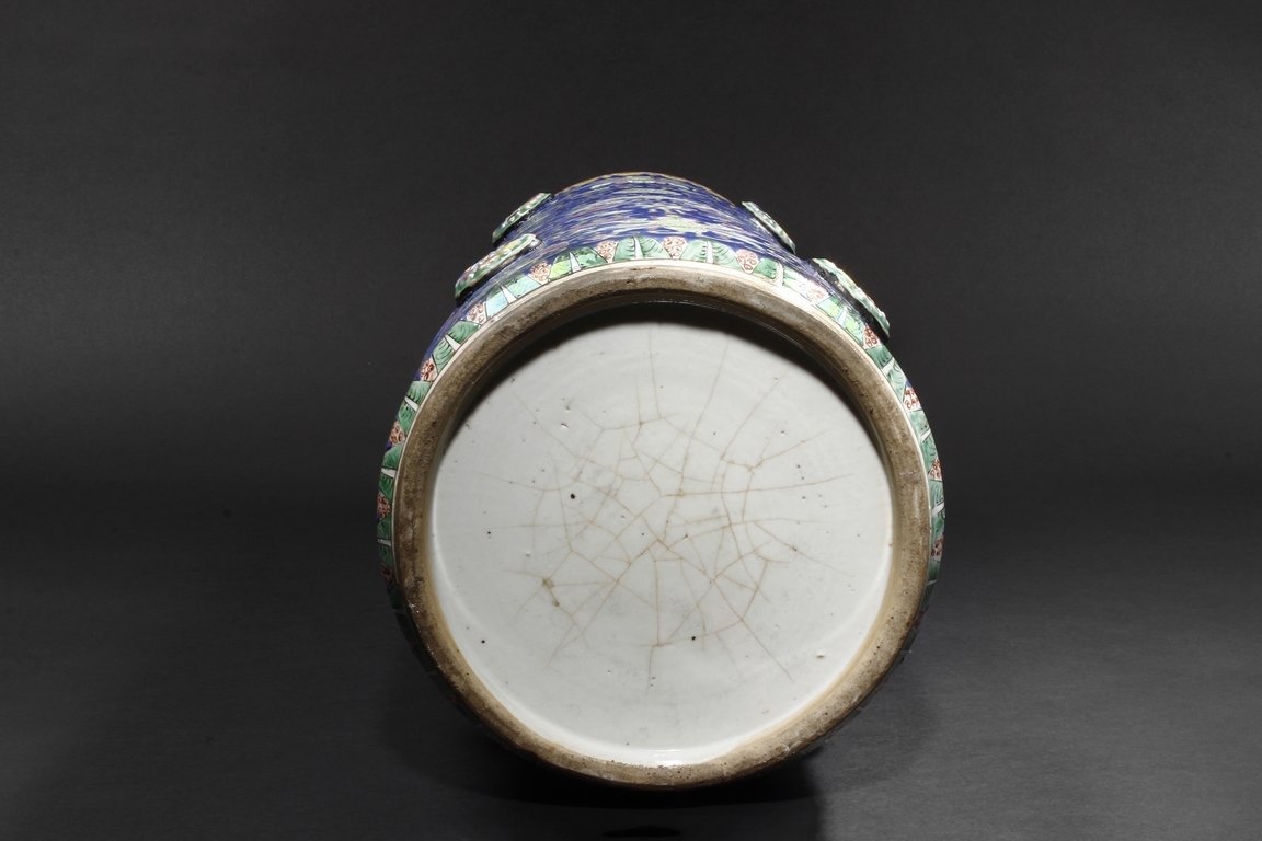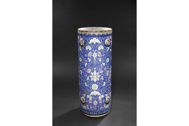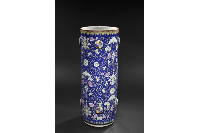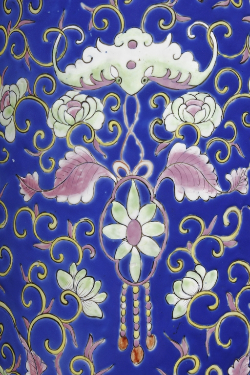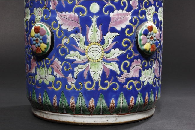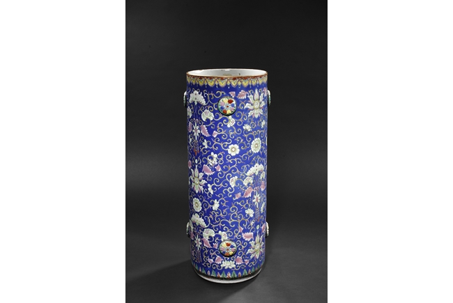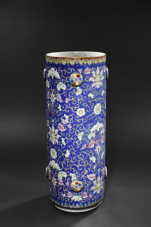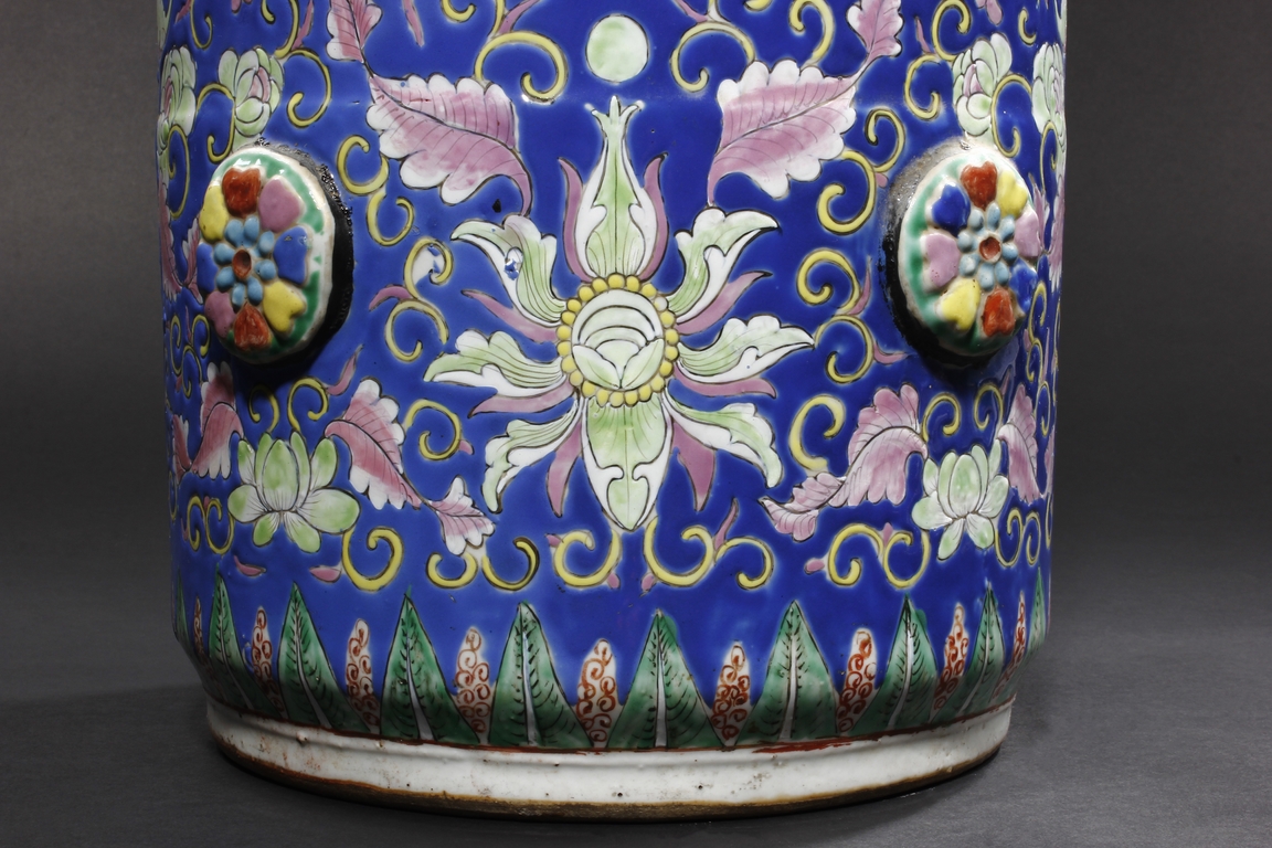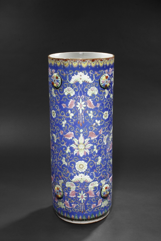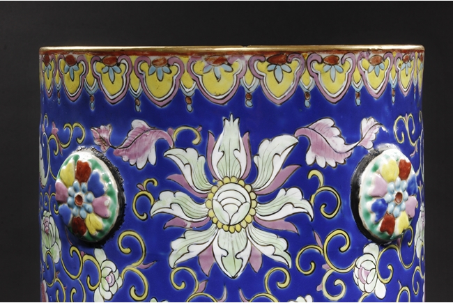 Of circular cylindrical form, the scroll pot is decorated with stylized flowers amidst scrolling foliage, with raised colorful medallions on the upper and lower body and encircled by a roundel of ruyi pattern and leaf panels, all against the blue ground enamel. Qing Dynasty period.