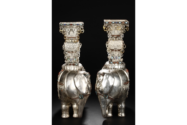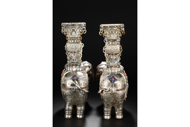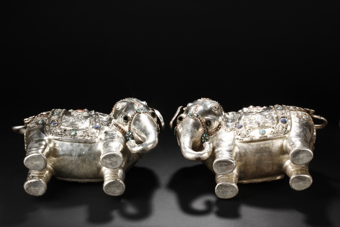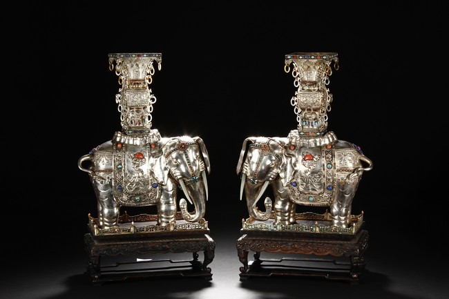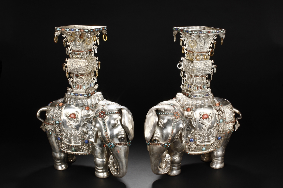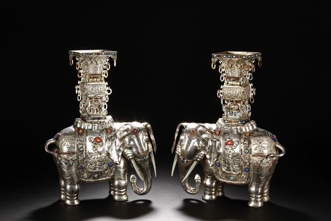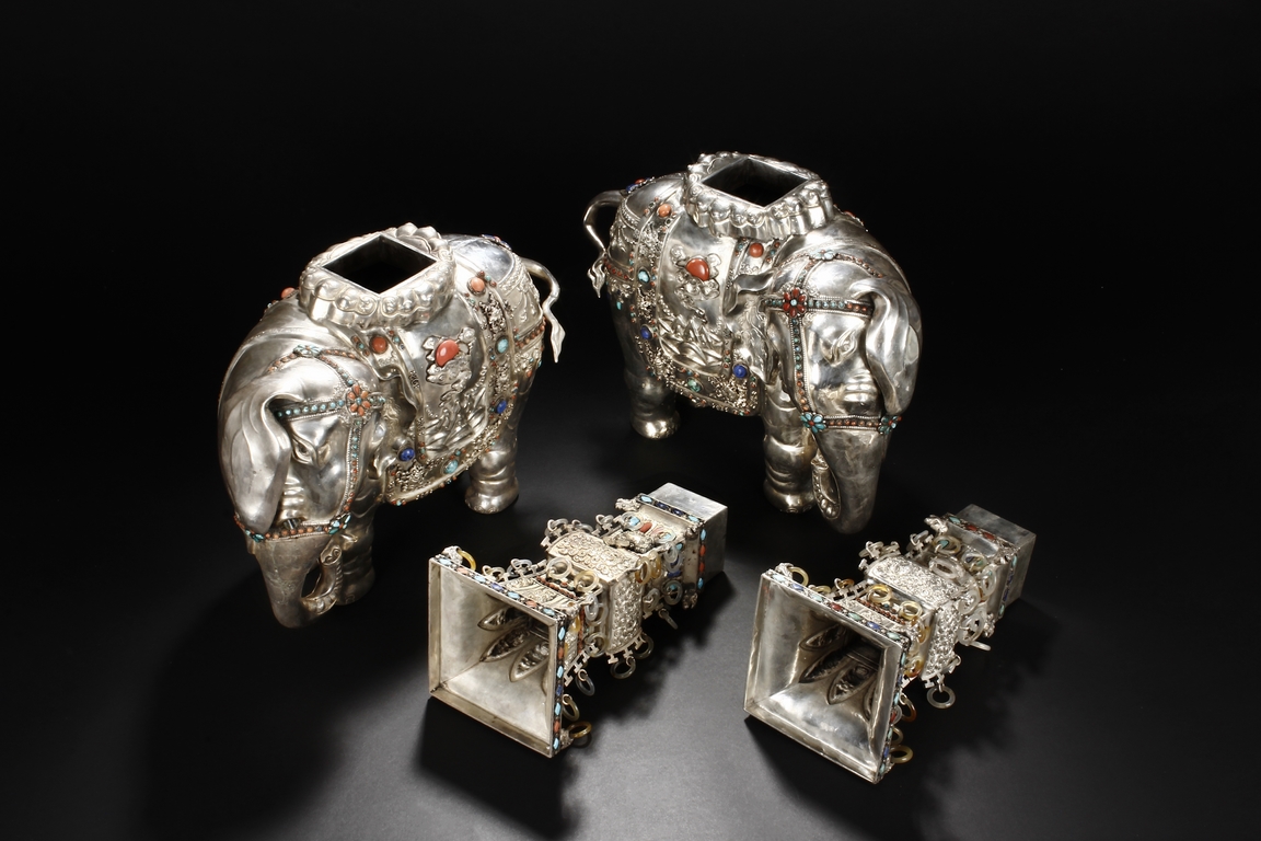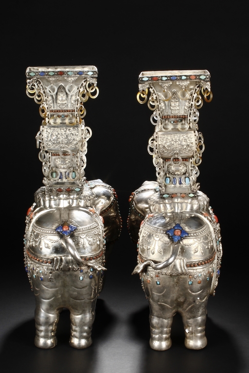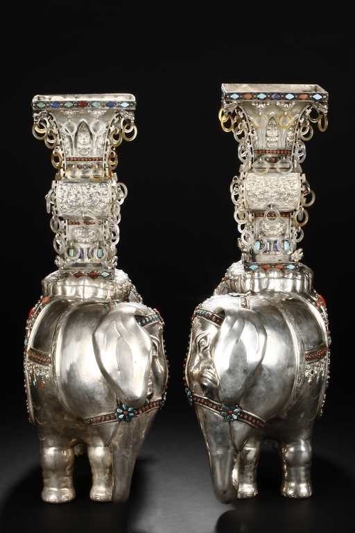 Each elephant is elaborately adorned and inlaid with turquoise, lapis lazuli, and coral. The saddle blanket is cast with mountains rising from waves below a coral-inlaid sun enclosed and surrounded by Buddhist emblems spaced by gems. Each elephant carries an archaic vessel decorated with numerous agate rings hanging from flanges. Each is supported on wood stand with ivory fences. Qing Dynasty period.