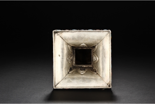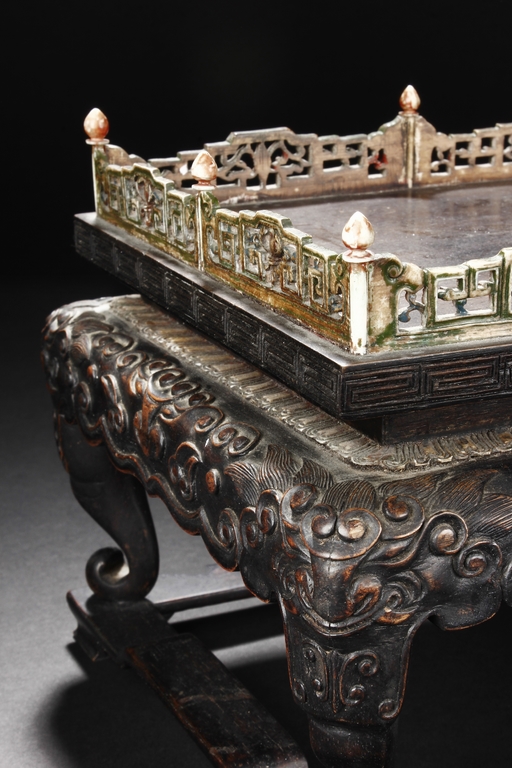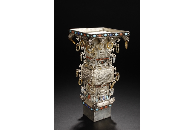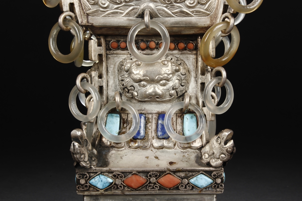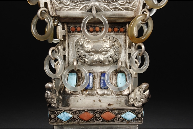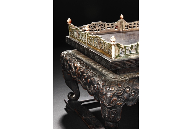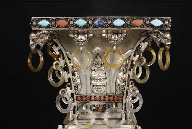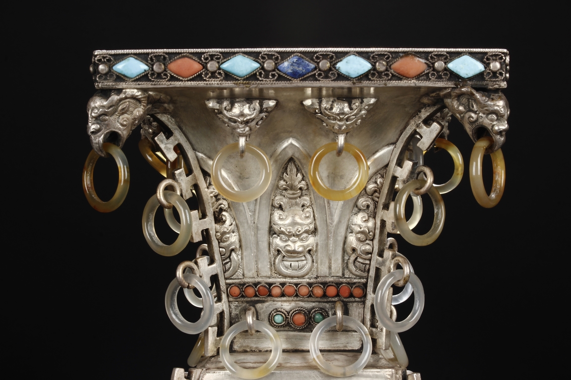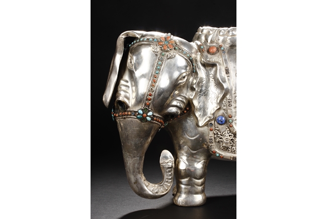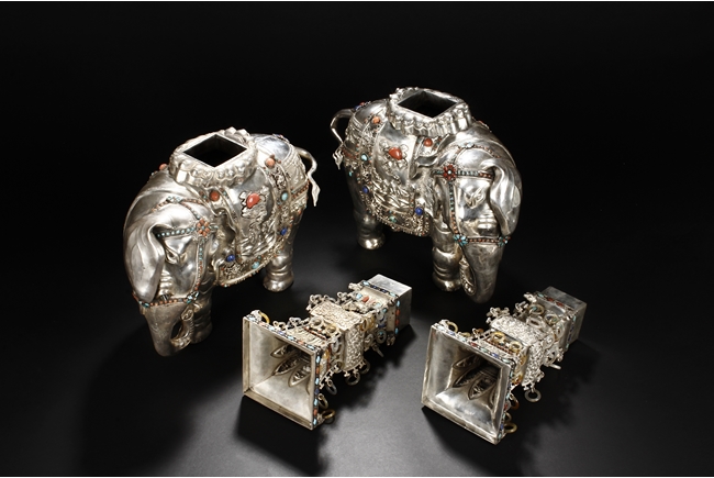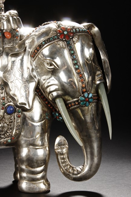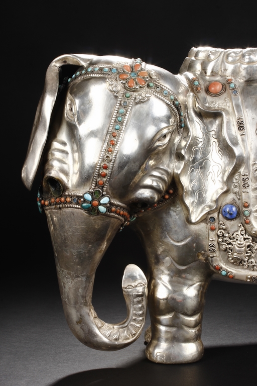 Each elephant is elaborately adorned and inlaid with turquoise, lapis lazuli, and coral. The saddle blanket is cast with mountains rising from waves below a coral-inlaid sun enclosed and surrounded by Buddhist emblems spaced by gems. Each elephant carries an archaic vessel decorated with numerous agate rings hanging from flanges. Each is supported on wood stand with ivory fences. Qing Dynasty period.