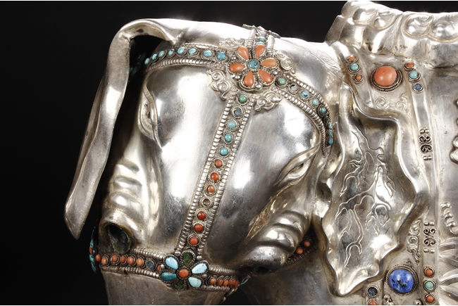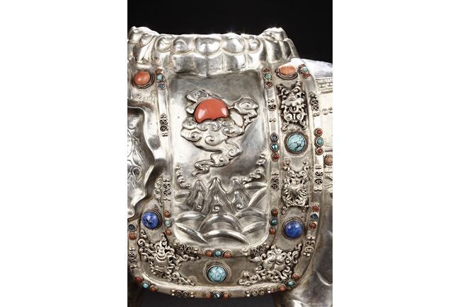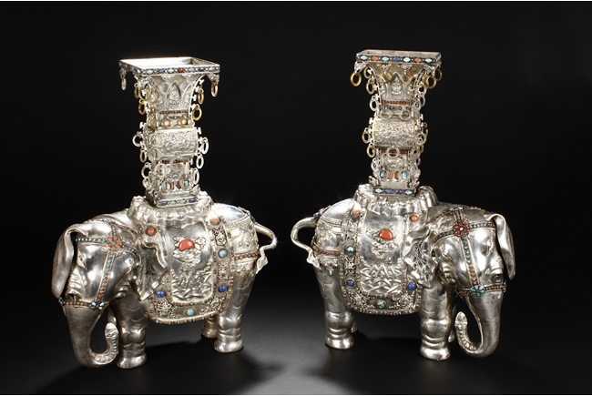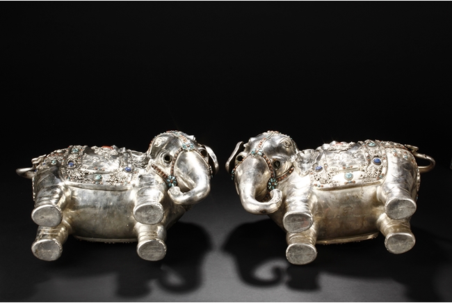 此銀胎太平有象做工精細生動,歷史感強,銀象搖頭擺尾,背負寶瓶,瓶同平音,寓意五谷豐登,大吉大利,成對傳世,極為難得,有很高的收藏價值。