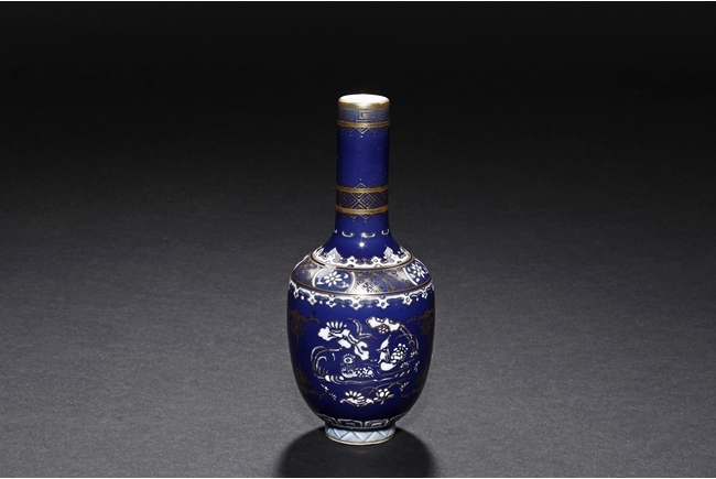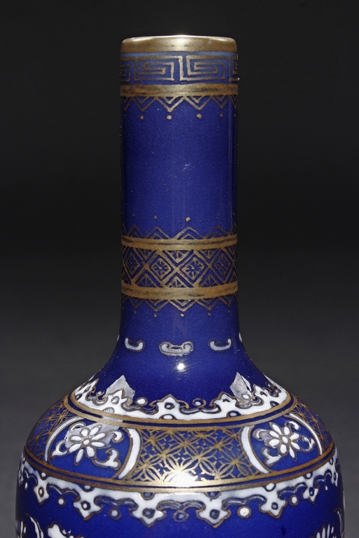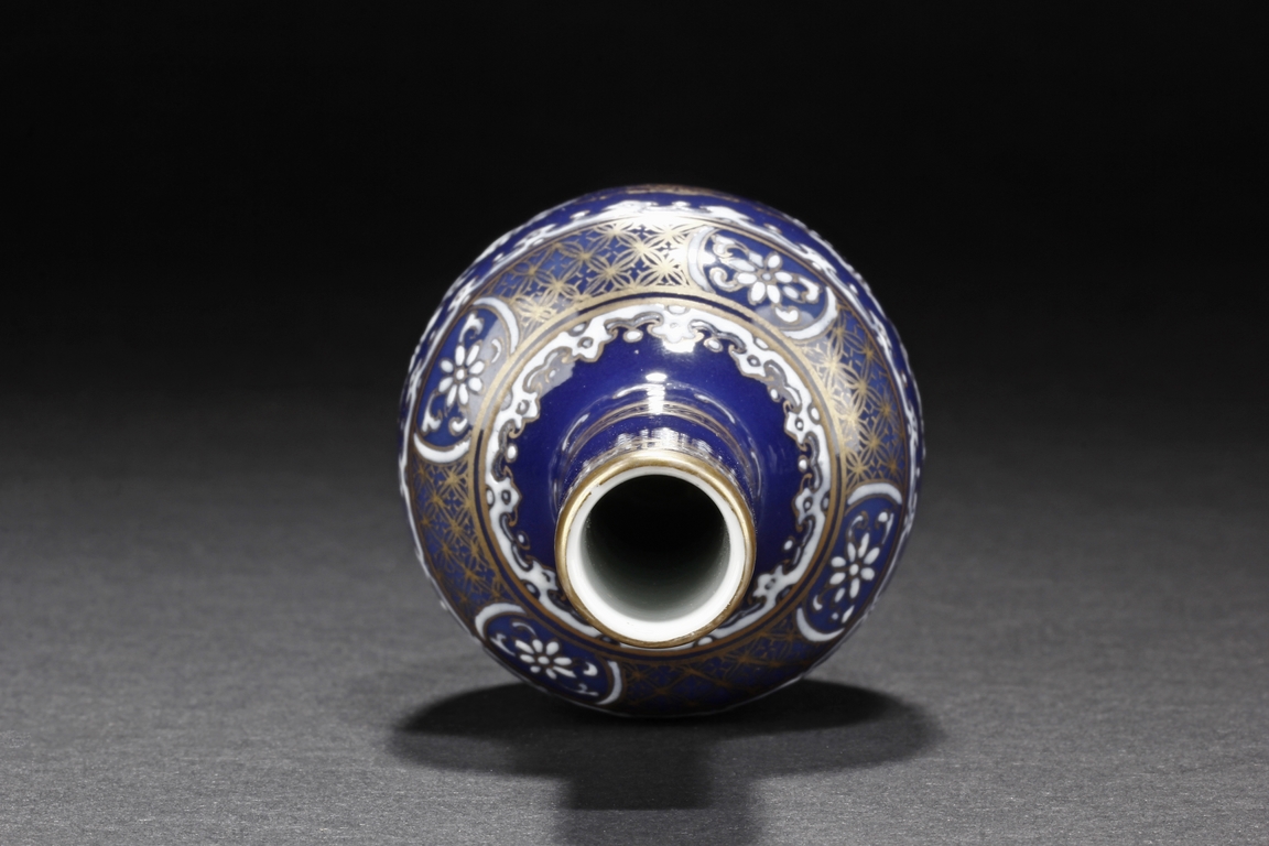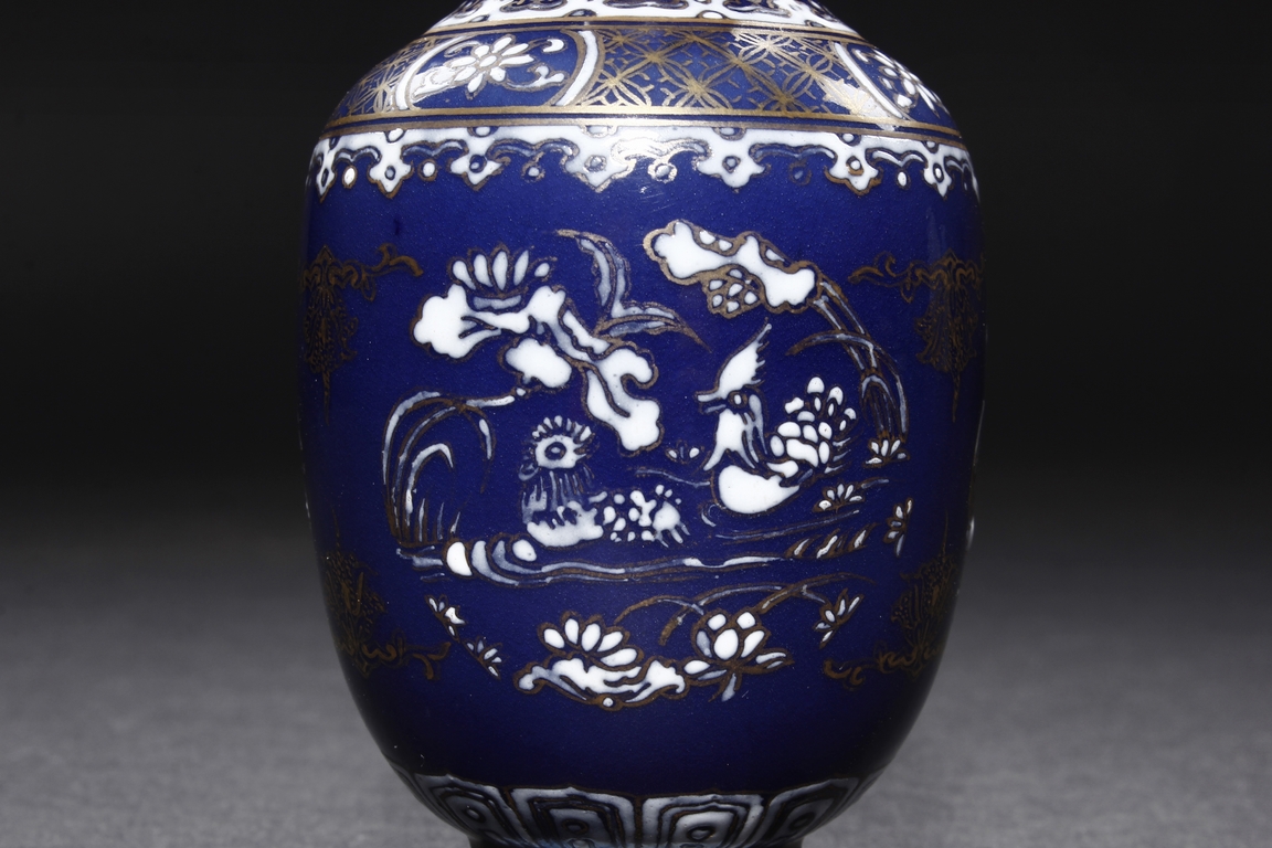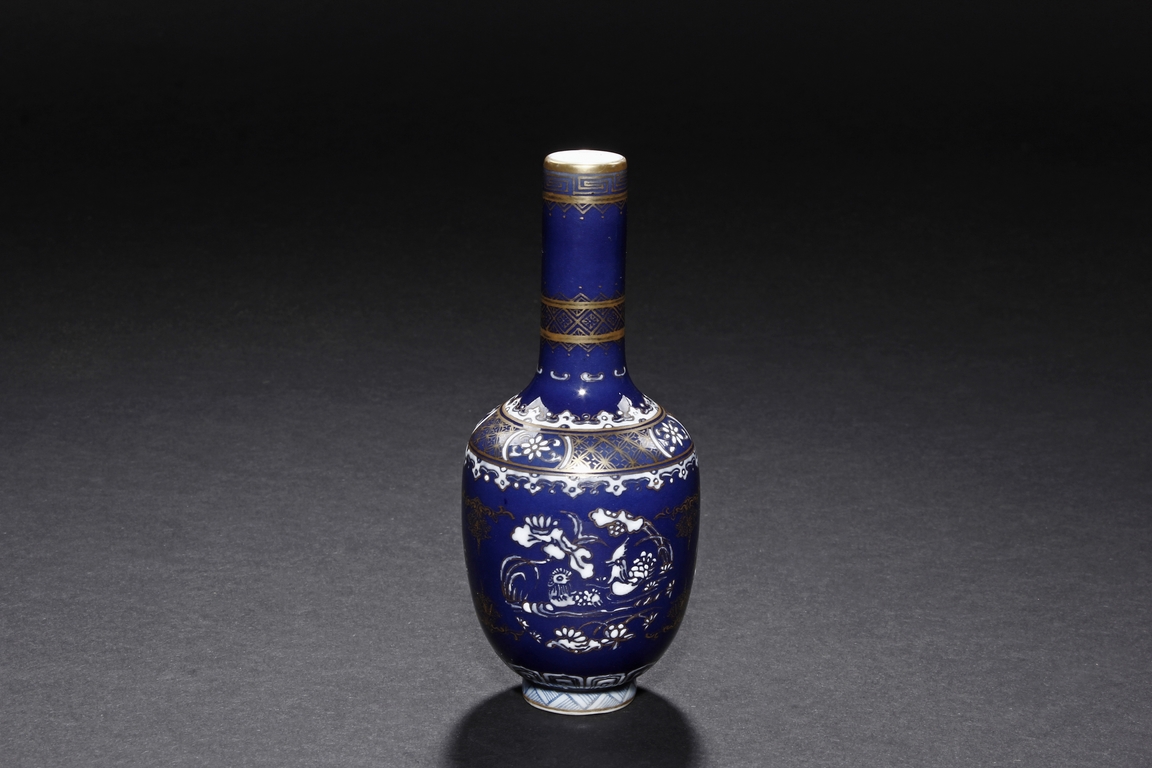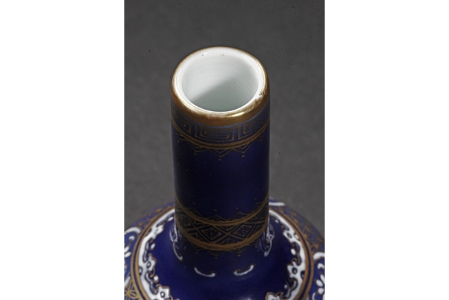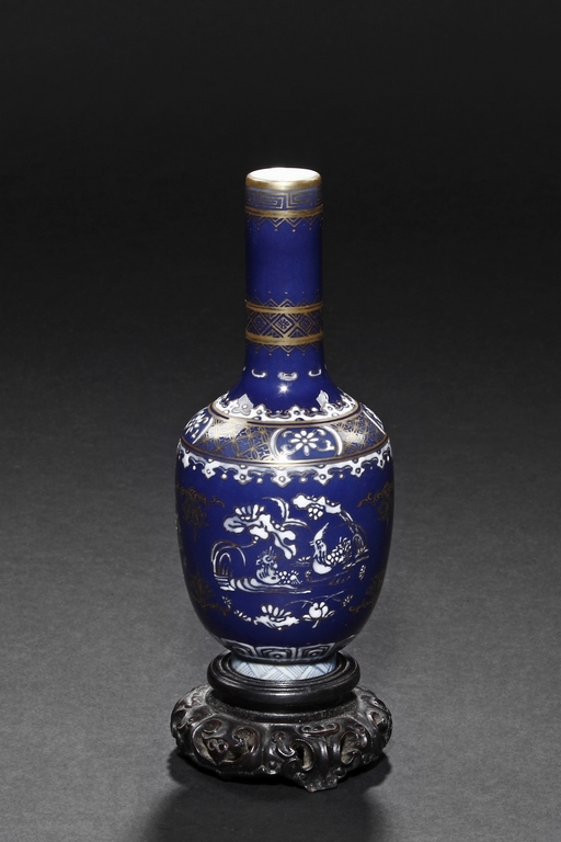 The body is of ovoid form, tapering slightly to straight ring foot, the slender and long neck extends to same sized opening, the body gilt decorated with mandarin ducks and river scenery, with decorative flowers, coins, key-fret, and other patterns, all against deep blue ground, the bottom with four character mark. Qing Dynasty period.
