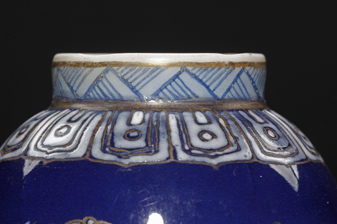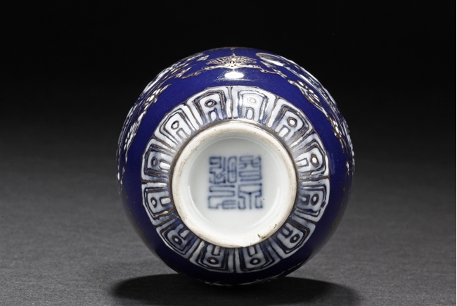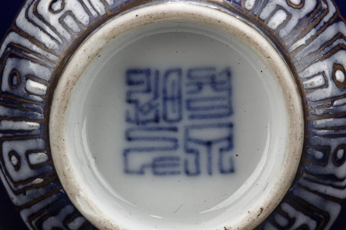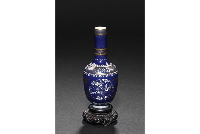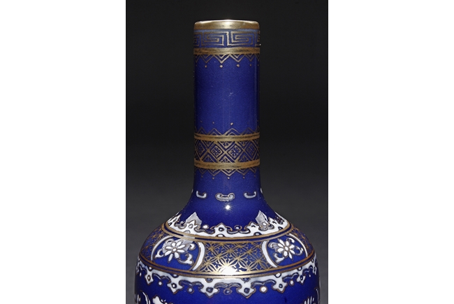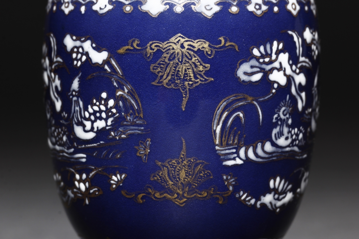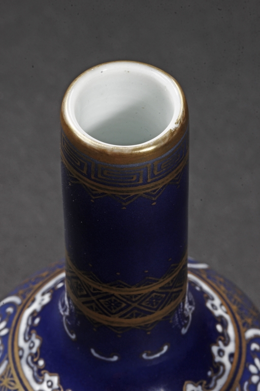 The body is of ovoid form, tapering slightly to straight ring foot, the slender and long neck extends to same sized opening, the body gilt decorated with mandarin ducks and river scenery, with decorative flowers, coins, key-fret, and other patterns, all against deep blue ground, the bottom with four character mark. Qing Dynasty period.