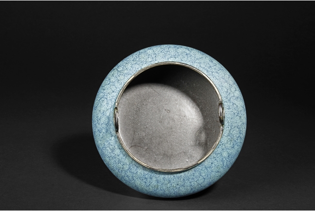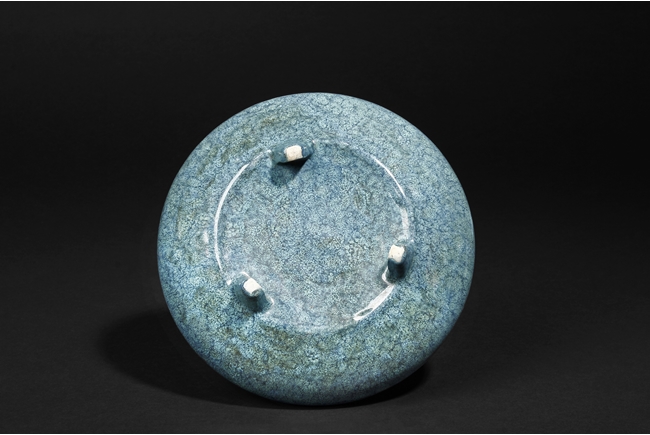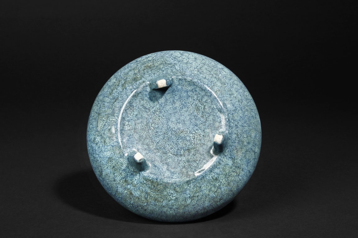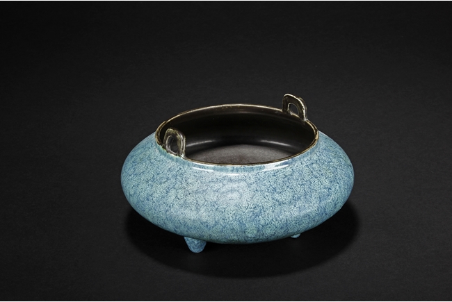 Of compressed bombe form, the censer is supported by three short feet, the body is covered with an attractive turquoise glaze, with two bronze handles rising from the rim. Qing Dynasty period.
