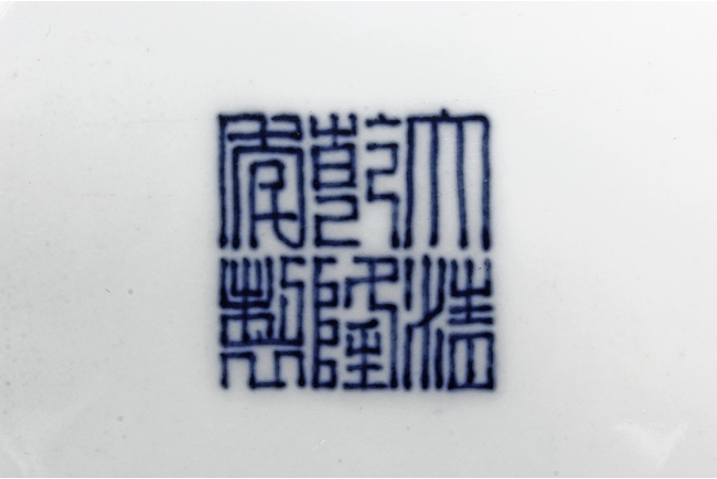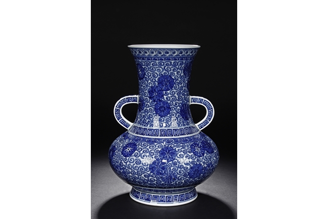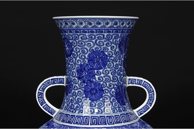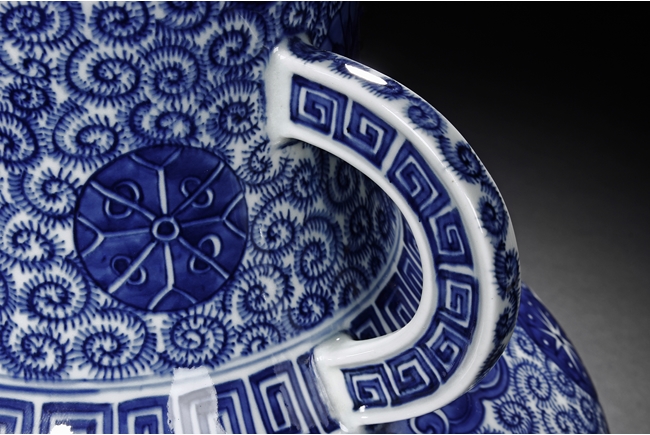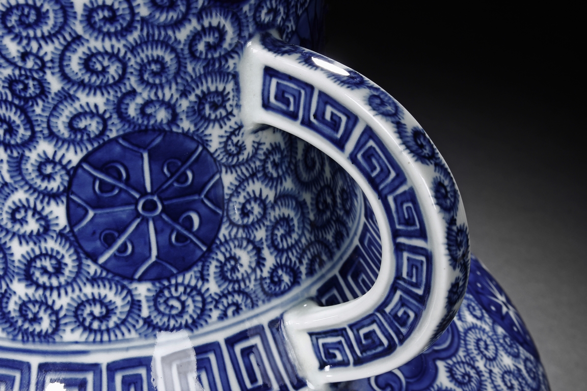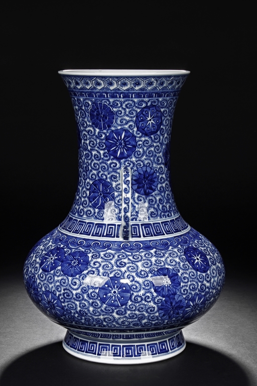 The body of flattened ovoid form, with waisted but still wide neck, with flared rim and splayed ring foot, the body decorated with flowers and vines patterns, the handle, shoulder, and foot decorated with key-fret patterns, the bottom bears six character "DAQING QIANLONG NIANZHI" mark.