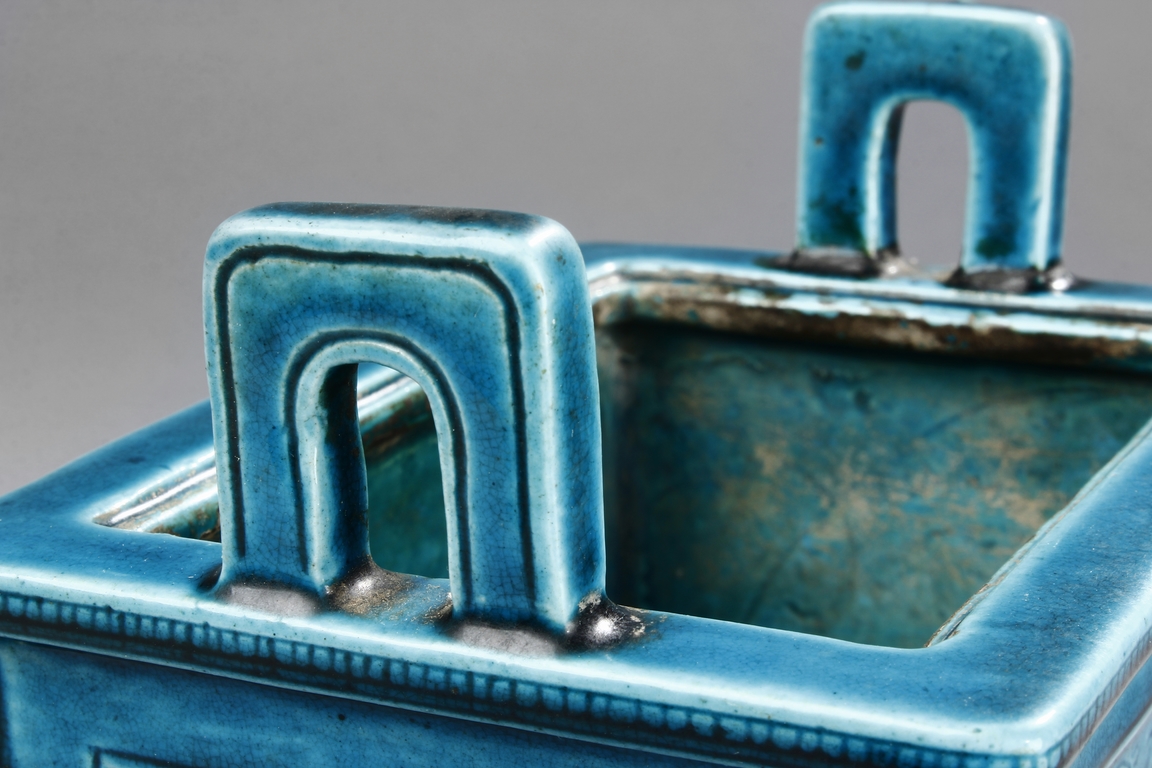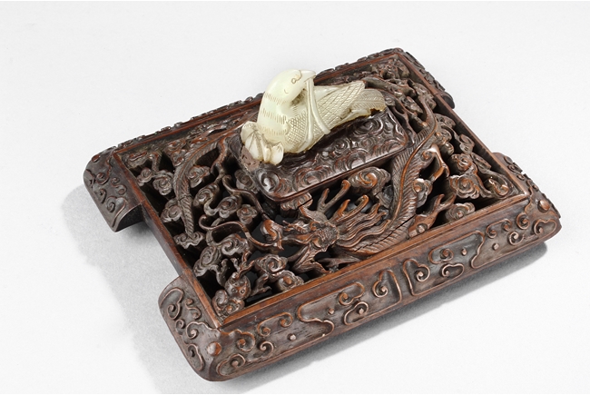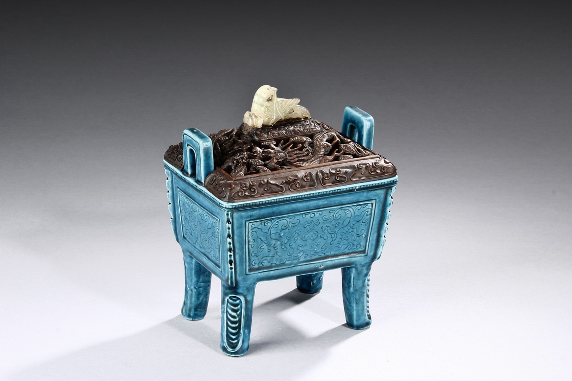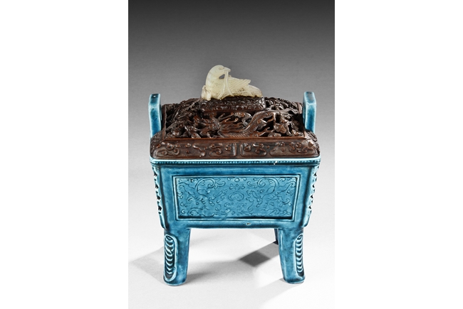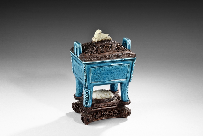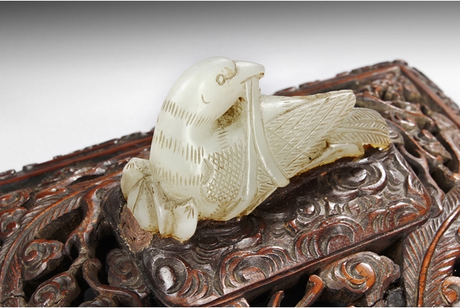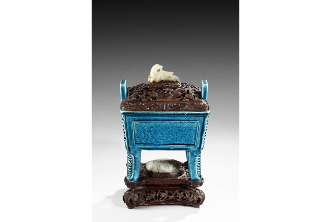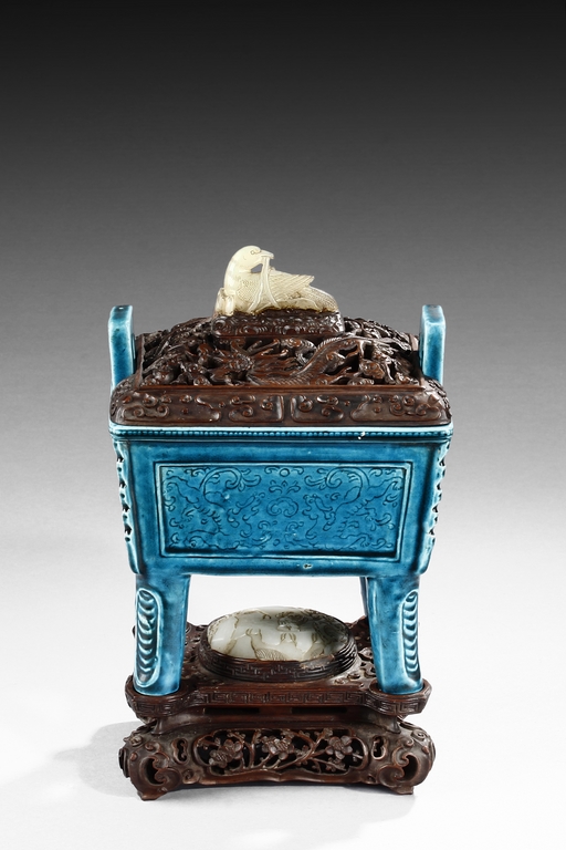 The rectangular vessel supported on four legs, decorated on each side with two confronted stylized mythical beasts, with raised flanges on the four corners, the rim is decorated with beaded pattern. The cover is of elaborate openwork of dragon amid clouds design, topped with a white jade carved bird finial. The stand is inlaid on top with a white jade medallion with low-relief figural scene, and delicately decorated in openwork with foliage on the each side. Qing Dynasty period.