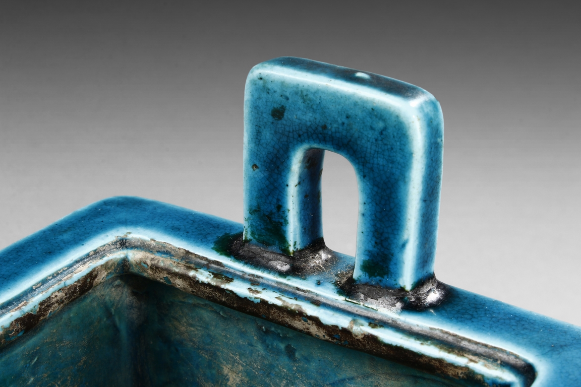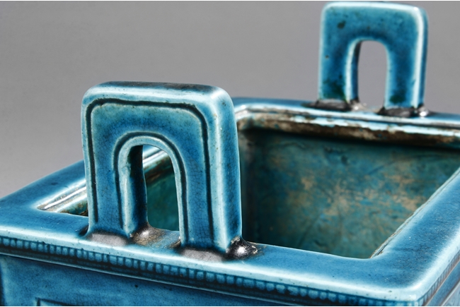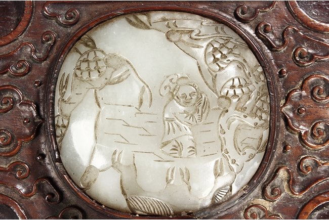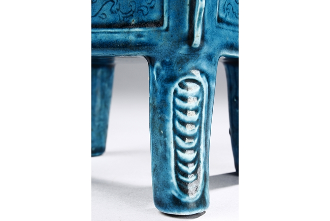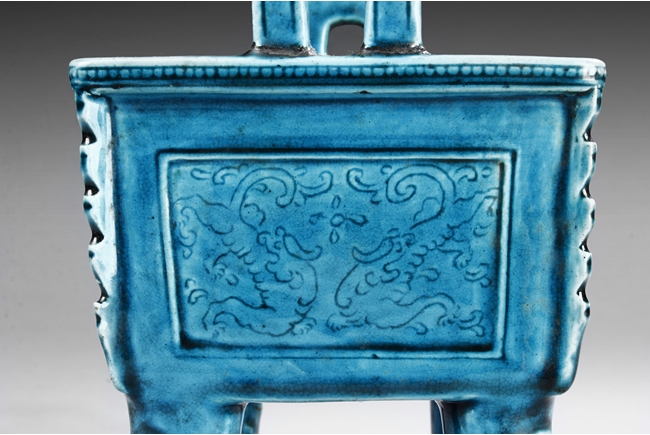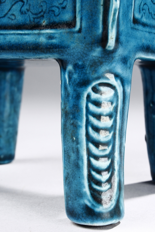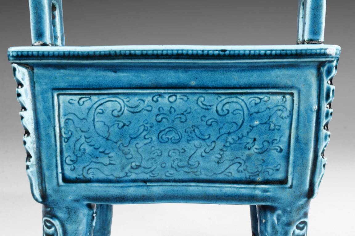 The rectangular vessel supported on four legs, decorated on each side with two confronted stylized mythical beasts, with raised flanges on the four corners, the rim is decorated with beaded pattern. The cover is of elaborate openwork of dragon amid clouds design, topped with a white jade carved bird finial. The stand is inlaid on top with a white jade medallion with low-relief figural scene, and delicately decorated in openwork with foliage on the each side. Qing Dynasty period.