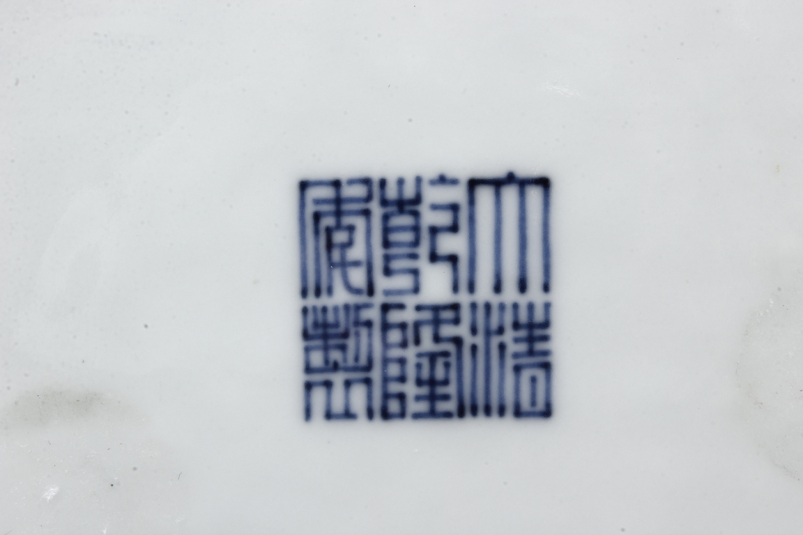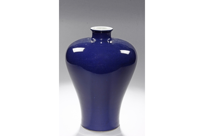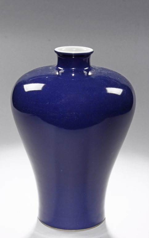 Covered in brilliant cobalt-blue and stopping neatly above rim, the meiping vase has a high and wide rounded shoulder, elegantly tapering to slightly splayed feet, the interior and bottom glazed in white, and bottom bears six character "DAQING QIANLONG NIANZHI" mark. Qing Qianlong Dynasty period.