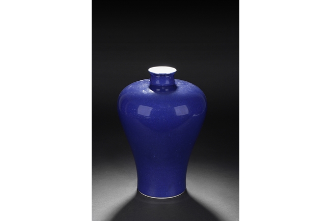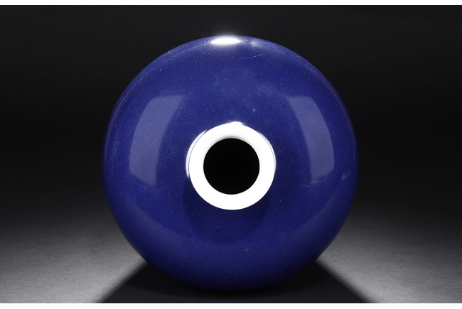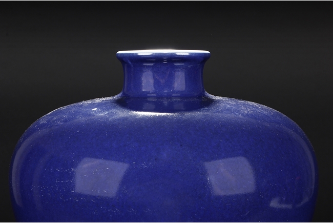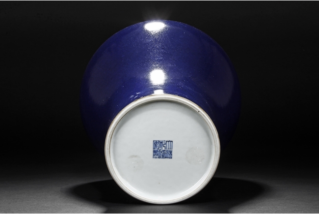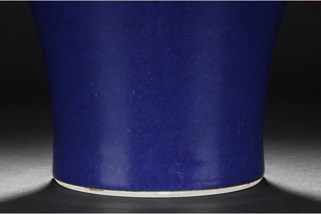 "此瓶唇口,短頸,豐肩,弧壁,圈足,底施白釉。瓶身通體施霽藍釉,釉質肥腴,色澤深沉凝重,瑩潤亮澤,釉面橘皮棕眼密布,口沿一線燈草口,為整器平添幾分寧謐之趣,具有鮮明的時代特征。器形端莊典雅,線條柔美,收放自如,正合乾隆瓷器靈秀風韻,觀之確有增一分則拙、減一分則陋之感。底落“大清乾隆年制"六字三行篆書款。霽藍釉燒制工藝繼承元代傳統,至清朝生產歷代未斷,且燒制精細,常見造型乃宮廷祭器和陳設用瓷。其特點釉面不流不裂,色澤濃淡均勻,呈色穩定。明清時期,霽藍釉因其肅穆寧靜的顏色與北京天壇祈年殿上琉璃瓦之色相合,極適用於這種天人相接的祭祀場合,故專用於祭天,燒造數量極為有限。此瓶造型端莊古樸,釉色均勻純淨,藍如深海,雖無紋飾,但高貴之氣難掩,是清代梅瓶之精品。"