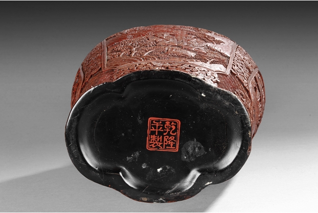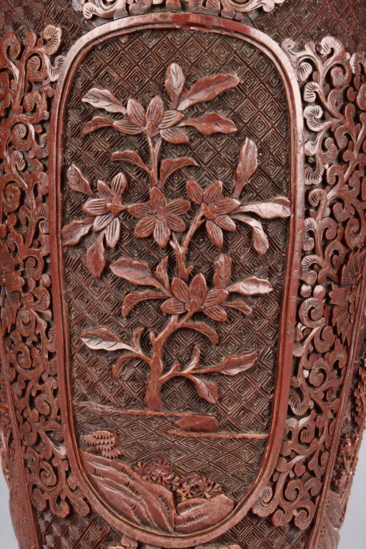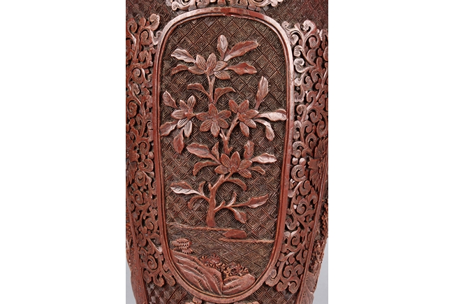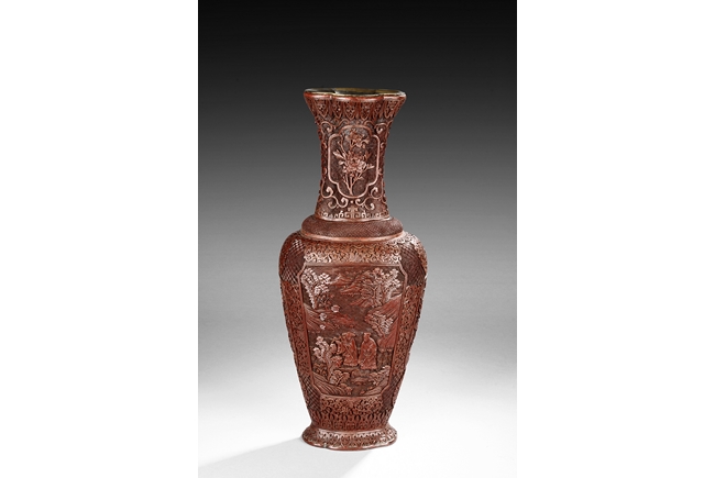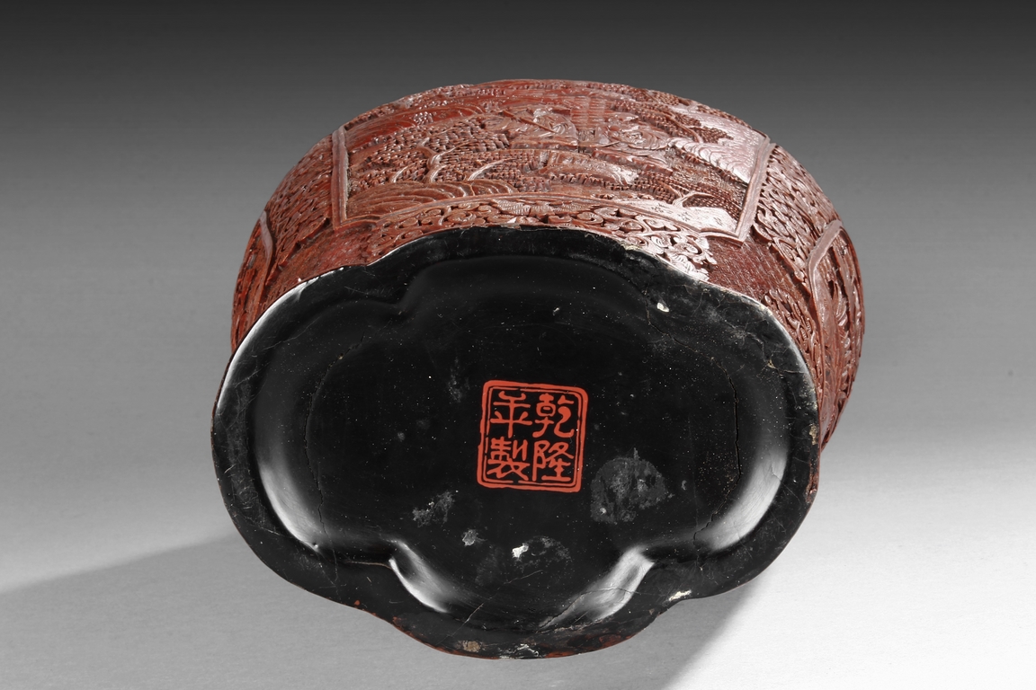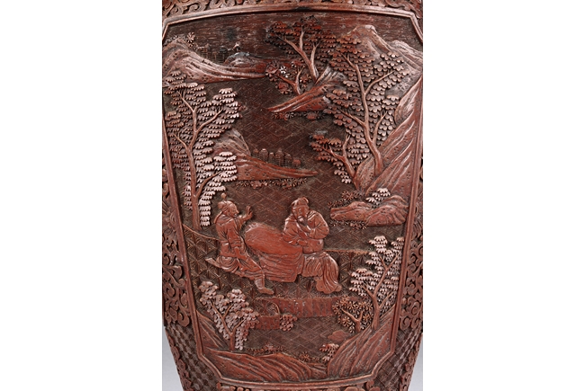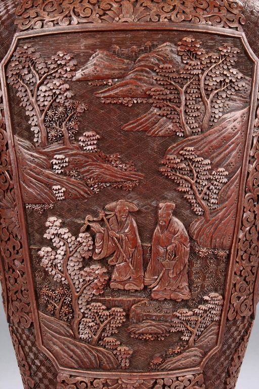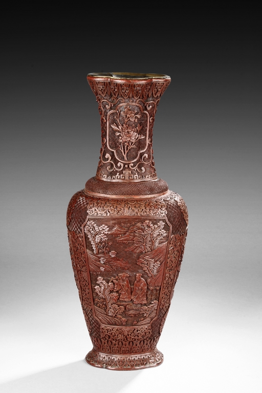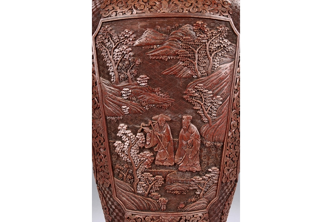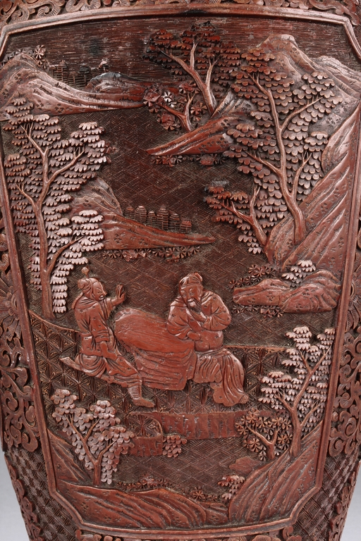 Of oval section, this vase raises from a spreading foot with a tapering body. The lobes of the body is carved with panels of old gentlemen conversing in the context of mountain and river landscape, and two gentlemen sitting and conversing on the reverse all between borders of floral decorations. The neck is further decorated with floral panels. The bottom bears a four character' Qianlong' mark. Qing Qianlong Dynasty period.