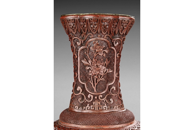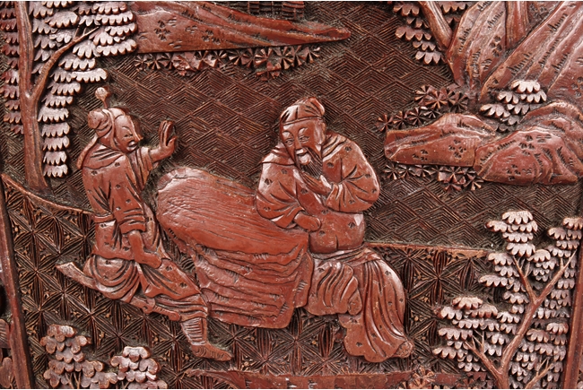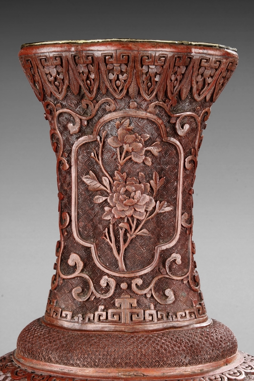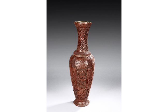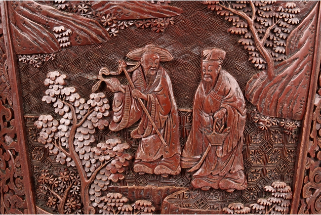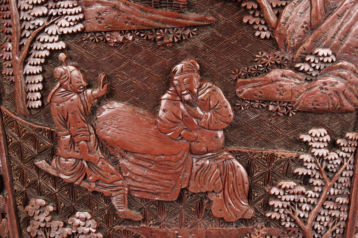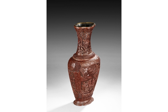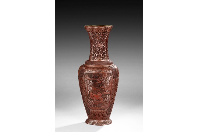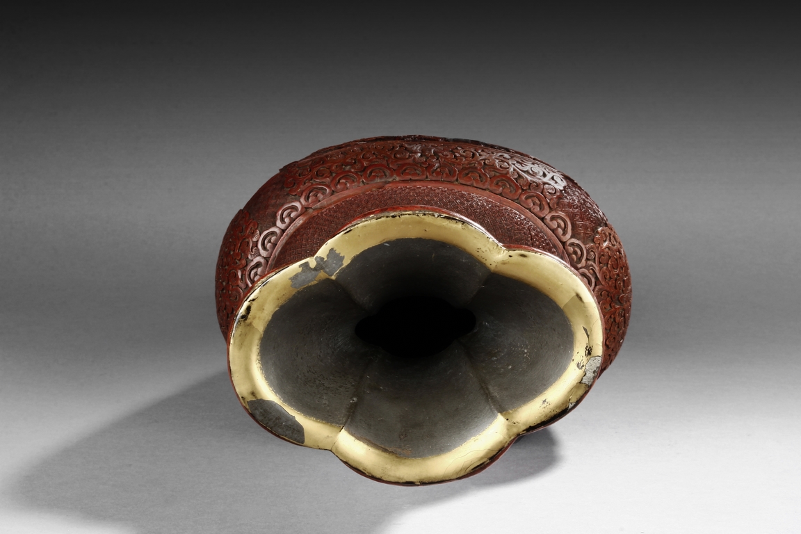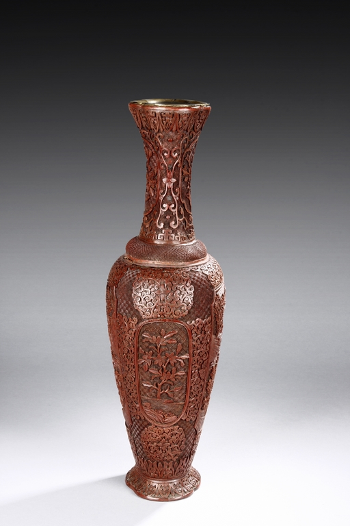 Of oval section, this vase raises from a spreading foot with a tapering body. The lobes of the body is carved with panels of old gentlemen conversing in the context of mountain and river landscape, and two gentlemen sitting and conversing on the reverse all between borders of floral decorations. The neck is further decorated with floral panels. The bottom bears a four character' Qianlong' mark. Qing Qianlong Dynasty period.