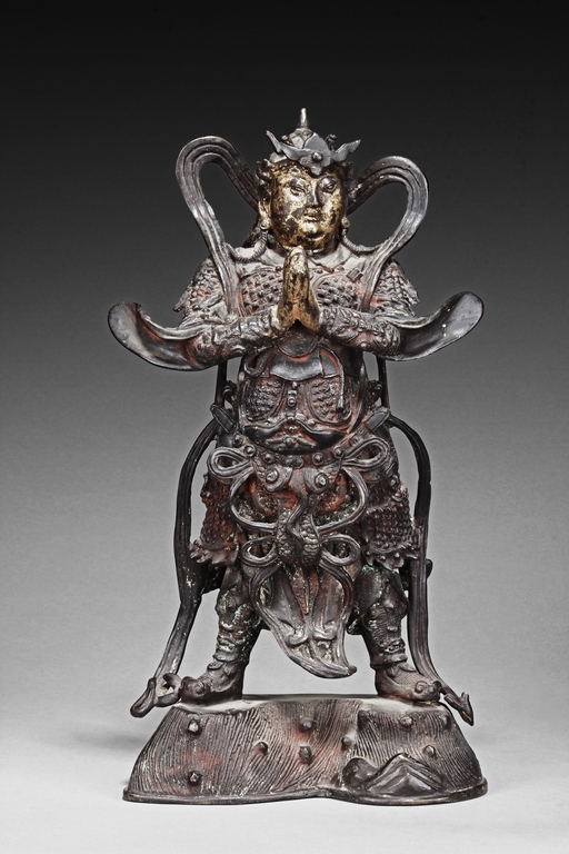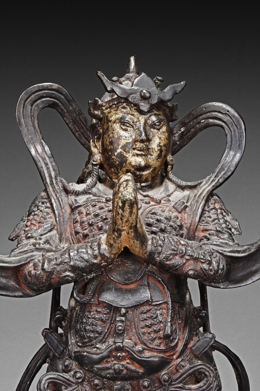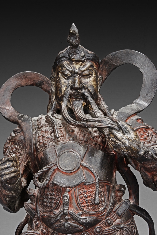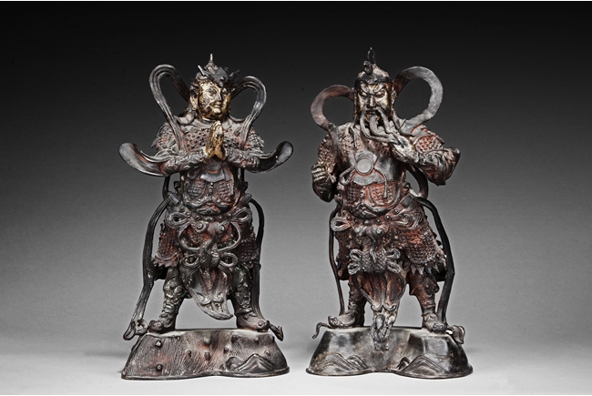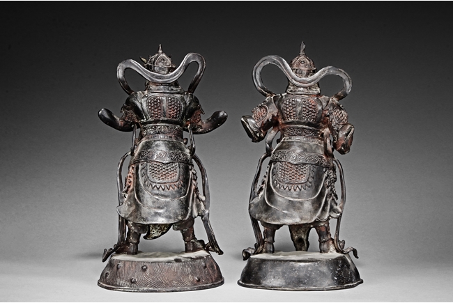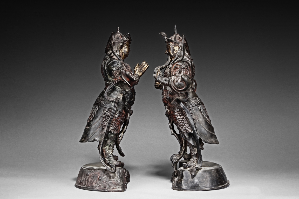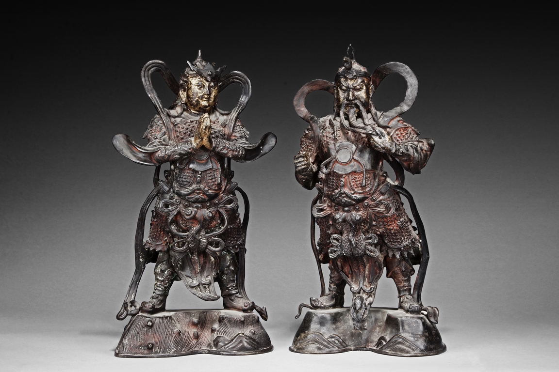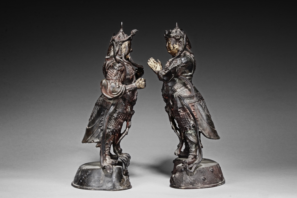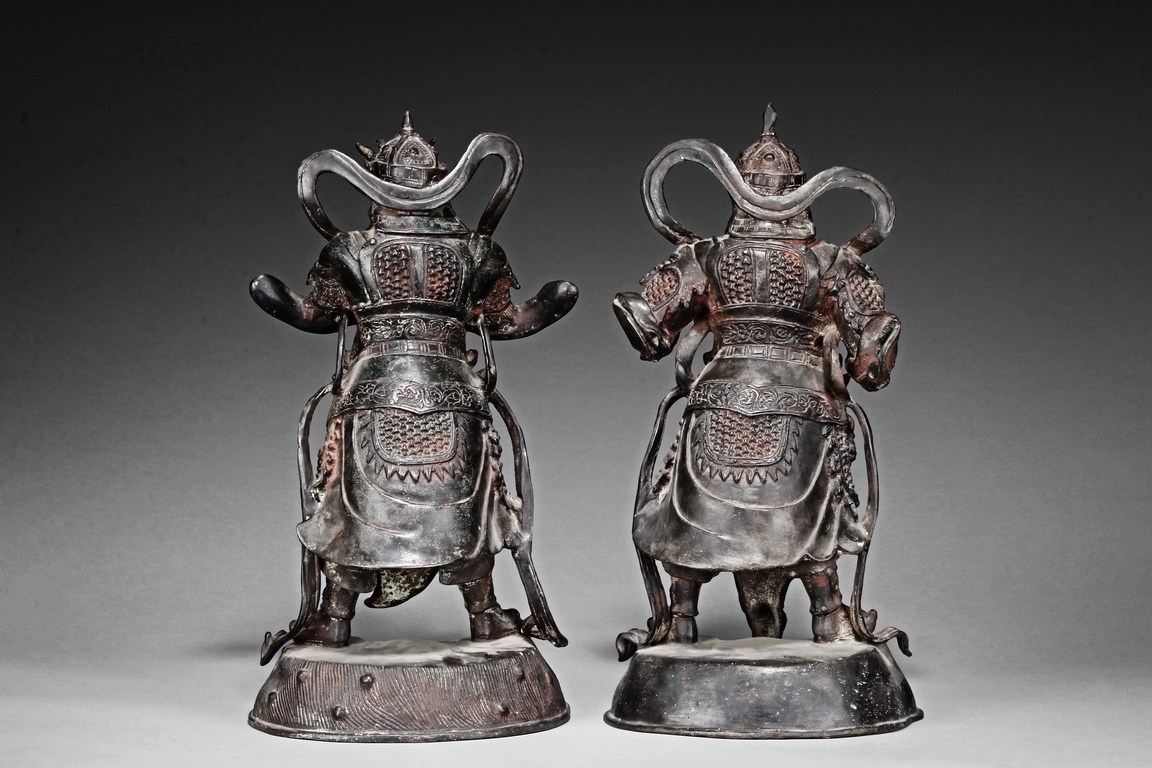 Each figure is heavily cast with stern expression, mounted standing on bronze stand and modelled wearing elaborate chain-mail armor with legs slightly apart and celestial ribbon over the shoulder, one with hands clasping together, the other touching the beard, with traces of gilt and red pigments remaining. Qing Dynasty period.