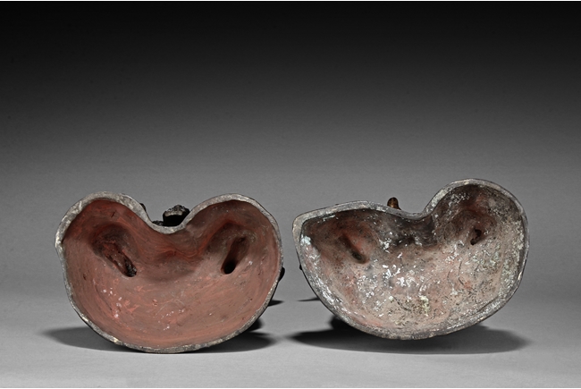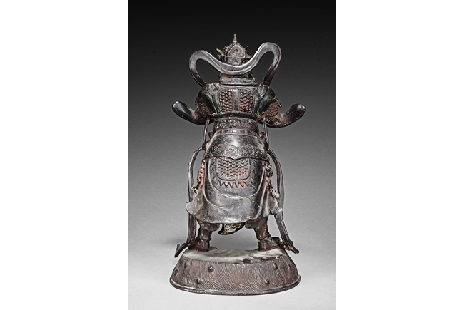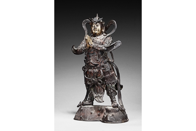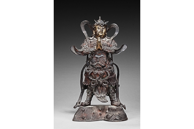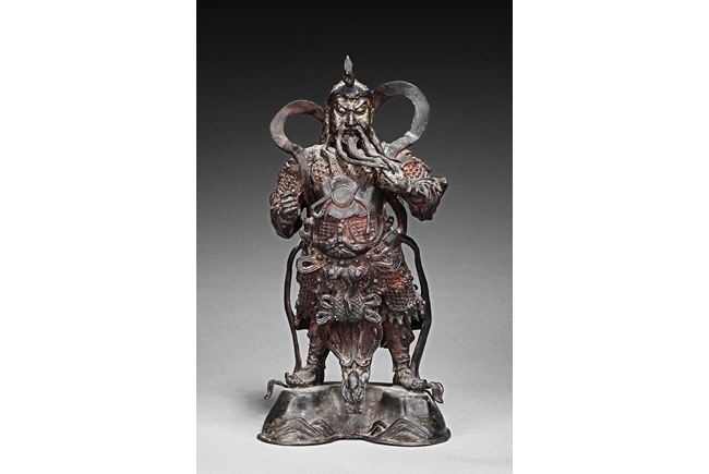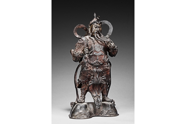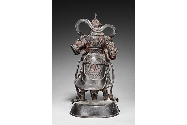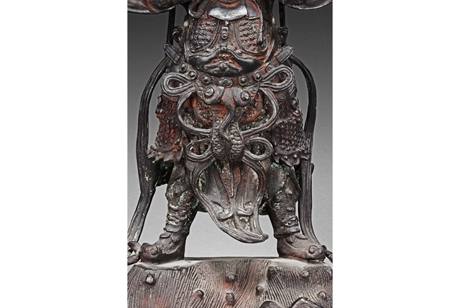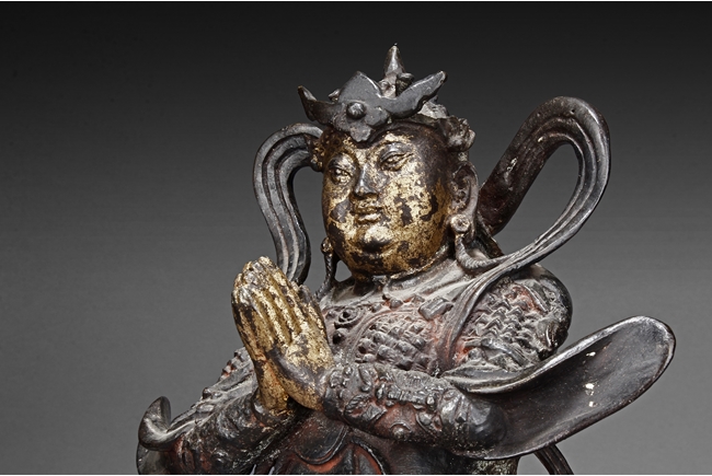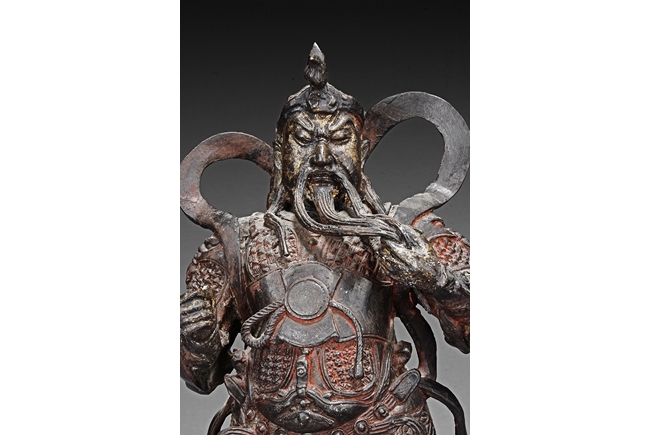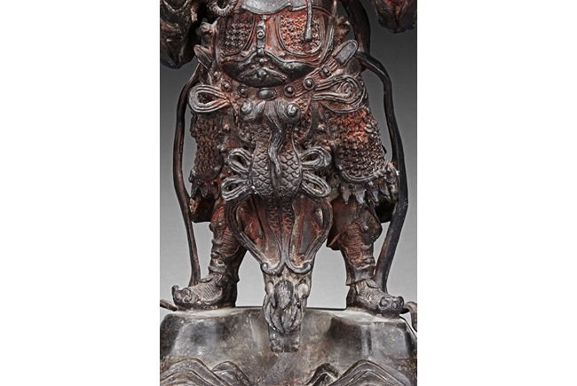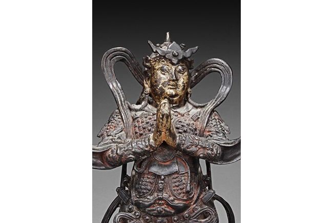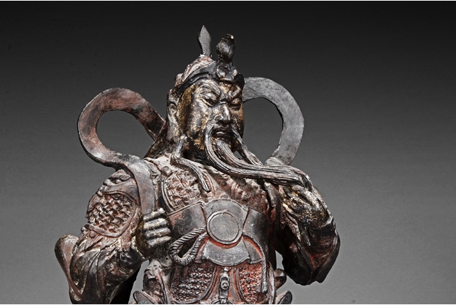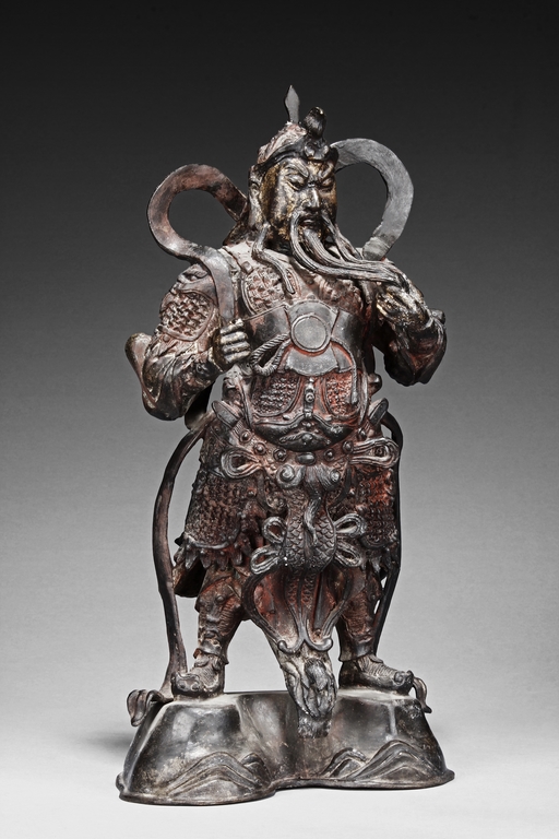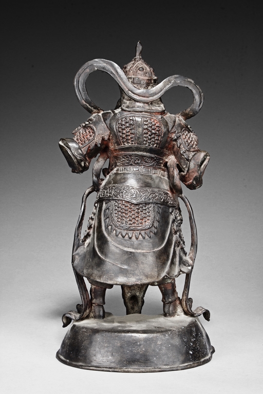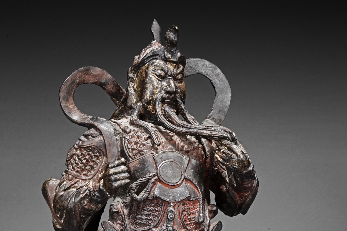 Each figure is heavily cast with stern expression, mounted standing on bronze stand and modelled wearing elaborate chain-mail armor with legs slightly apart and celestial ribbon over the shoulder, one with hands clasping together, the other touching the beard, with traces of gilt and red pigments remaining. Qing Dynasty period.