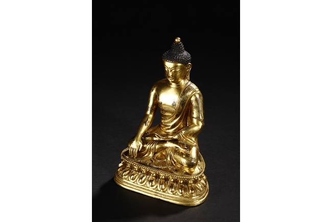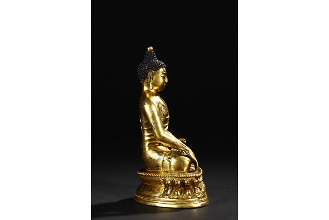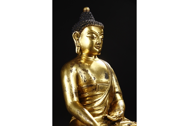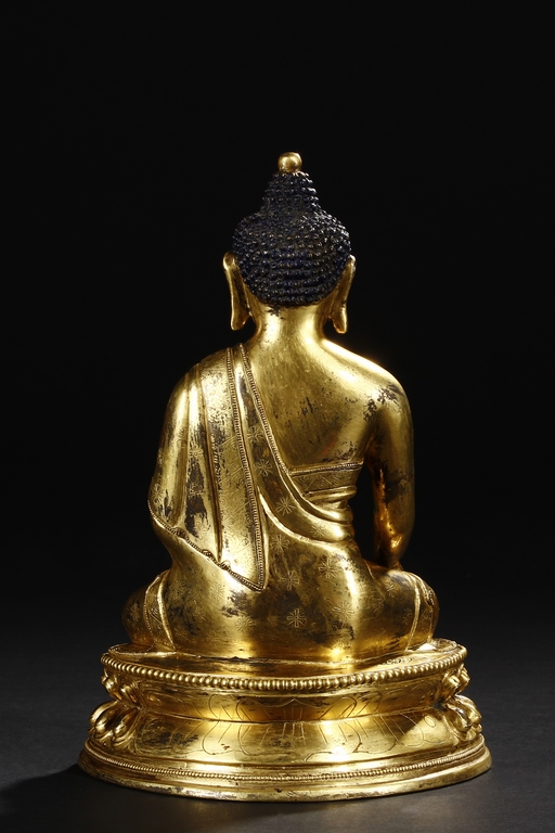 Seated in dhyanasana on a double lotus, his right hand is in bhumisparsha mudra and right hand resting on the lap while dressing in sanghati with elegant folds, his face is depicted with a calm expression with downcast eyes, and hairs in tight curls over ushinisha topped with a knop. 18th Century.