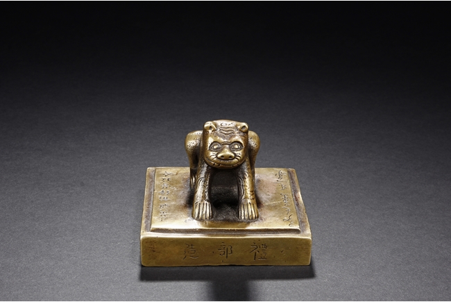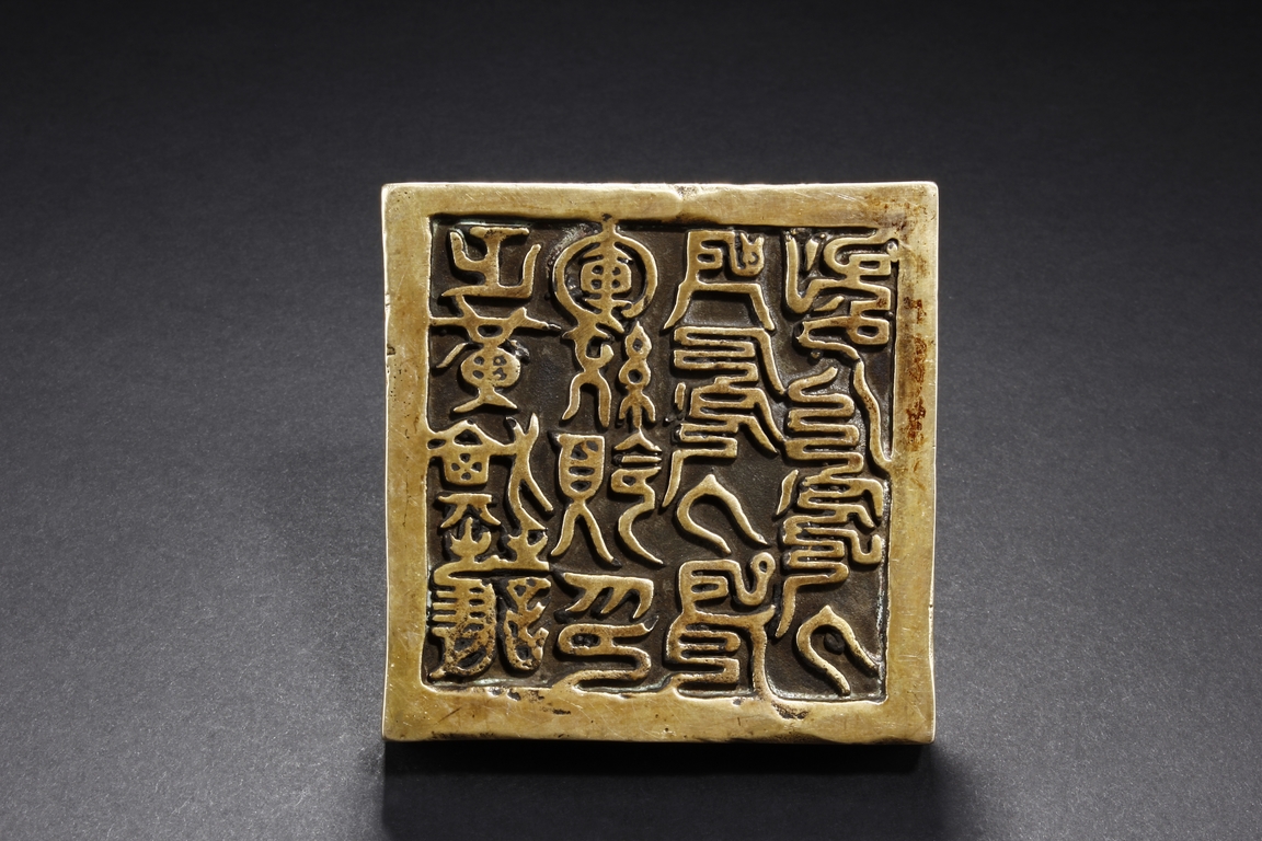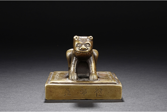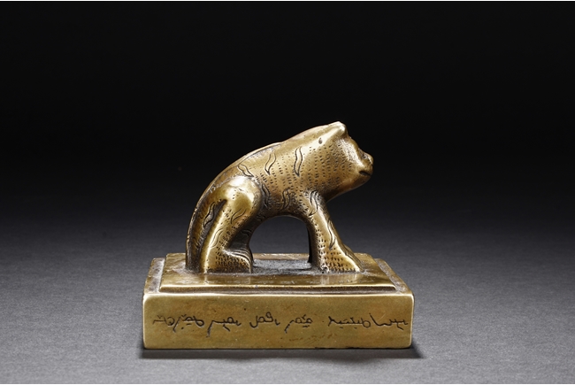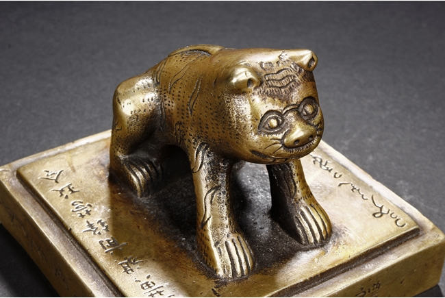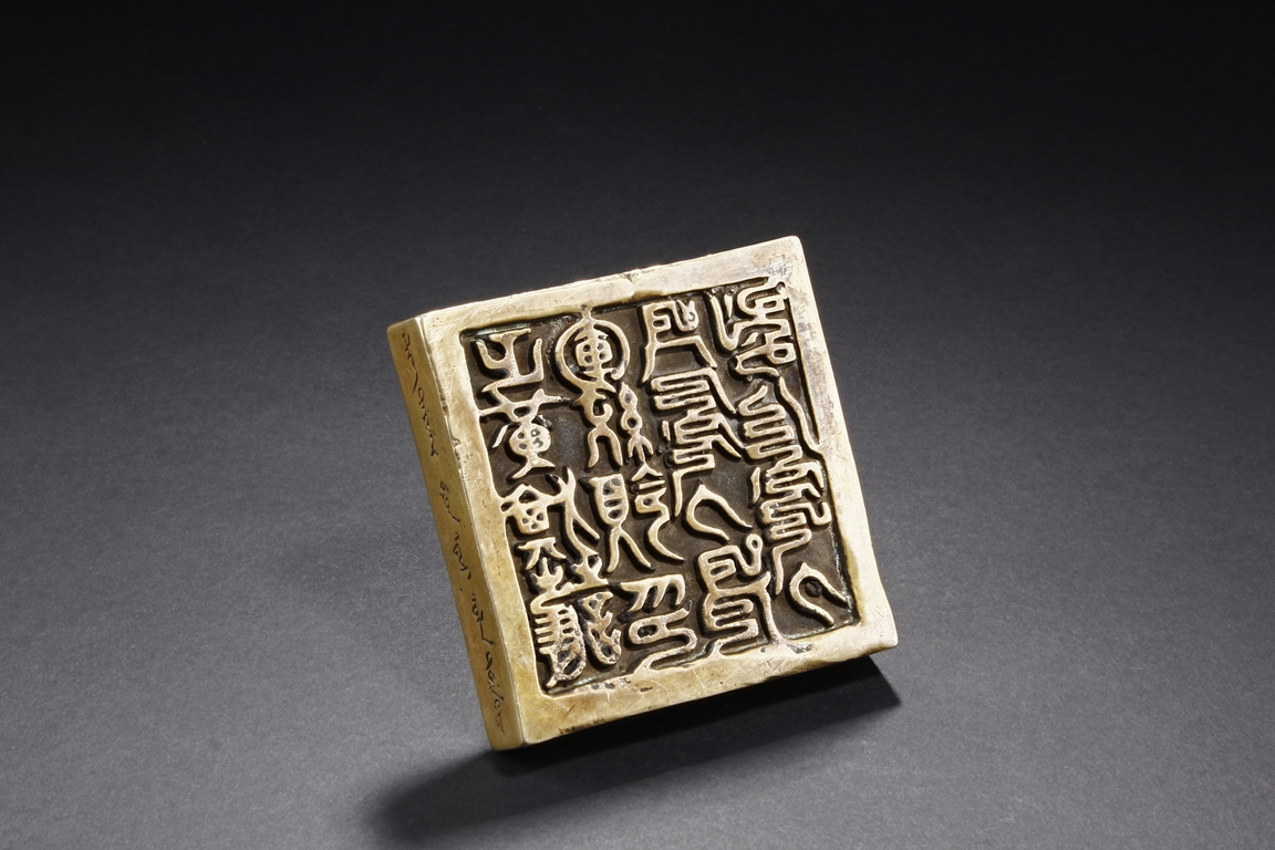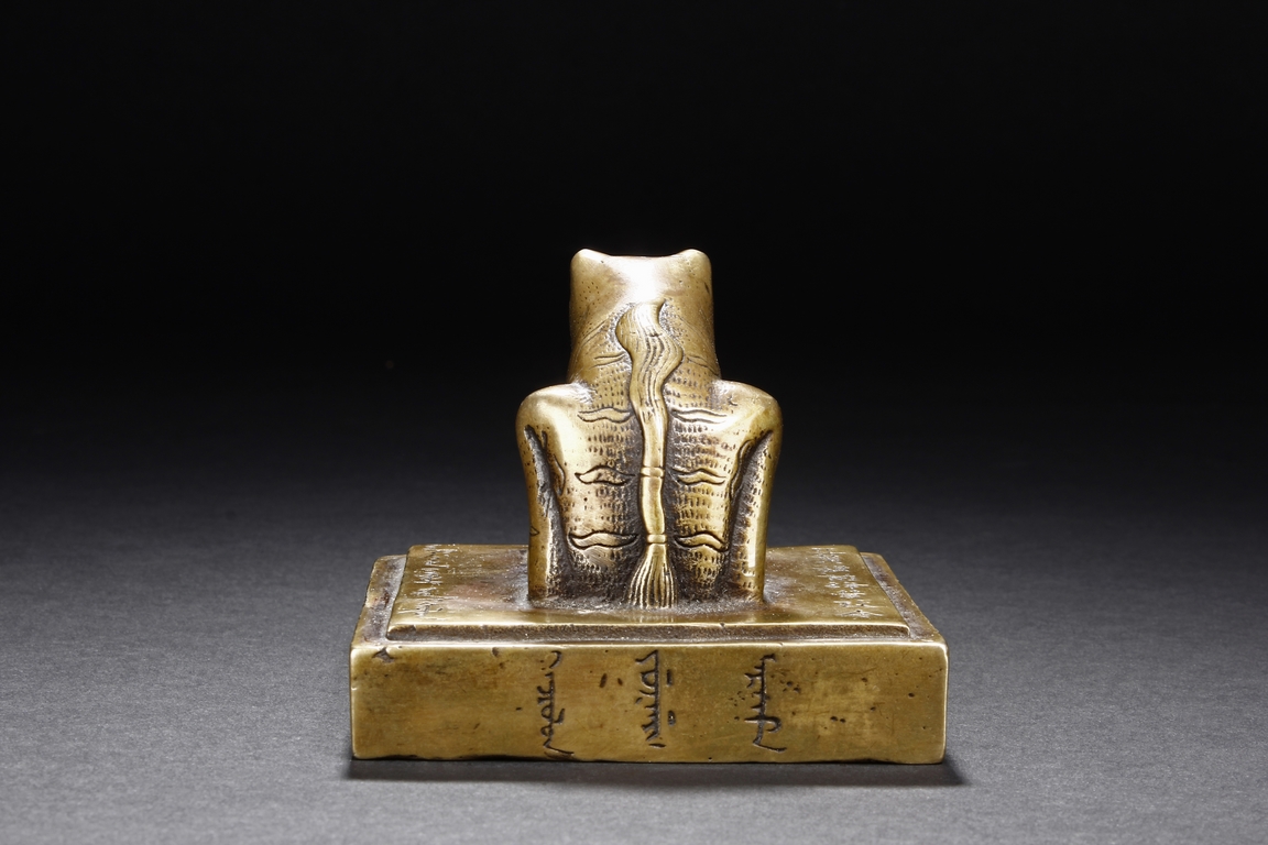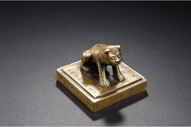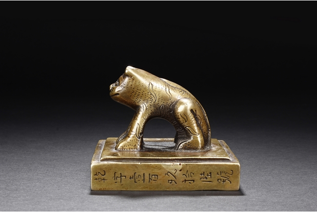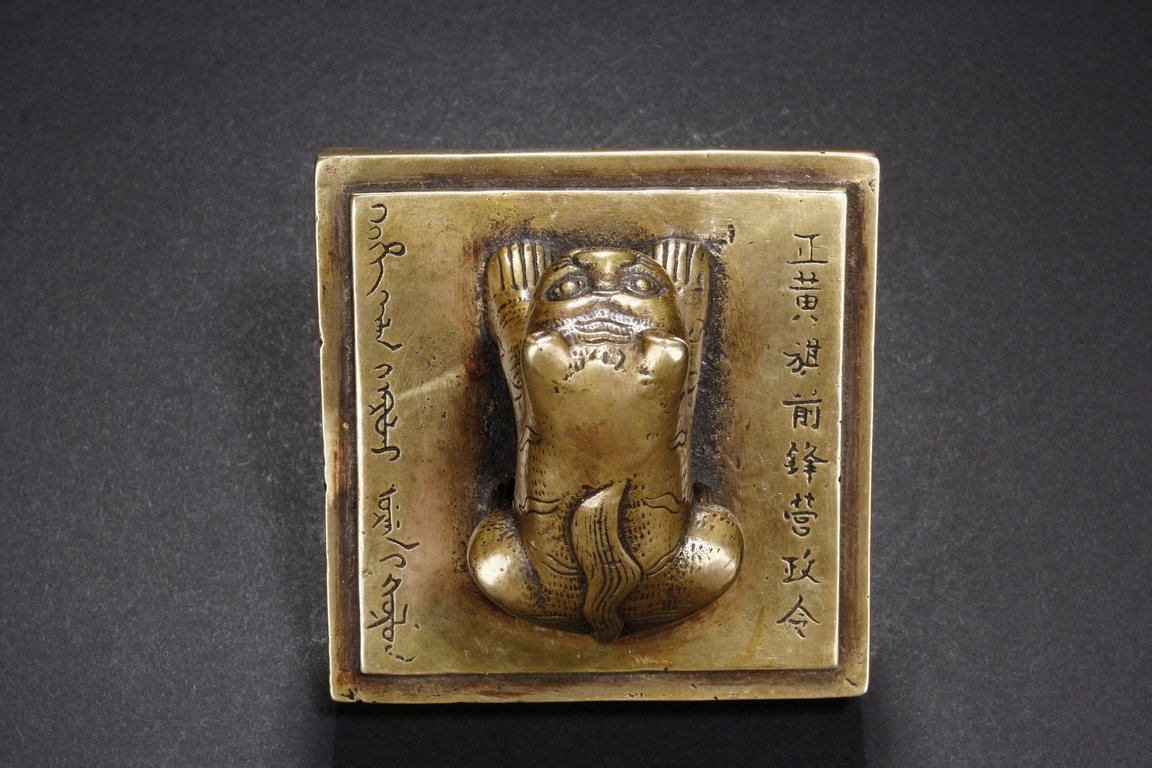 The flattened square bronze seal stamp has a mythical beast on the top with four feet on the ground, ready to pounce. Chinese and Manchurian characters on the side, and sixteen letter Chinese mark on the bottom. Qing Dynasty period.