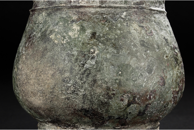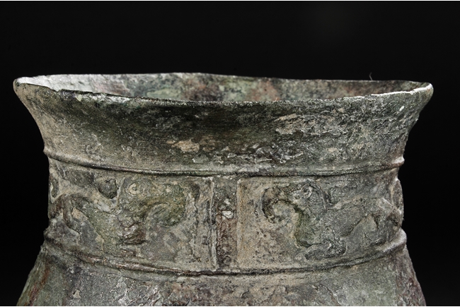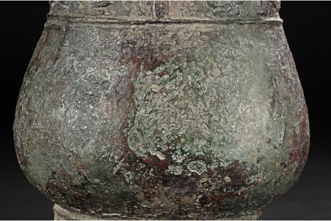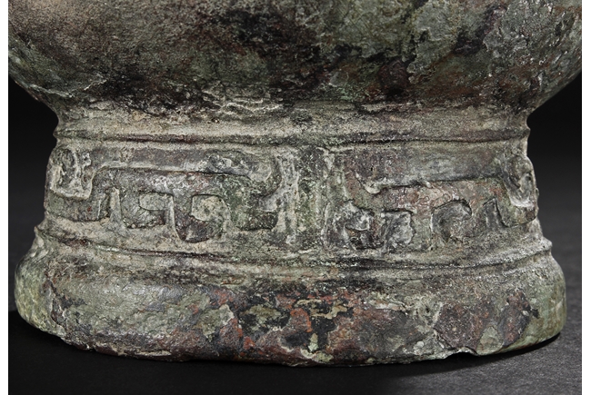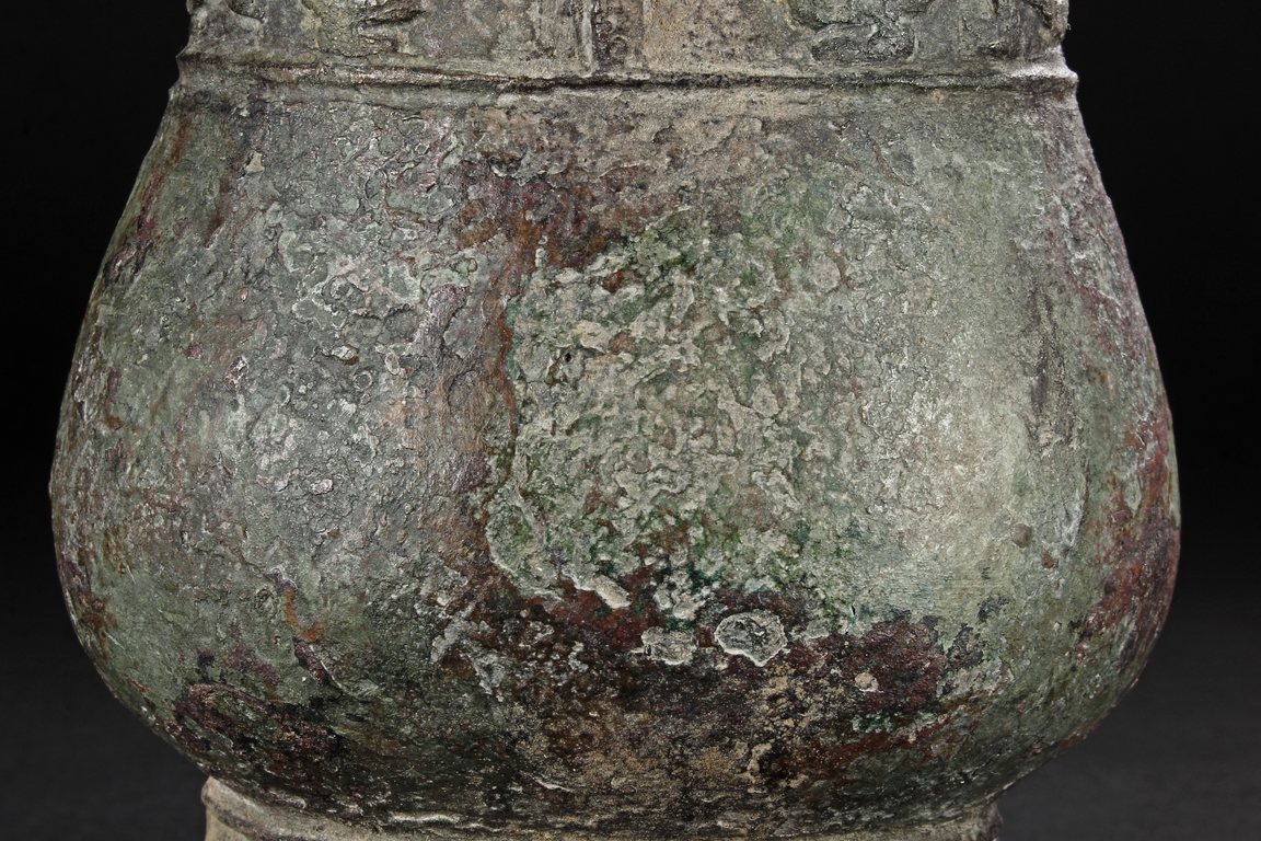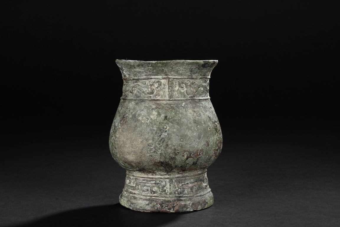 Of pear-shaped, the body is crisply cast carved in relief with a band of stylized mythical beasts between narrow raised borders. The bottom is cast with a similar band. The patina is mottled green with malachite encrustation. Western Zhou Dynasty period.