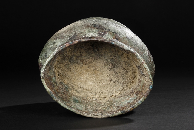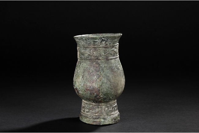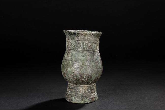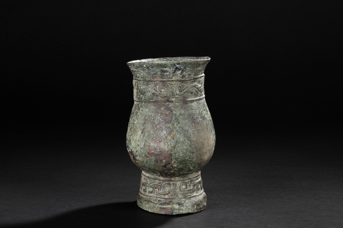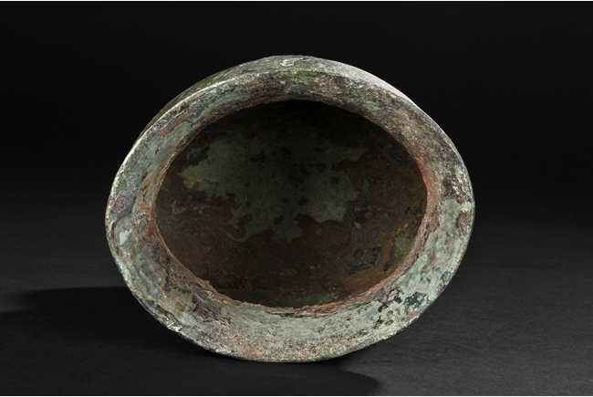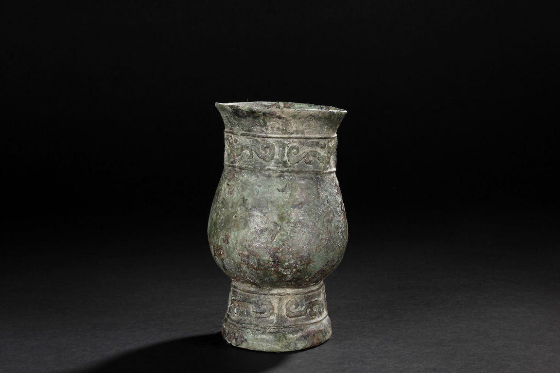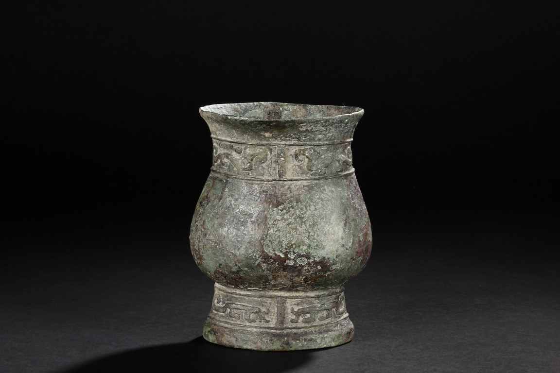 Of pear-shaped, the body is crisply cast carved in relief with a band of stylized mythical beasts between narrow raised borders. The bottom is cast with a similar band. The patina is mottled green with malachite encrustation. Western Zhou Dynasty period.