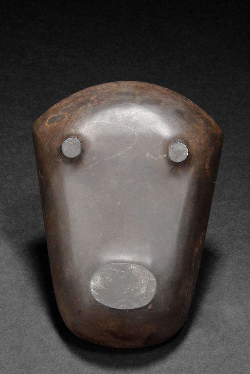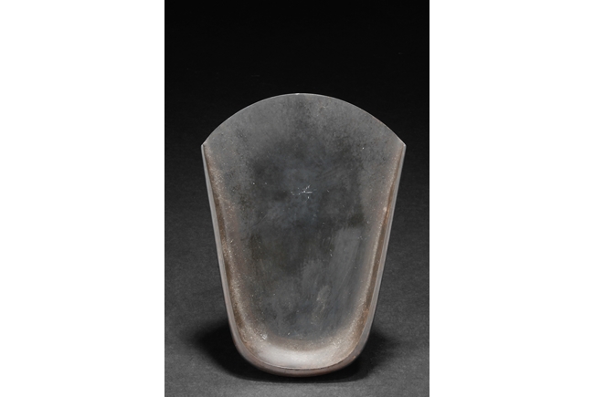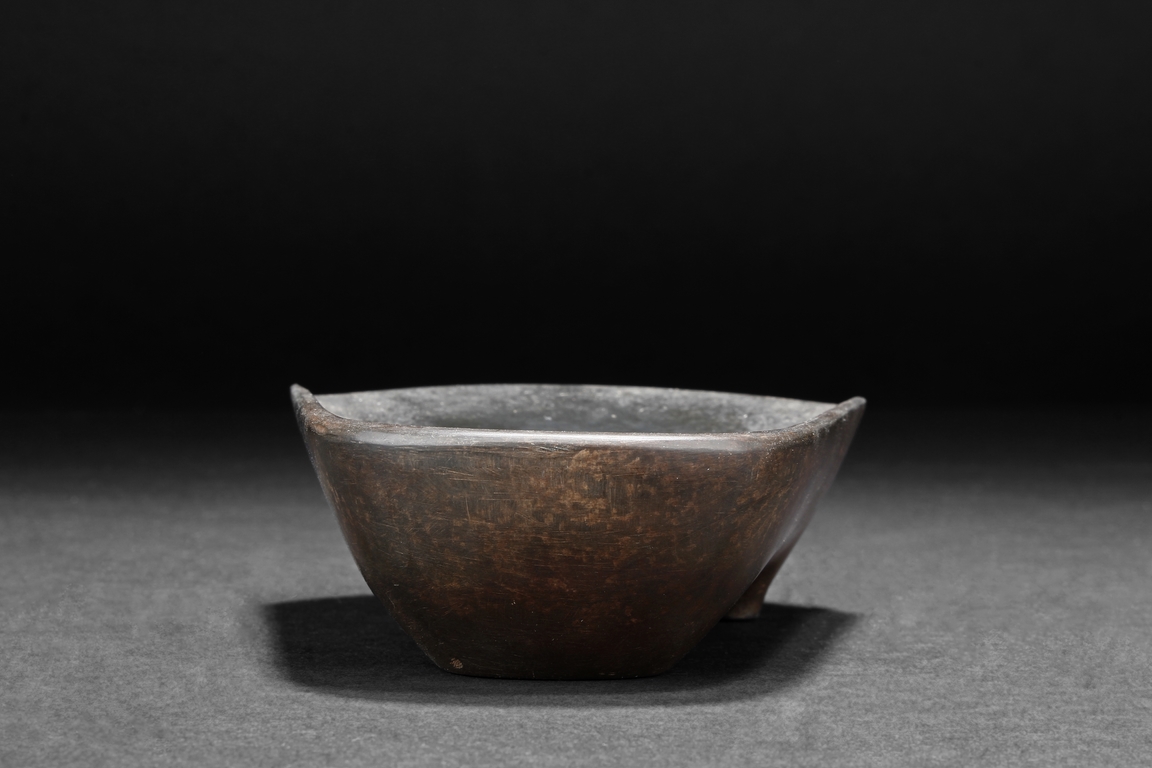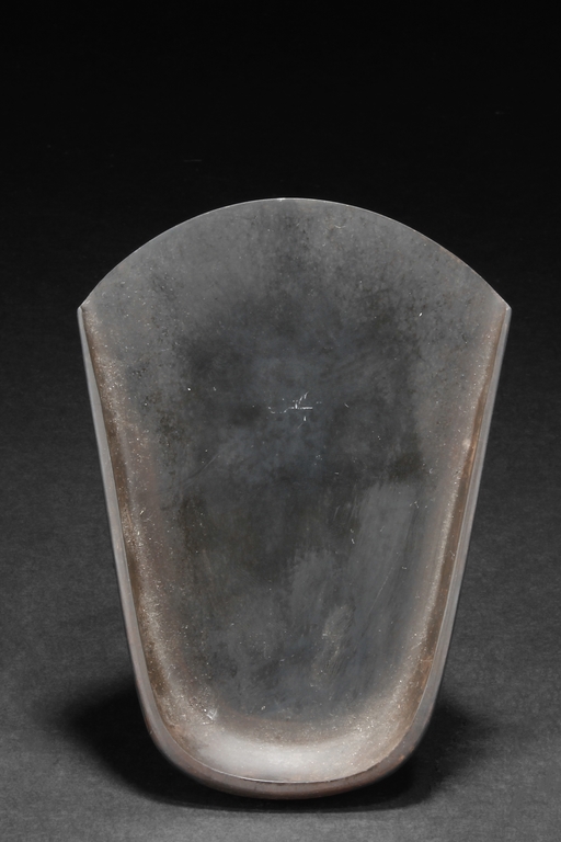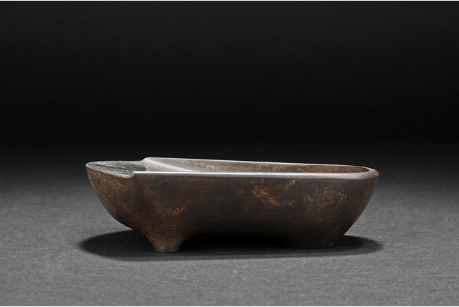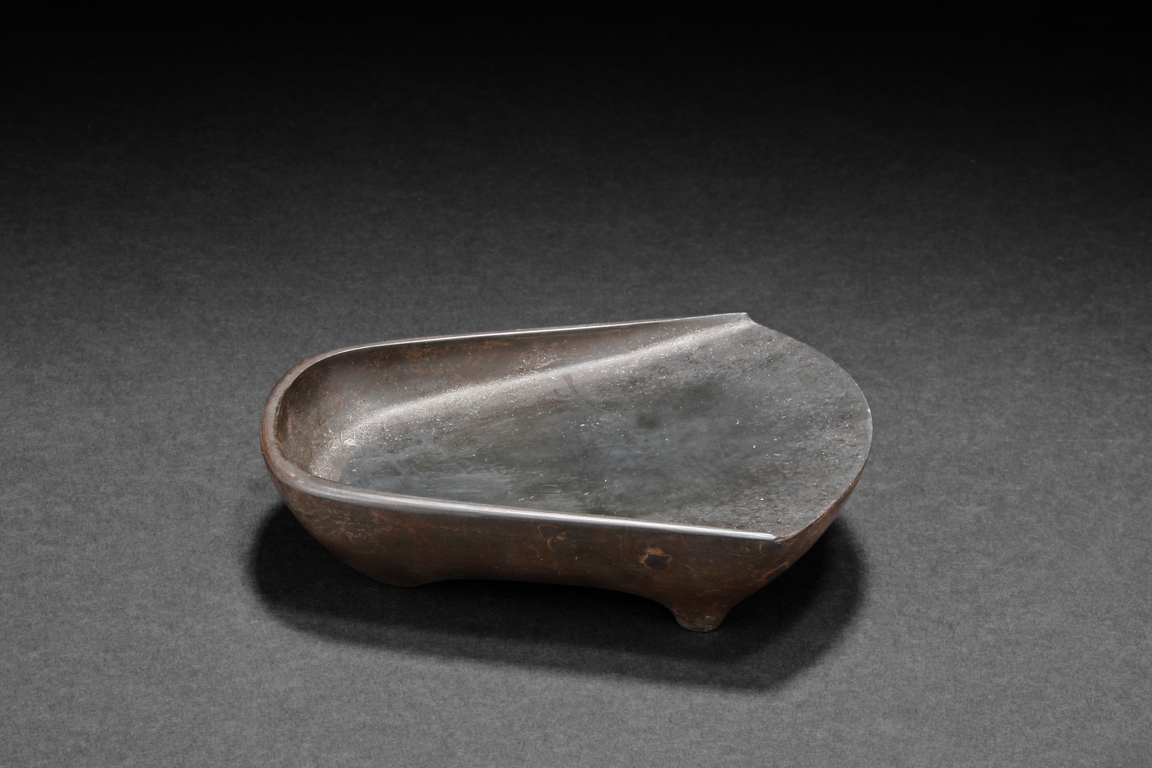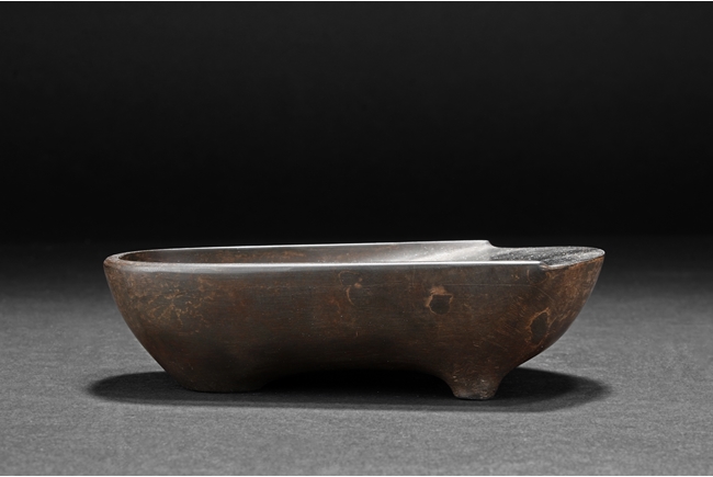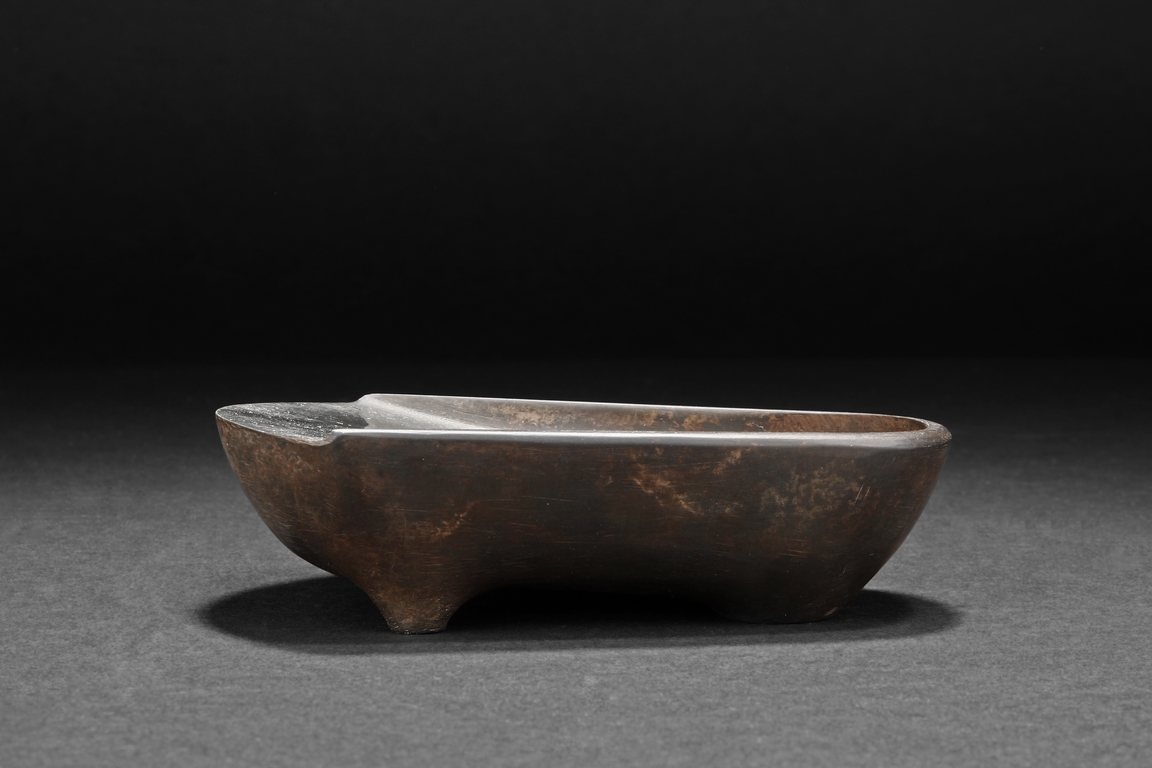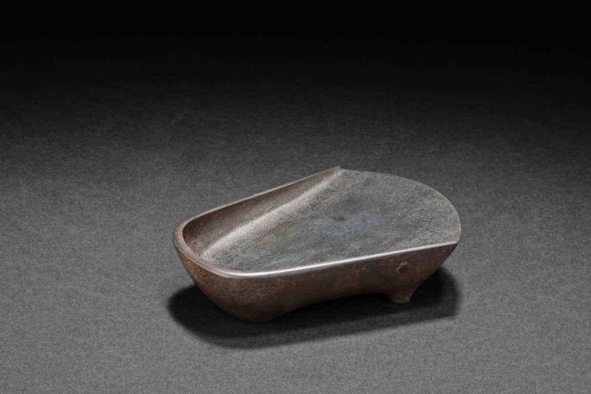 The ink stone shaped similar to reversed roof tile, supported by two small and one large flattened ovoid feet, with an angled basin on the top. Qing Dynasty period.