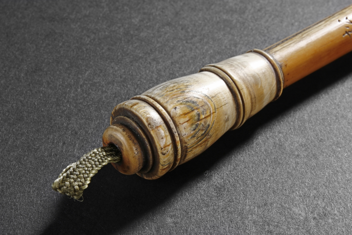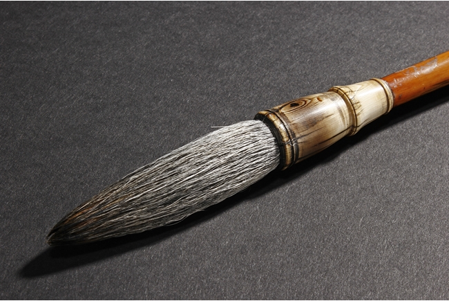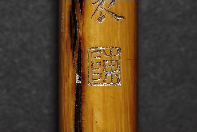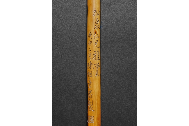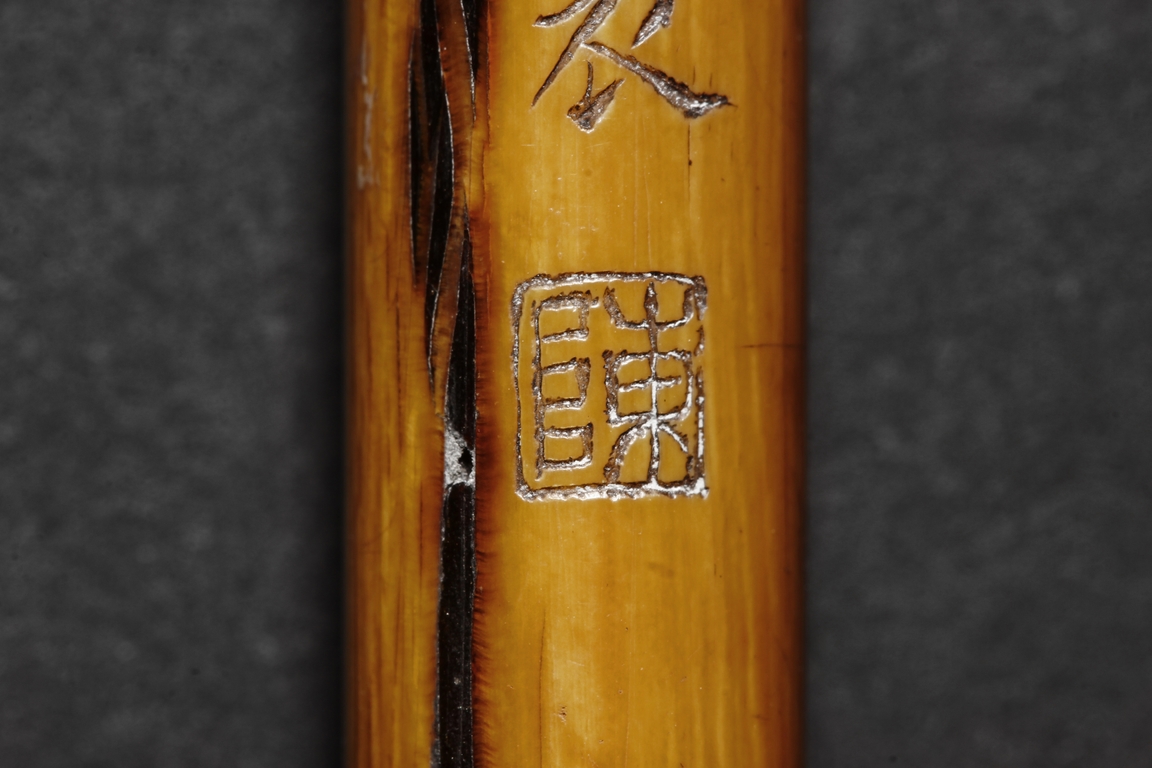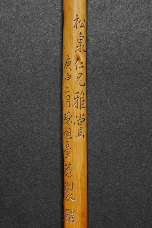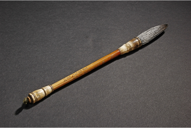 The slender, cylindrical brush is carved from ivory, the stalk with the artist's inscription including the date, name of the artist, and seal mark 'Chen'. Qing Dynasty period.