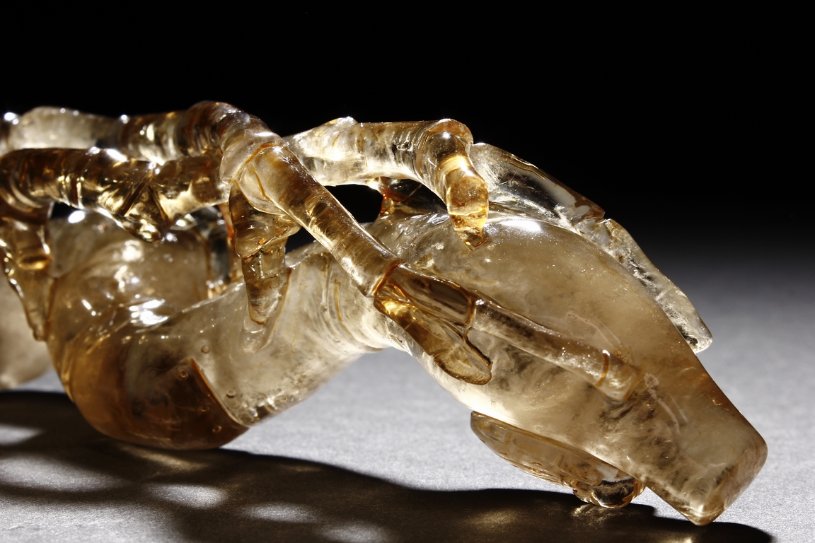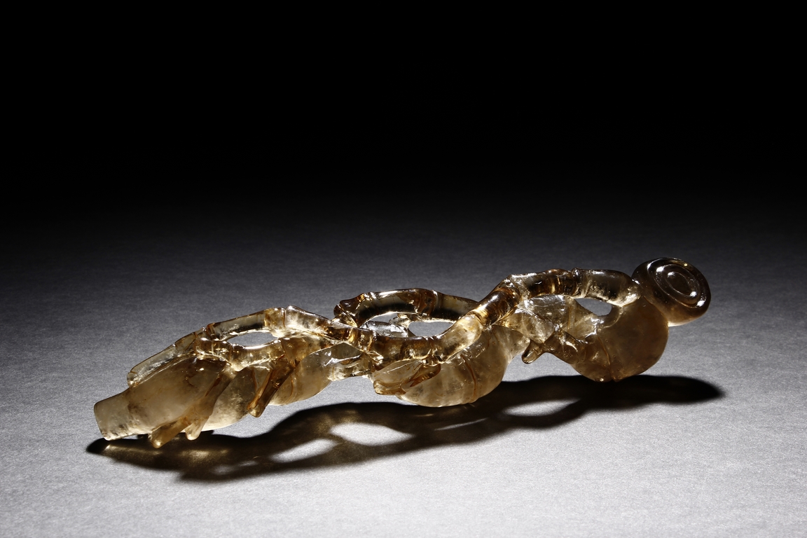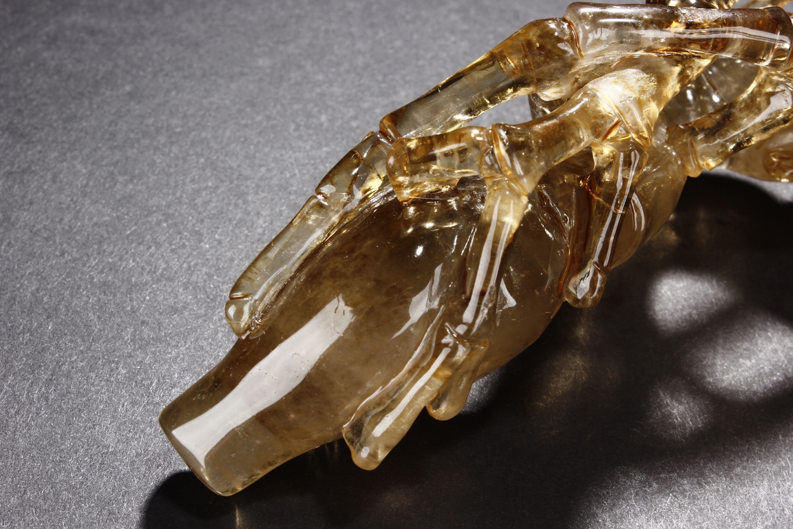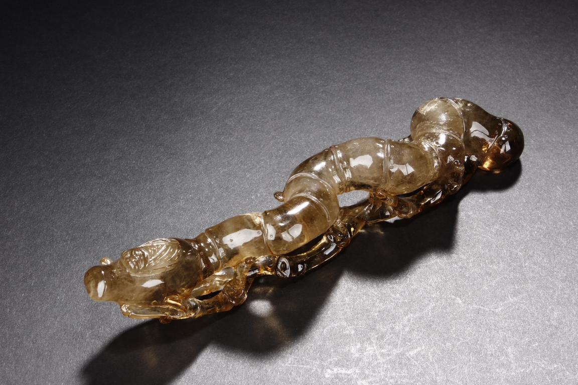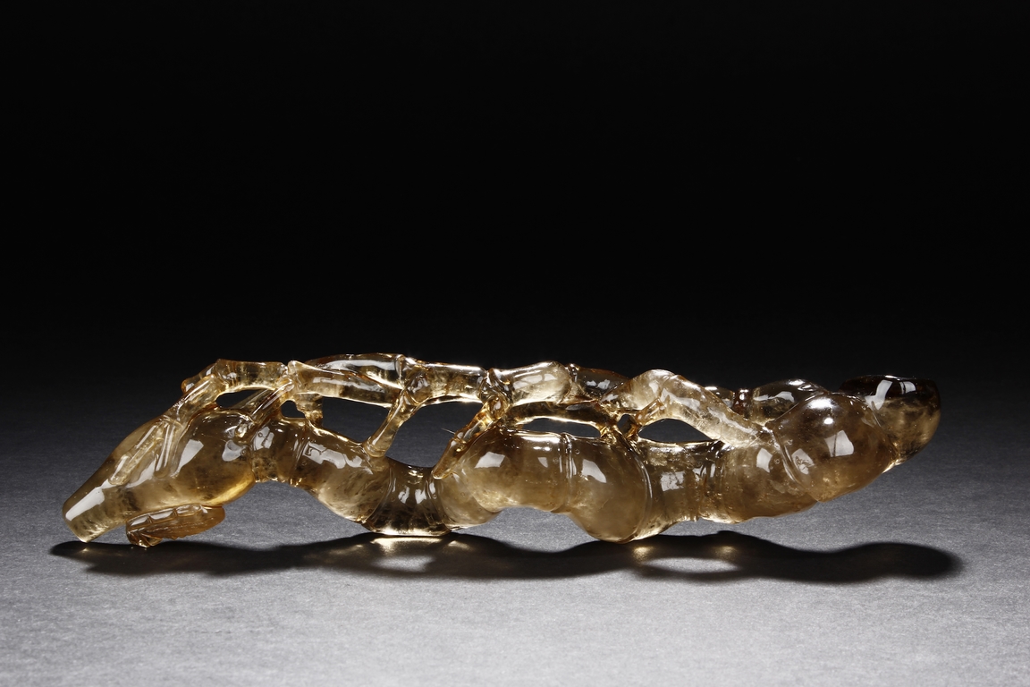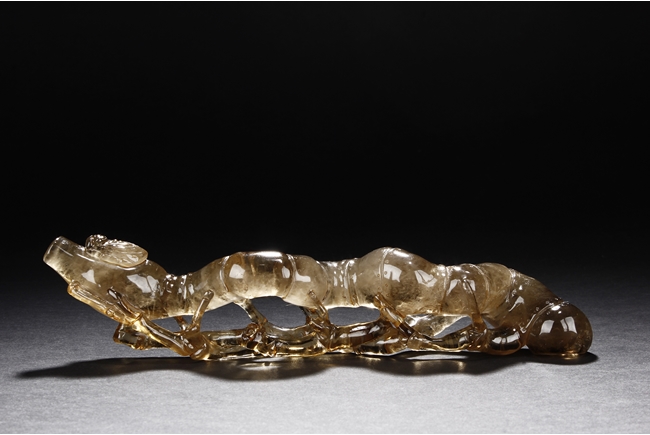 The brush rest made from yellow crystal, in the shape of intertwining bamboo branches, both old and new, to forming angled rest, a cicada rests on one end of brush rest. The color of grayish yellow tone with good translucency. Qing Dynasty period.
