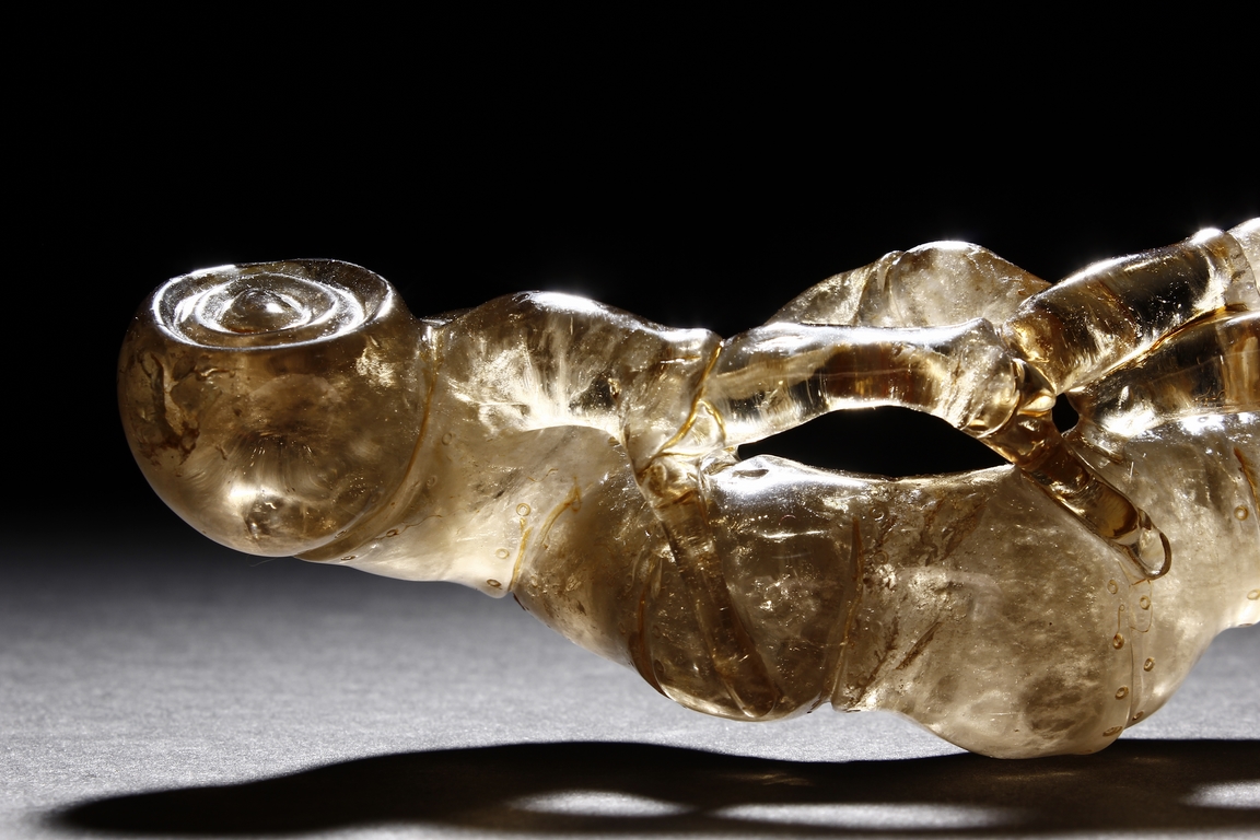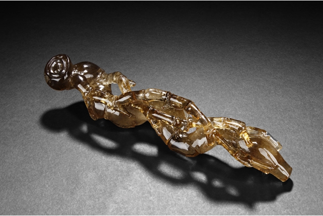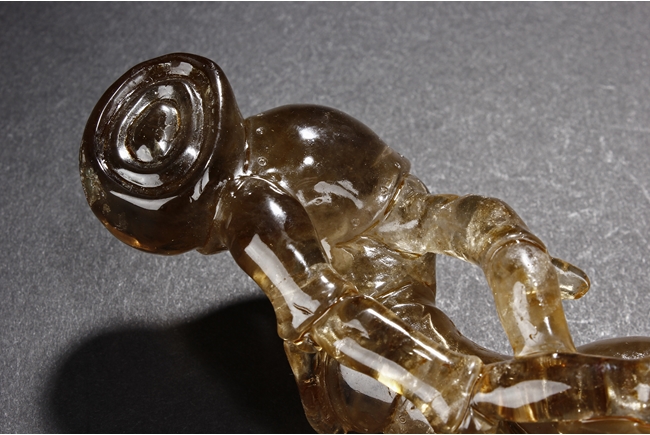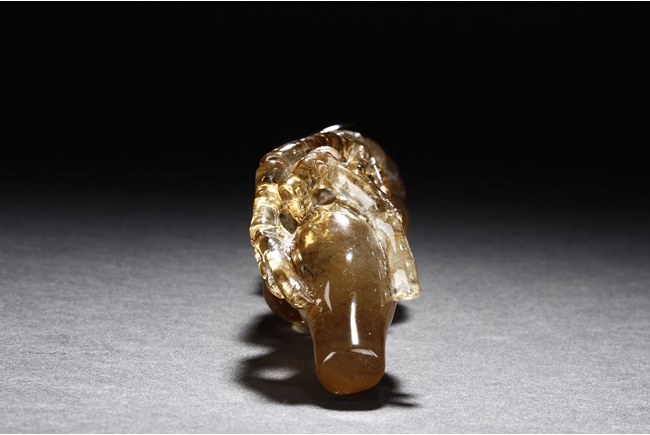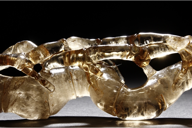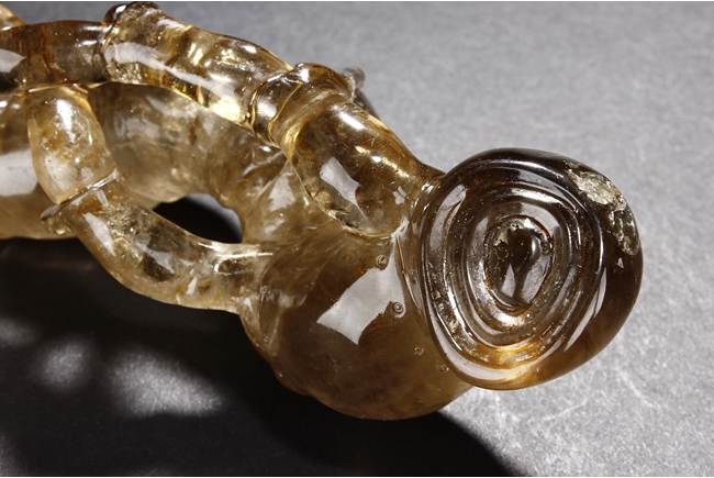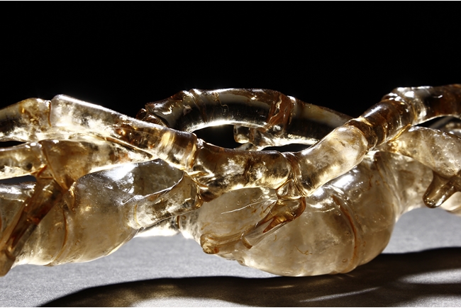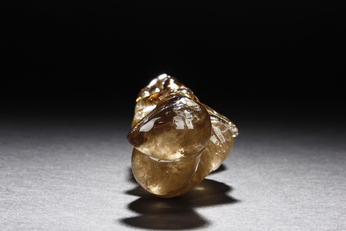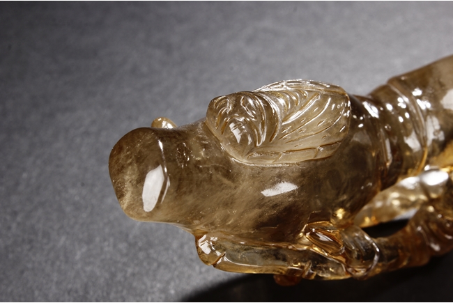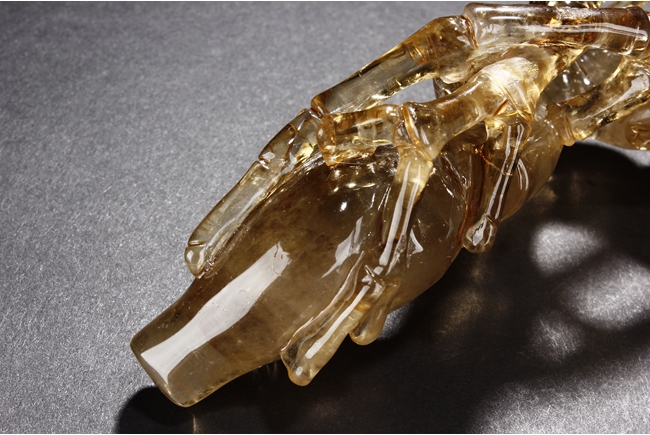 The brush rest made from yellow crystal, in the shape of intertwining bamboo branches, both old and new, to forming angled rest, a cicada rests on one end of brush rest. The color of grayish yellow tone with good translucency. Qing Dynasty period.