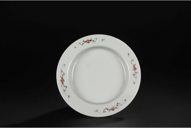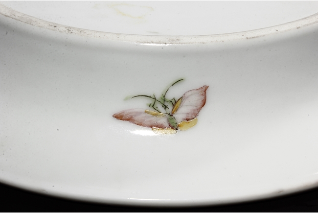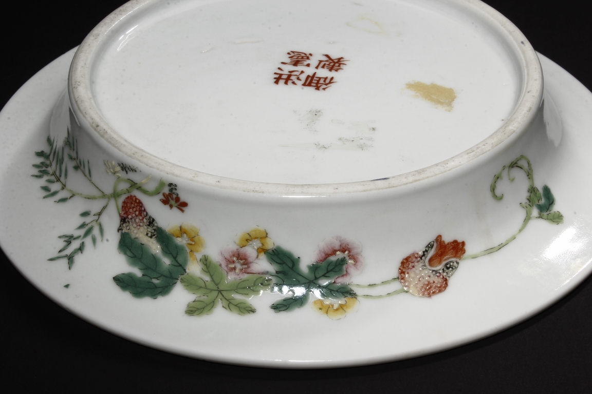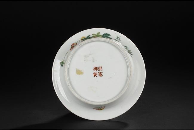The plate has everted rim, sharply tapering to a straight and shallow body, painted with colorful flowers and butterflies over white glaze, the bottom bears four character mark "HONGXIAN YUZHI". Republic period.