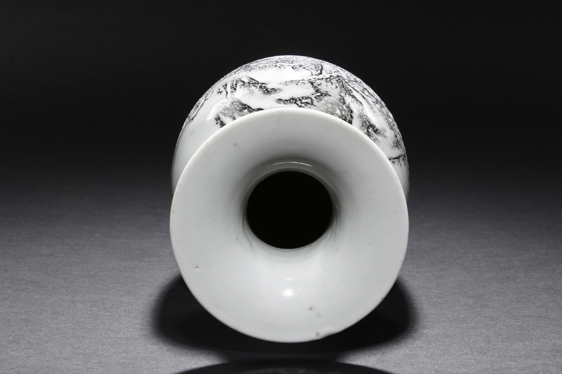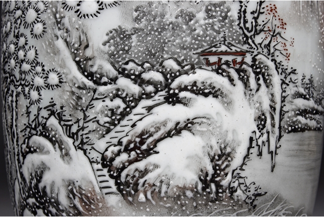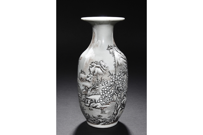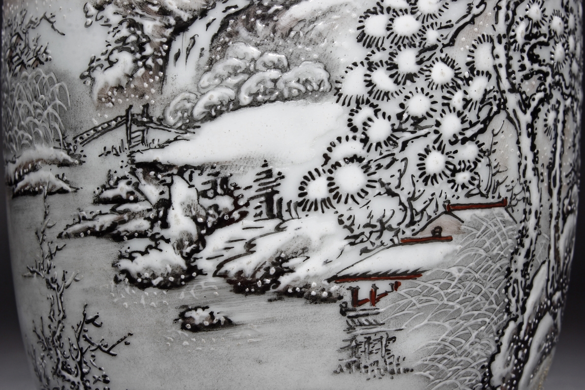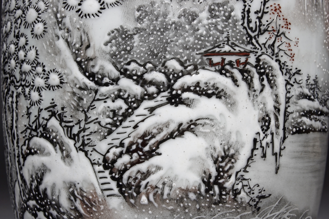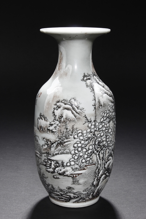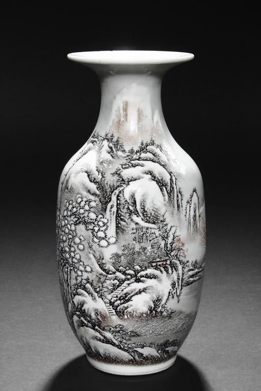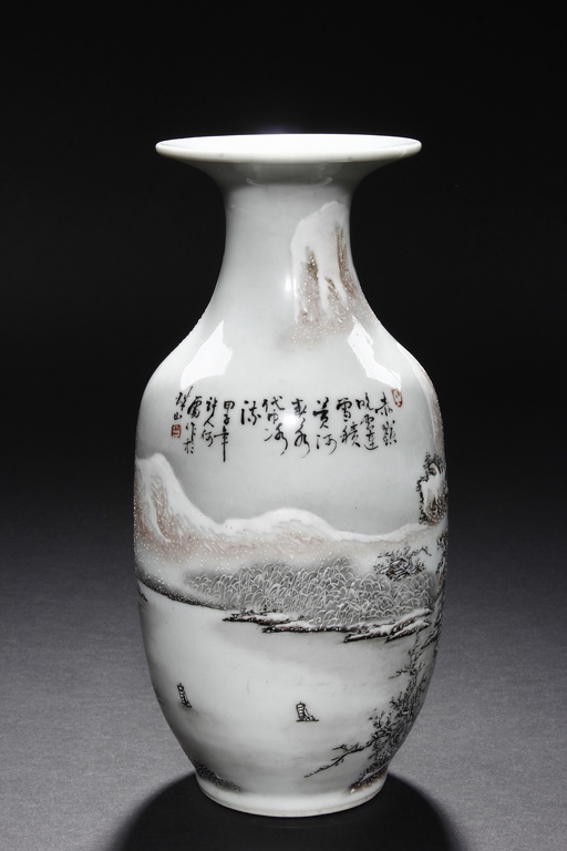 Of baluster form, the ovoid body grisaille painted on the front with snowy mountain and river scenery, the reverse with poem calligraphy, artist inscription and mark, the year corresponding to 1924, the bottom with six character "JIANGXI CIYE GONGSI" mark. Republic period.