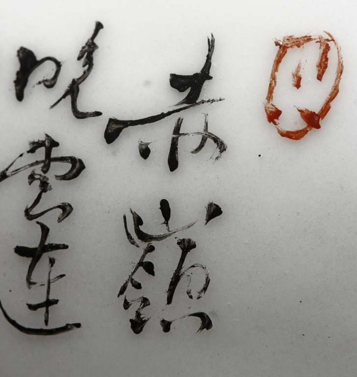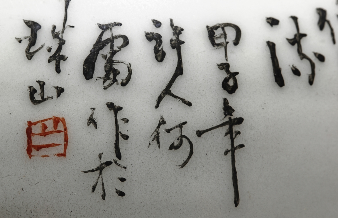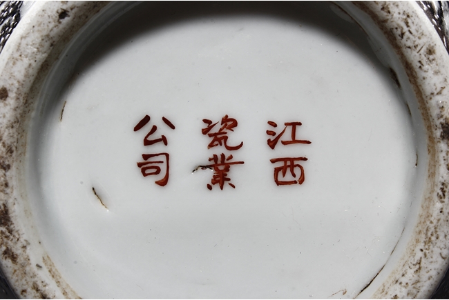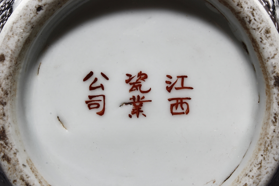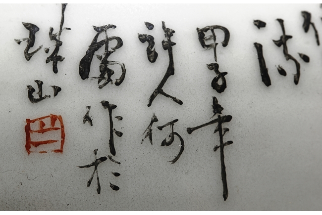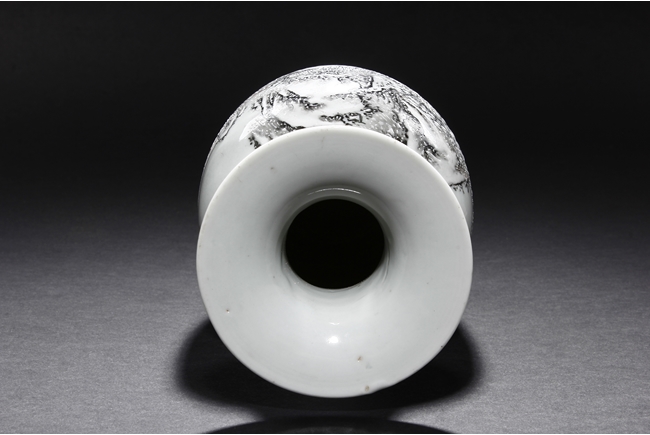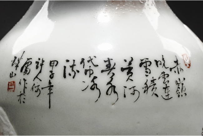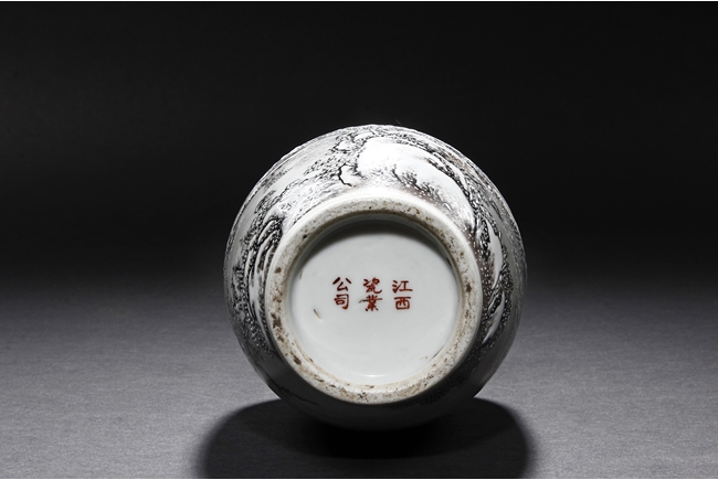 Of baluster form, the ovoid body grisaille painted on the front with snowy mountain and river scenery, the reverse with poem calligraphy, artist inscription and mark, the year corresponding to 1924, the bottom with six character "JIANGXI CIYE GONGSI" mark. Republic period.